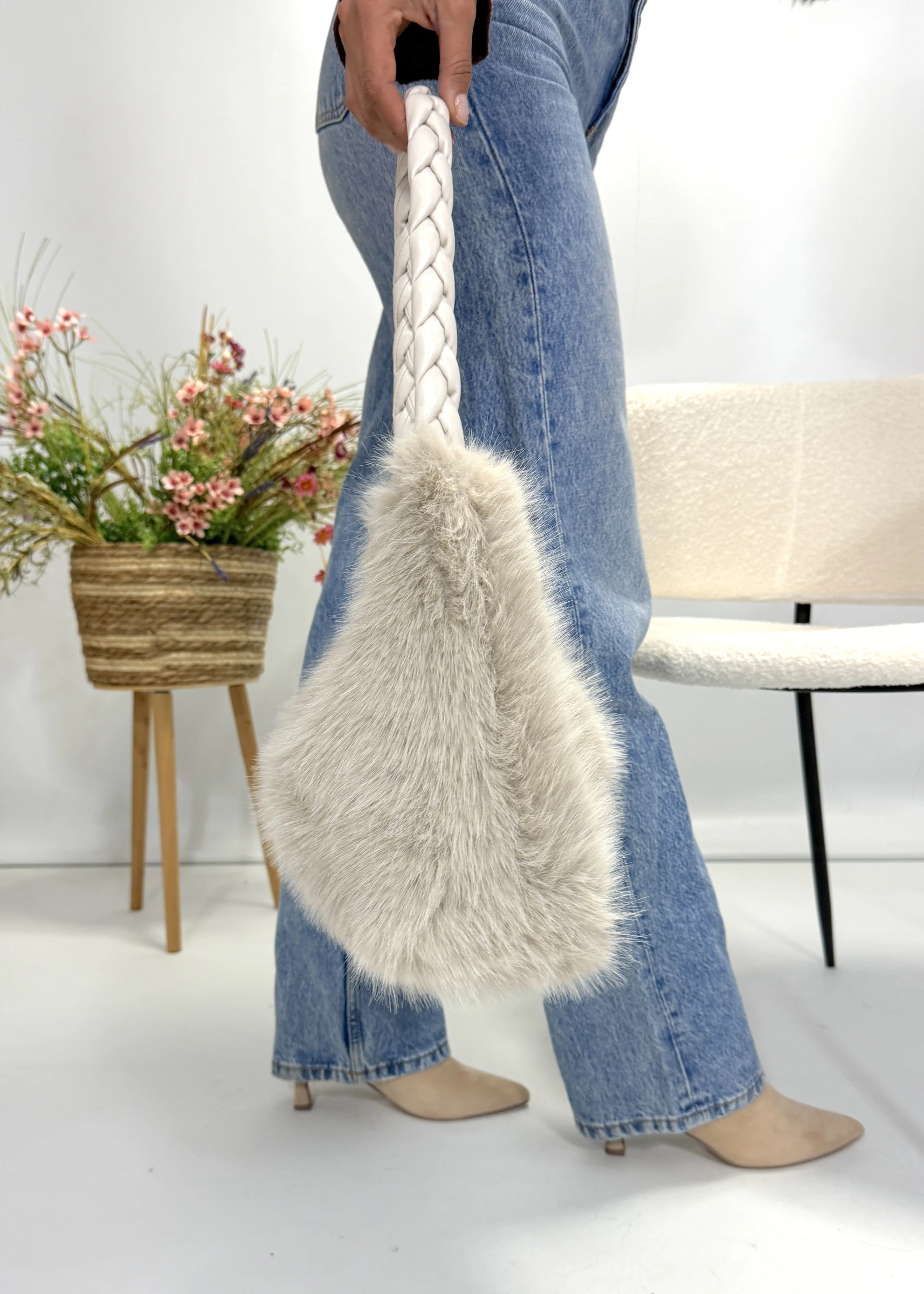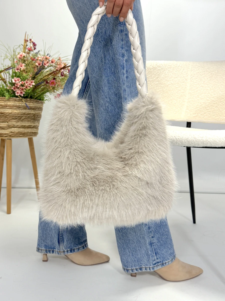Bolso efecto pelo en beige claro con asa trenzada. Un toque cálido y sofisticado que transforma cualquier look con textura y estilo.