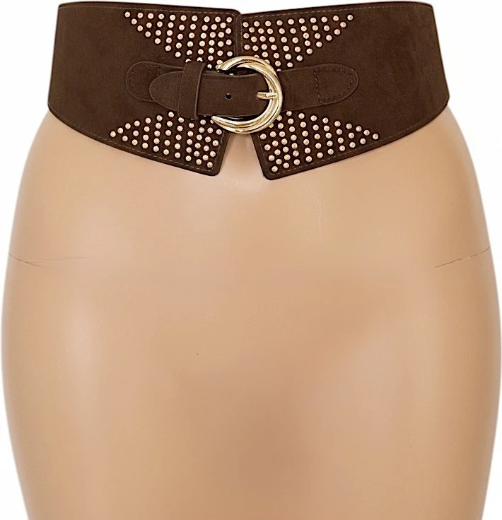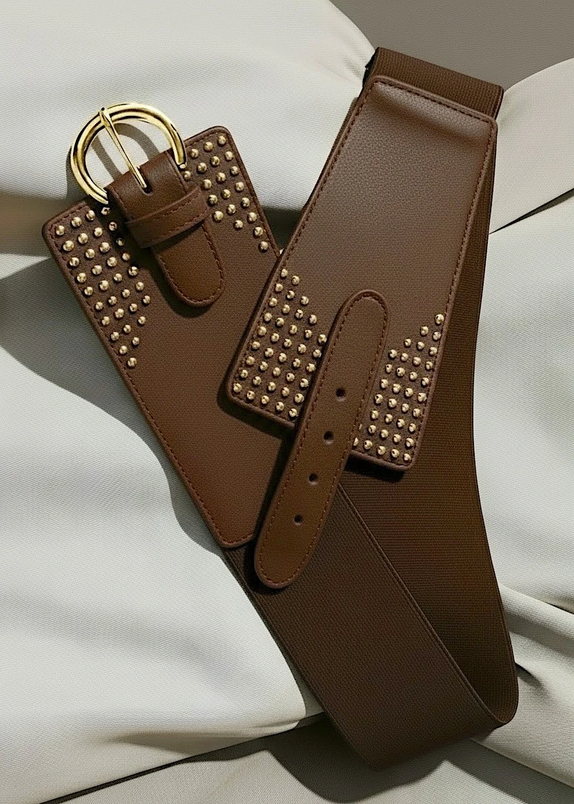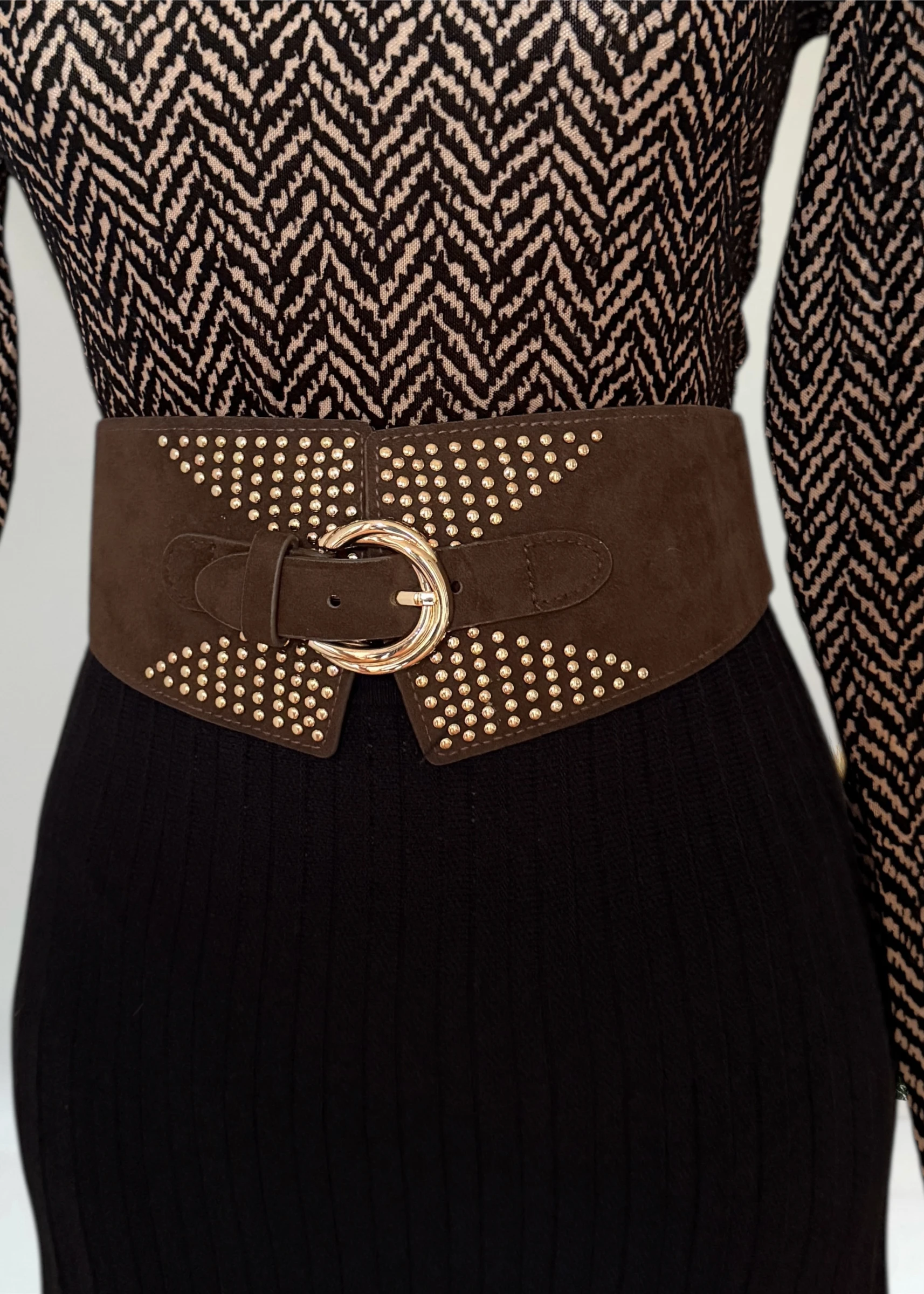 Cinturón ancho en color marrón chocolate con tachuelas y hebilla dorada. Realza tu cintura con un toque sofisticado