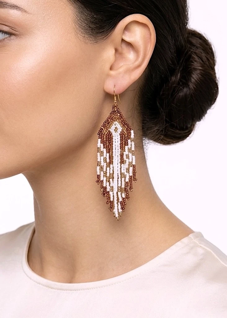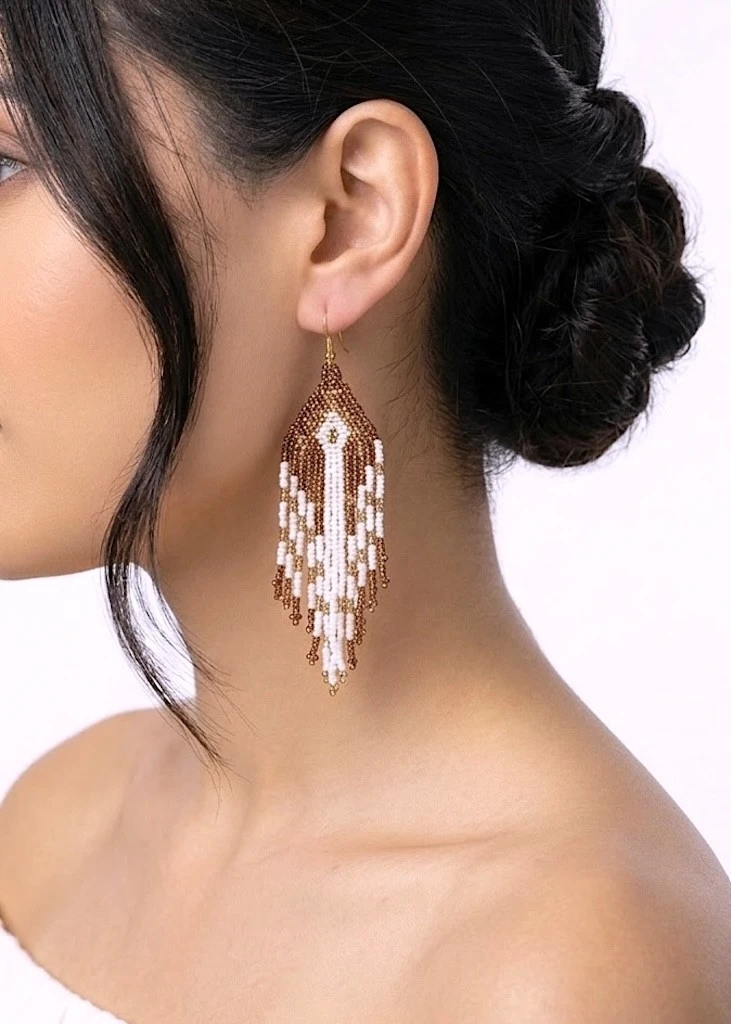 Pendientes largos de cuentas con un diseño geométrico que combina tonos tierra y blanco, creando un contraste elegante y muy favorecedor.