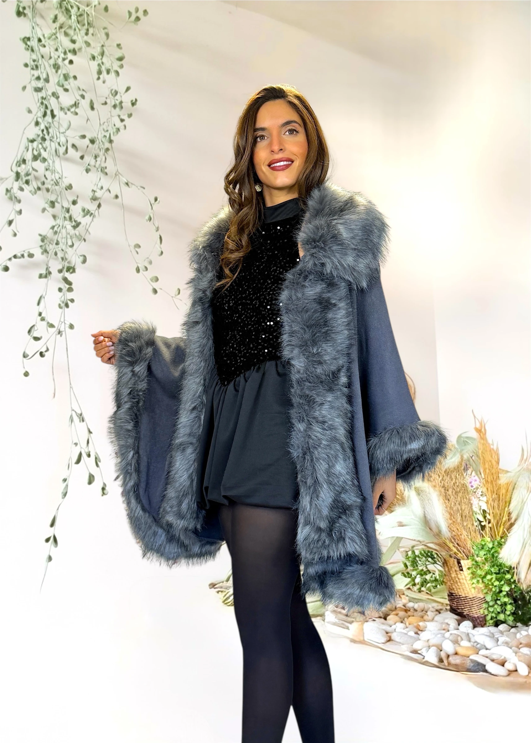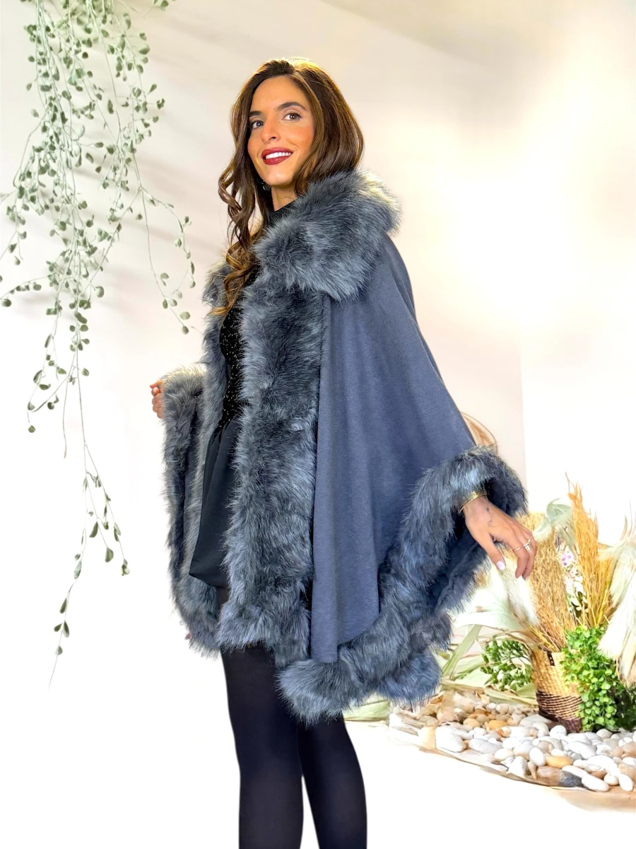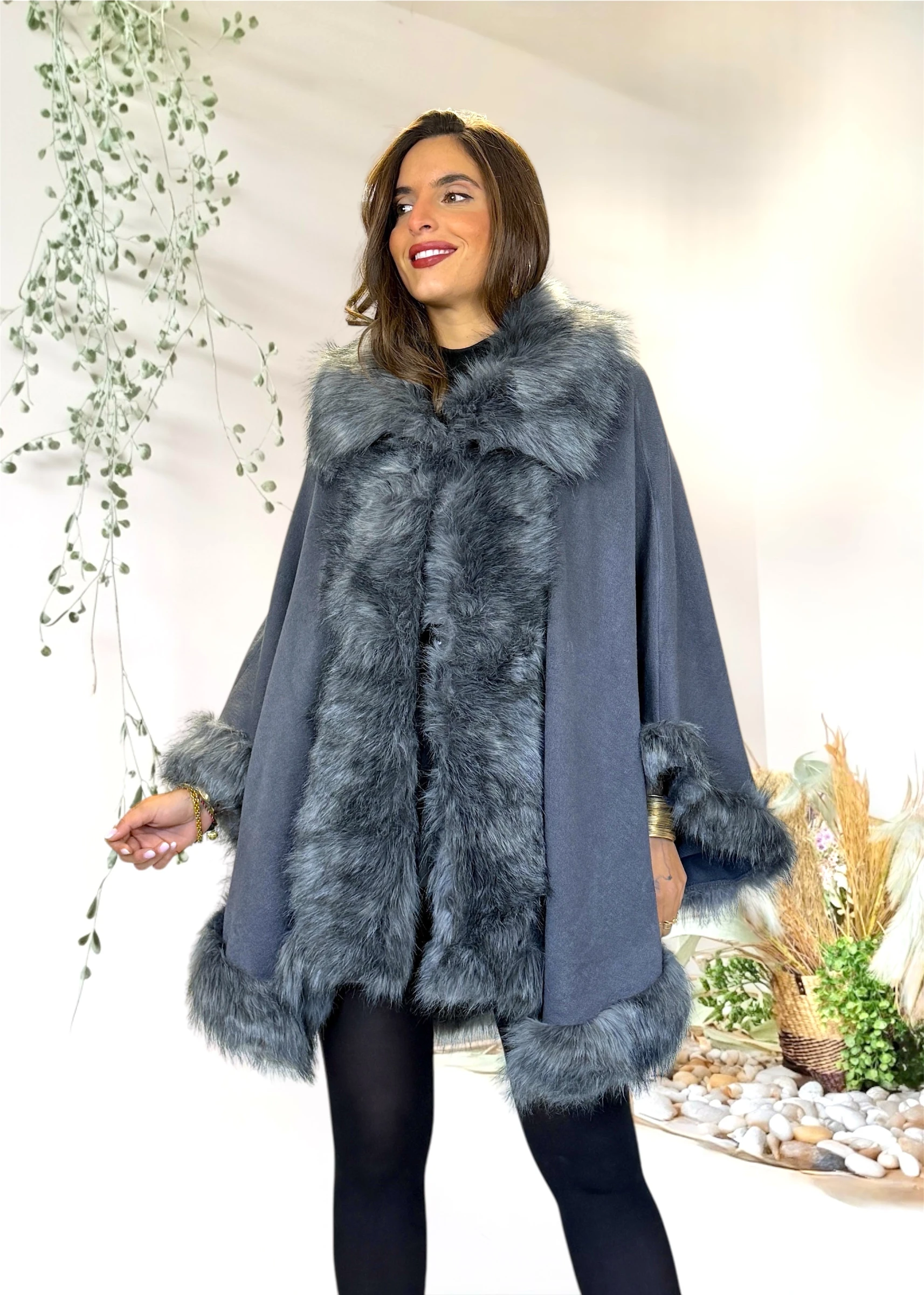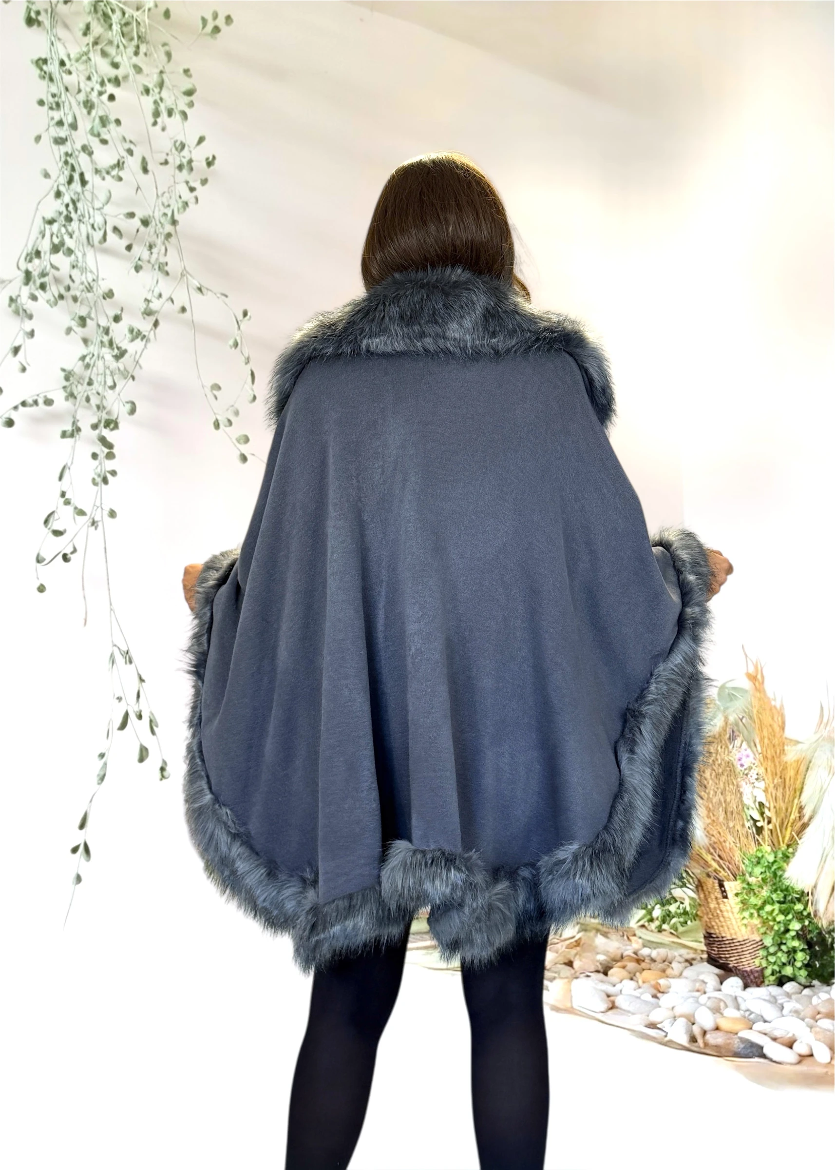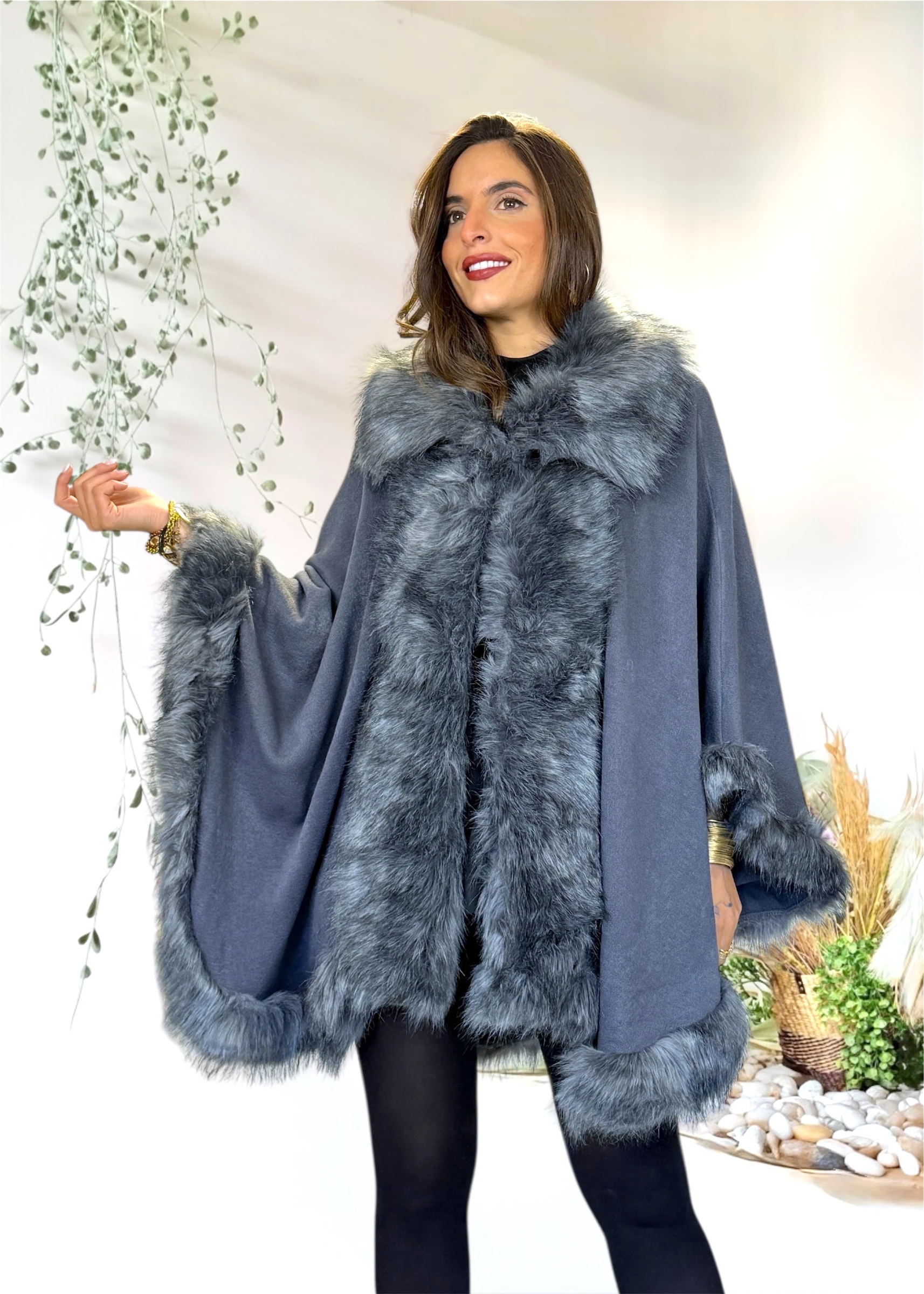 Capa gris de punto grueso, con ribete de pelo suave. Un toque sofisticado y cálido para combinar con cualquier look de invierno.