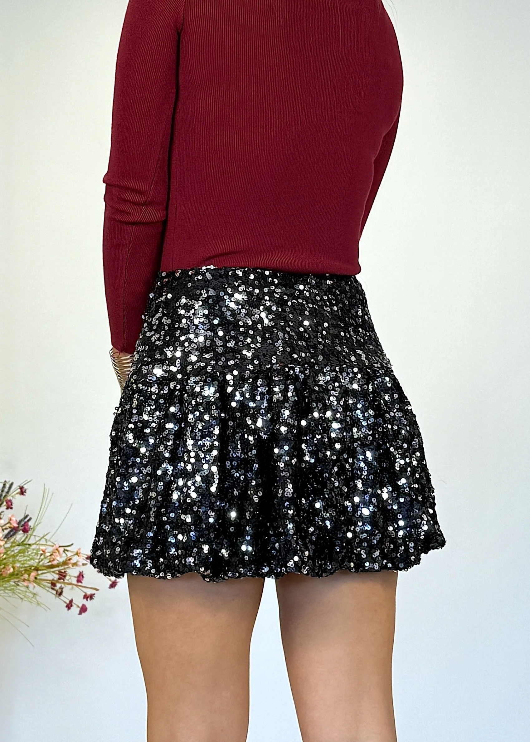 Falda globo de lentejuelas negras con brillo intenso y caída con volumen. Ideal para destacar en eventos con un look sofisticado y dinámico.