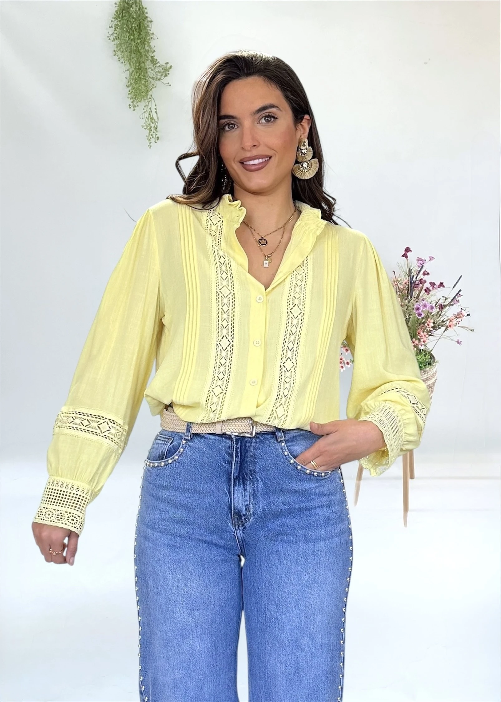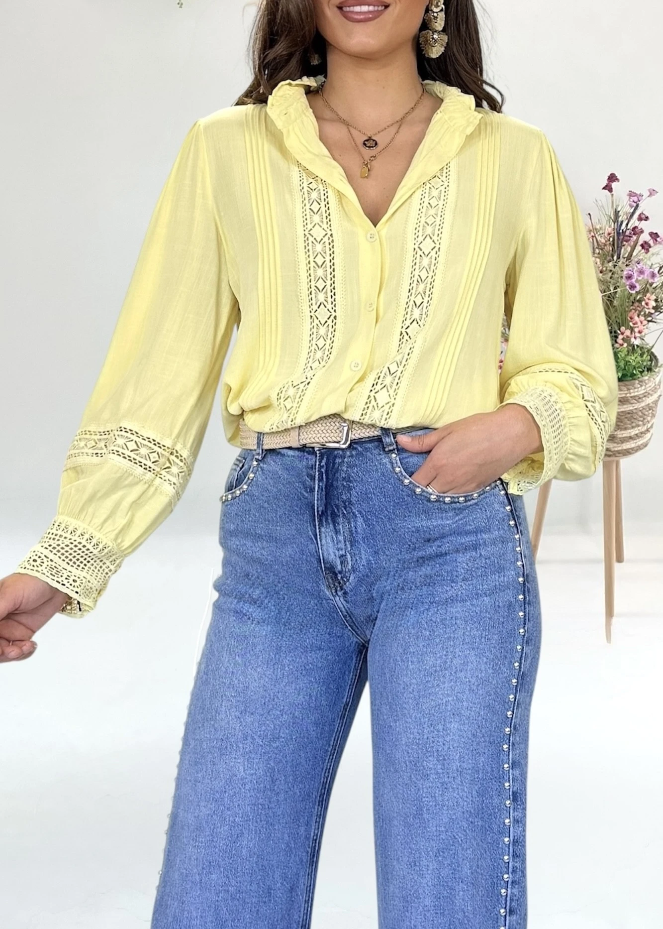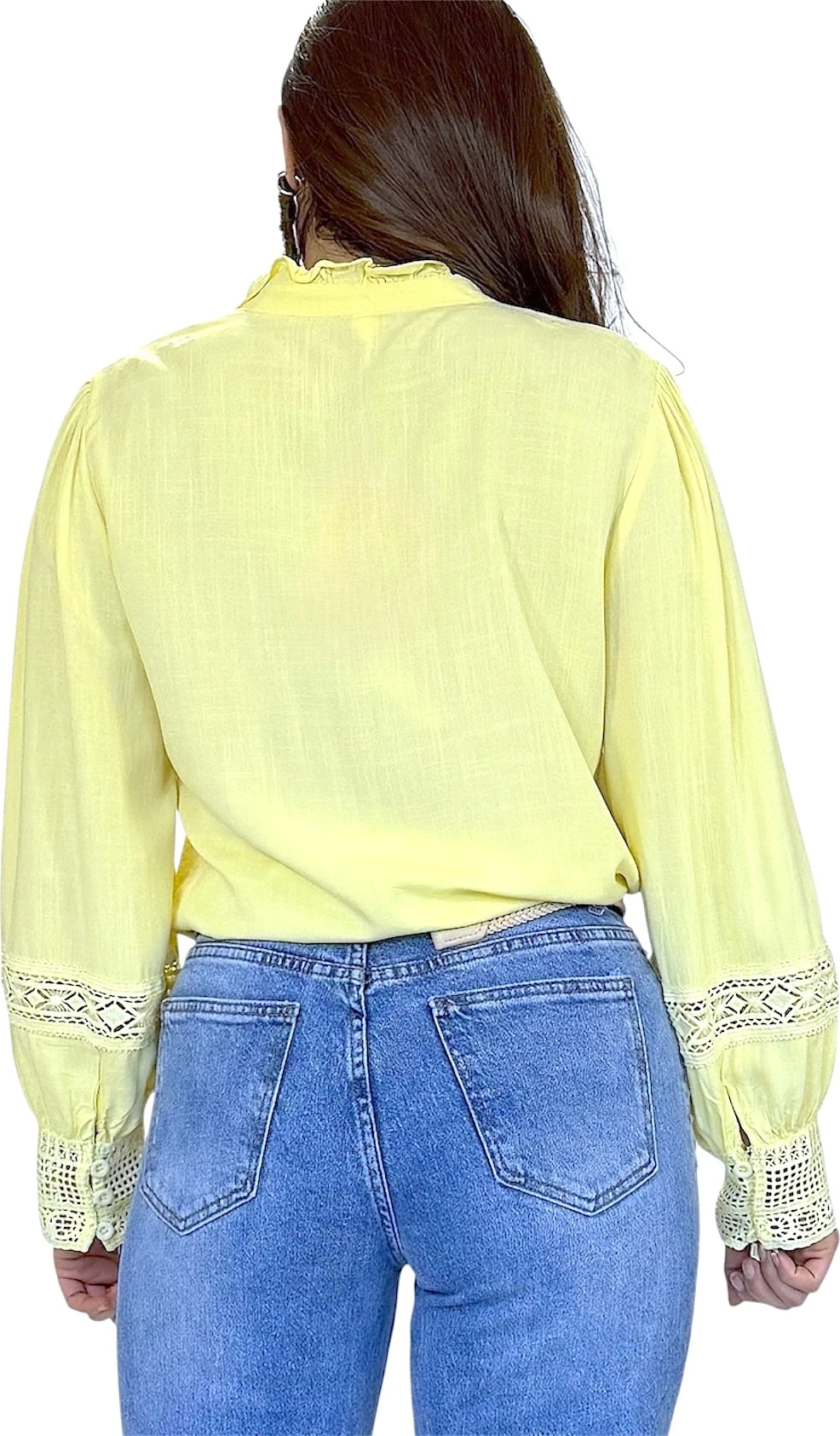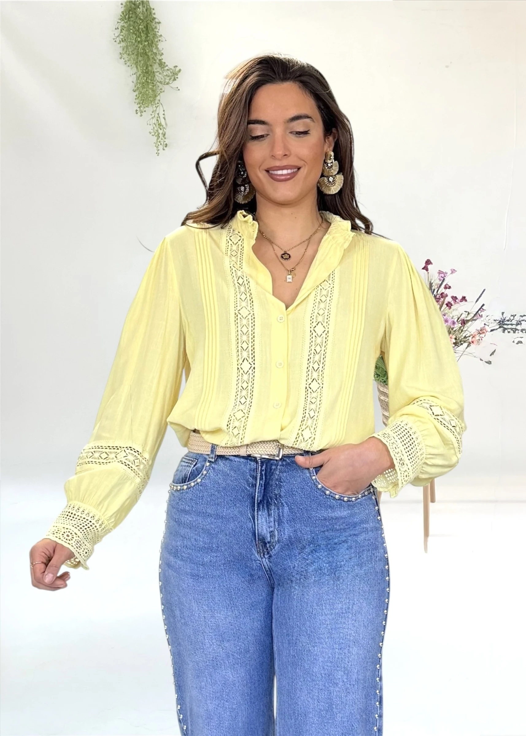 Blusa con cintas bordadas y delicados detalles calados que aportan un aire romántico y femenino. Su tono amarillo suave ilumina el rostro y añade frescura a cualquier conjunto.