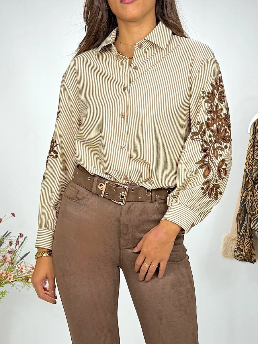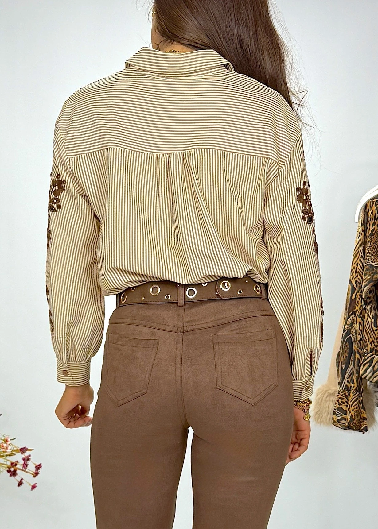 Camisa de rayas beige y marrón con bordado en mangas. Corte recto y fluido, aire otoñal y confort gracias al toque de elastano.