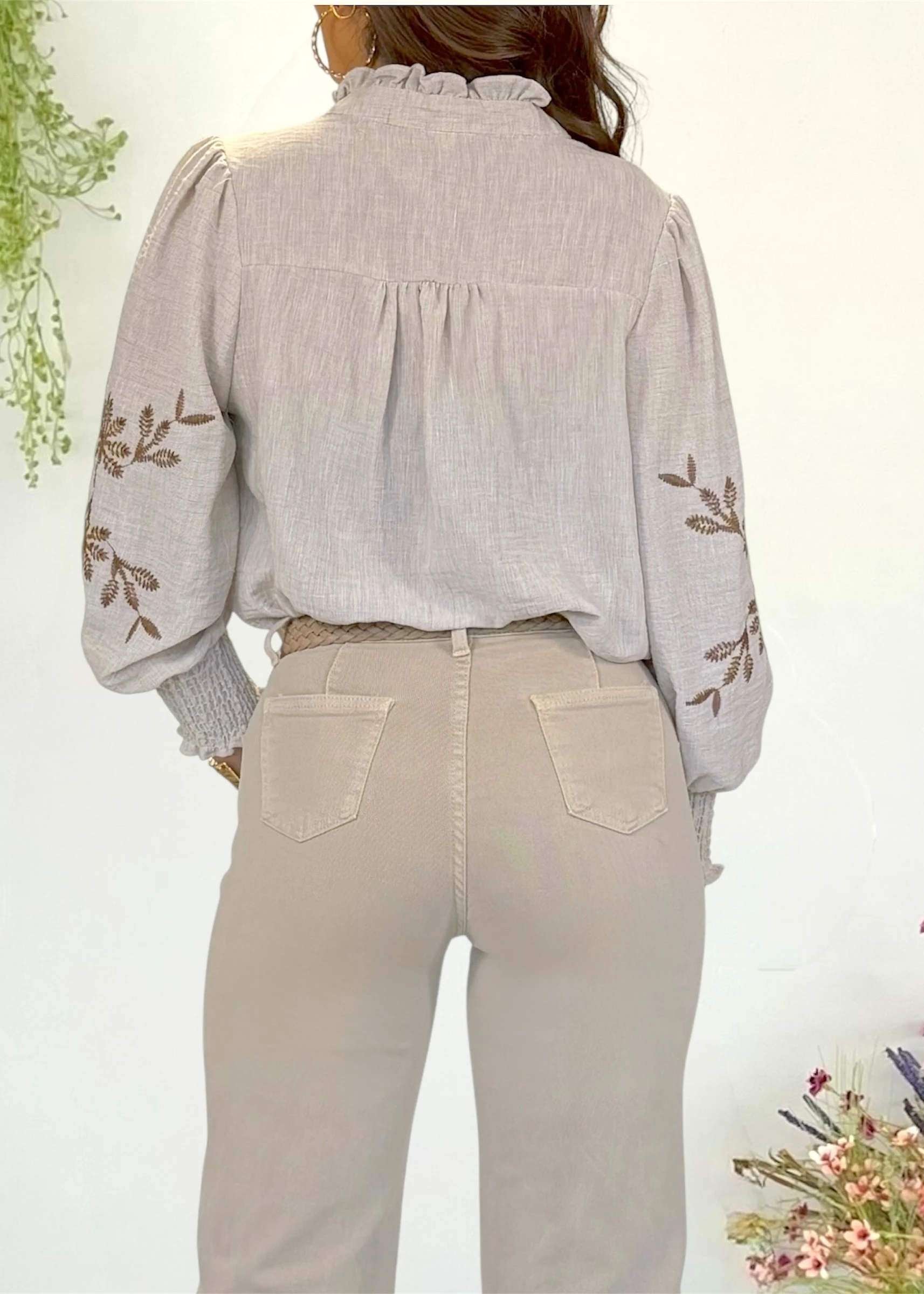 Blusa beige con bordados marrones en la zona delantera y en mangas. Cuello mao y mangas abullonadas con elástico