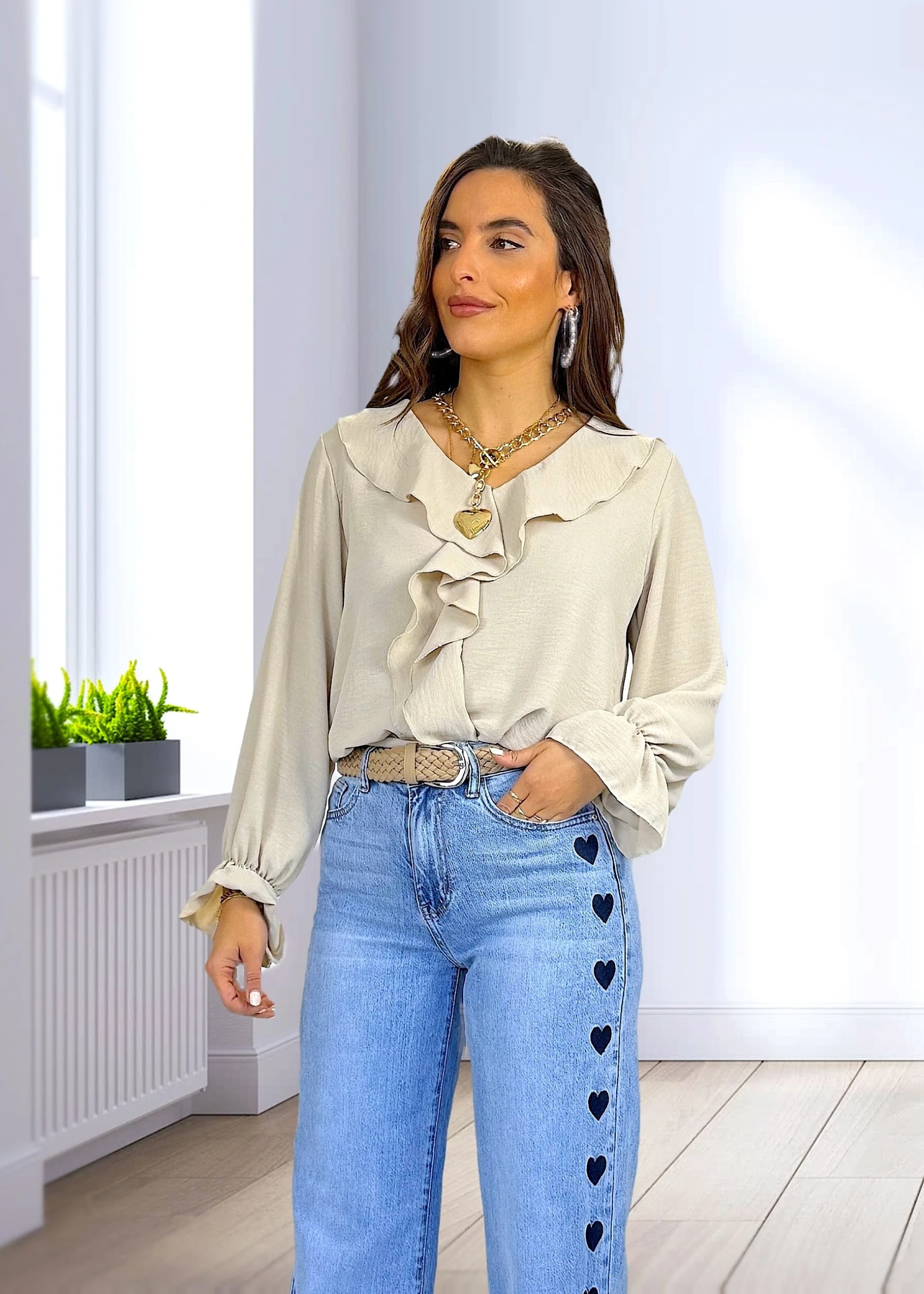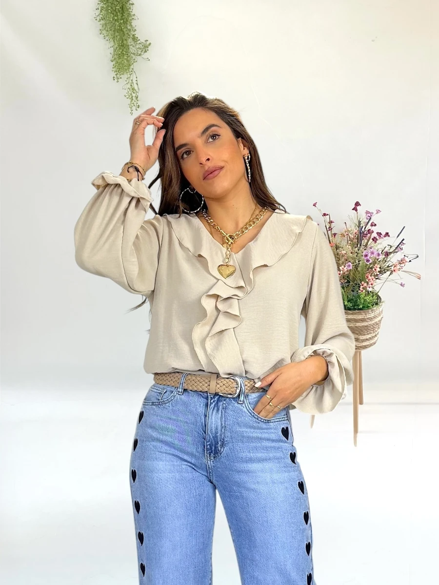 Blusa beige de tejido fluido con escote pico estructurado y aplicación de volantes. Manga larga con volumen y puño fruncido elástico.