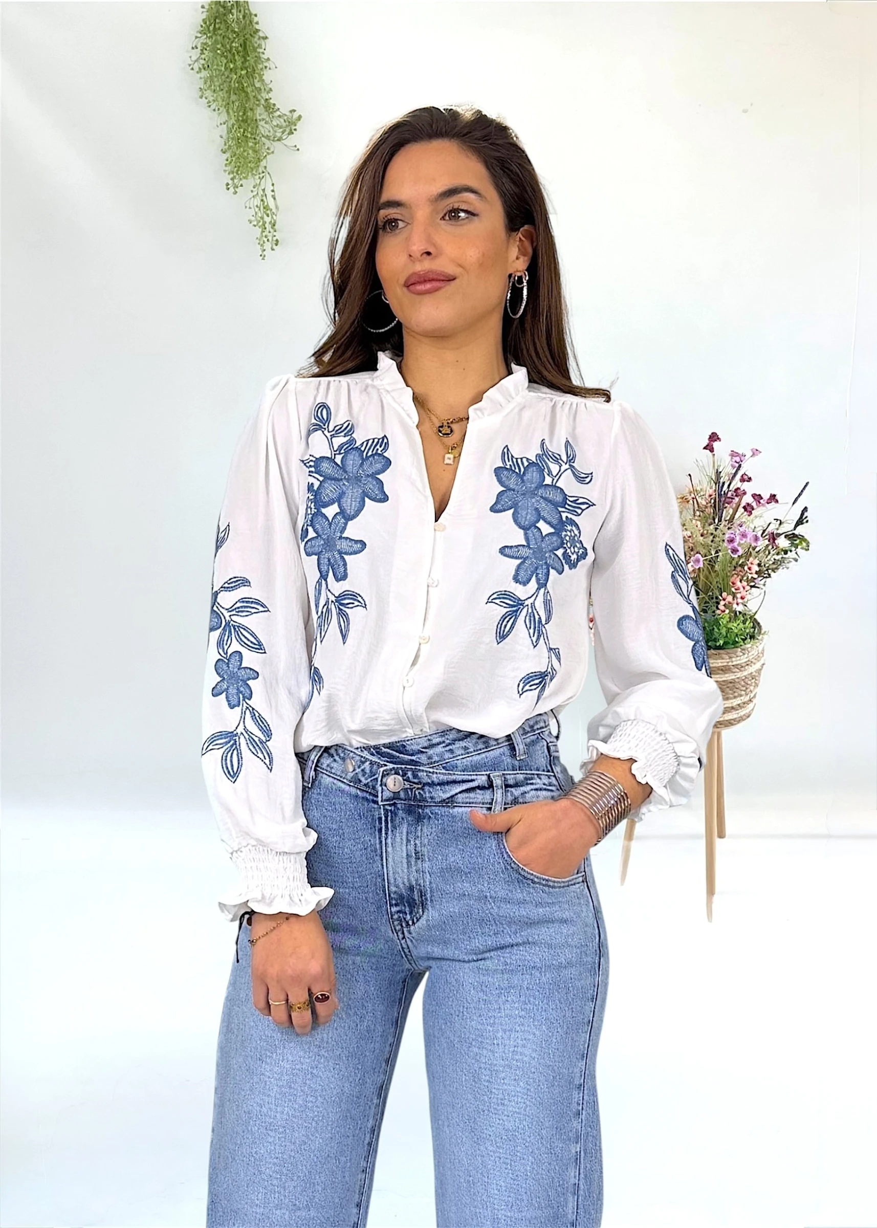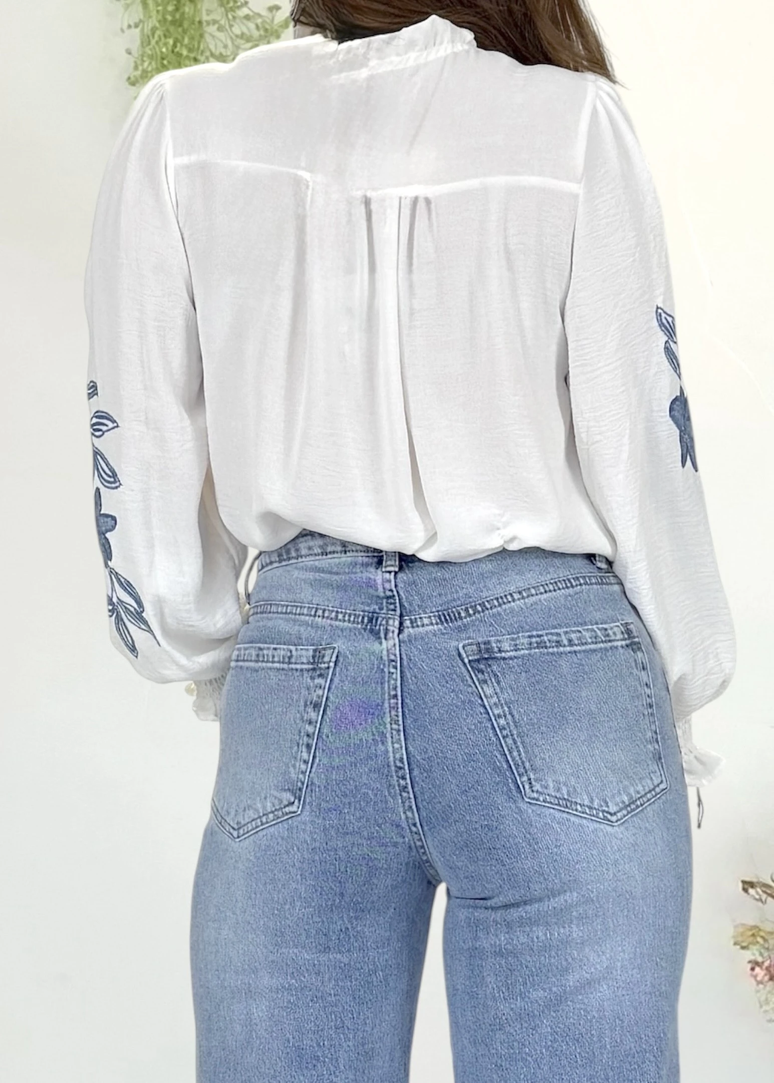 Blusa blanca con bordados azules y mangas abullonadas con puño elástico ancho que aporta volumen y un acabado con mucho estilo