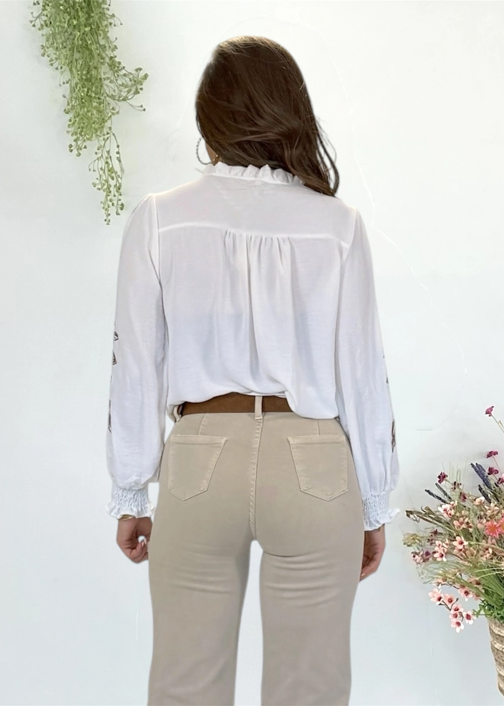 Blusa blanca con bordados marrones y mangas abullonadas con puño elástico ancho que aporta volumen y un acabado con mucho estilo