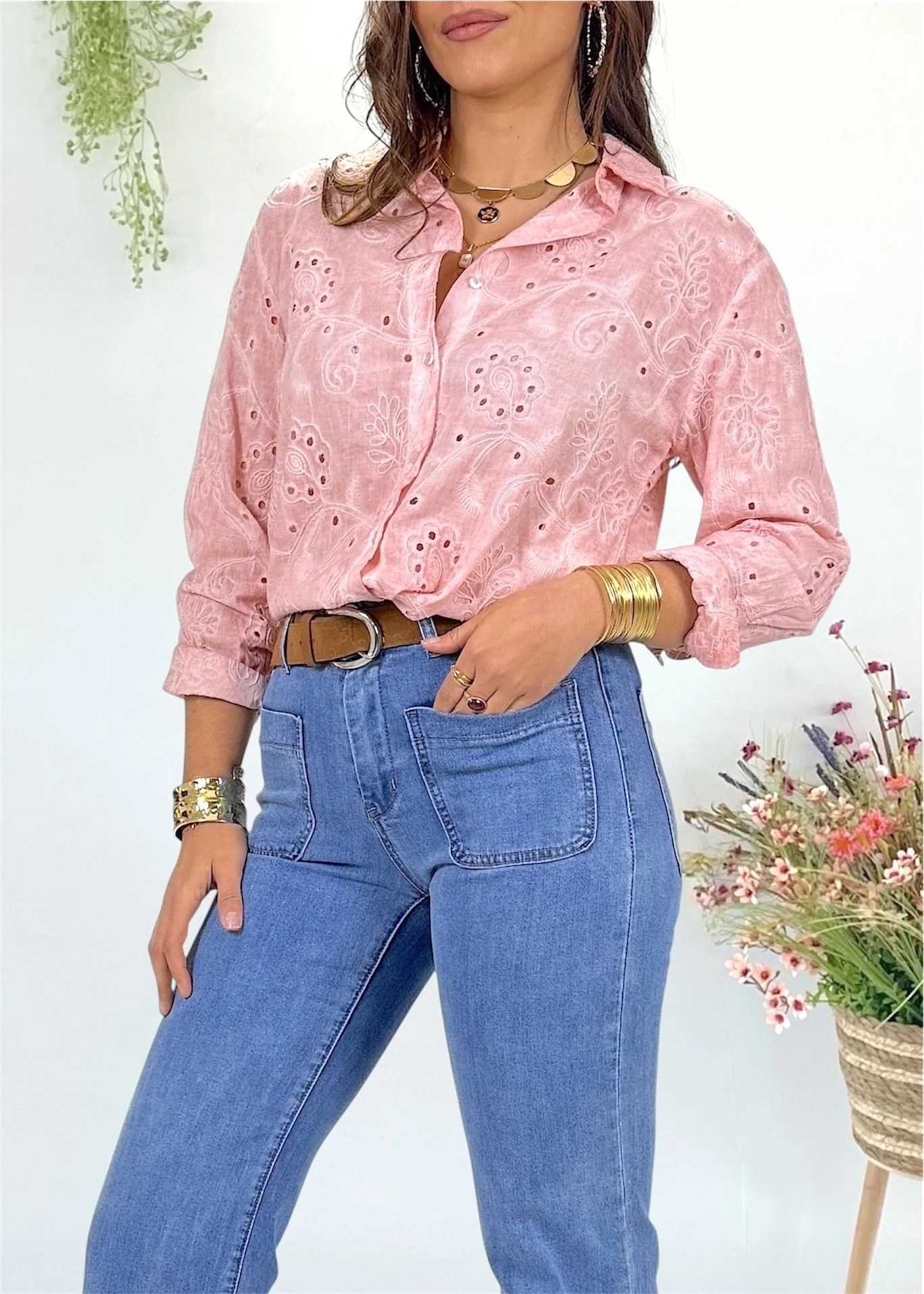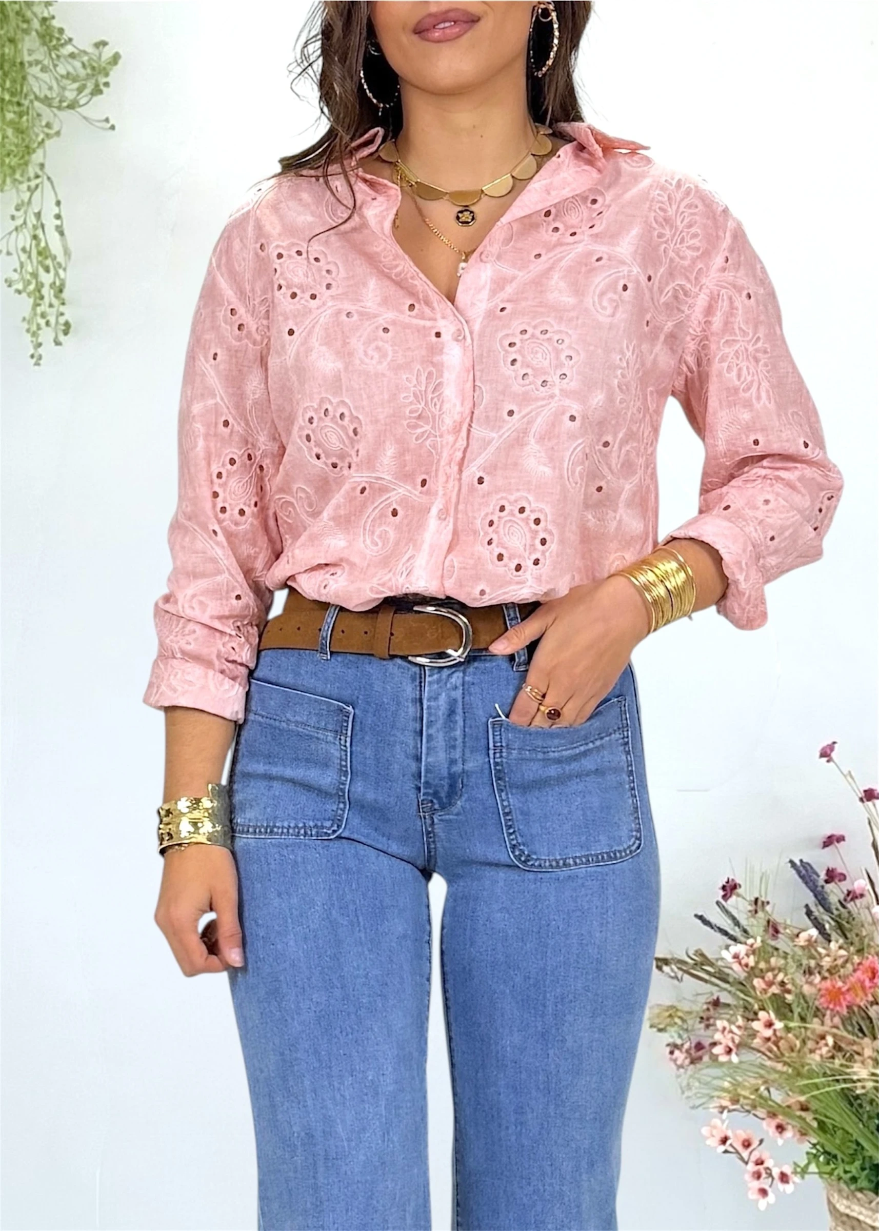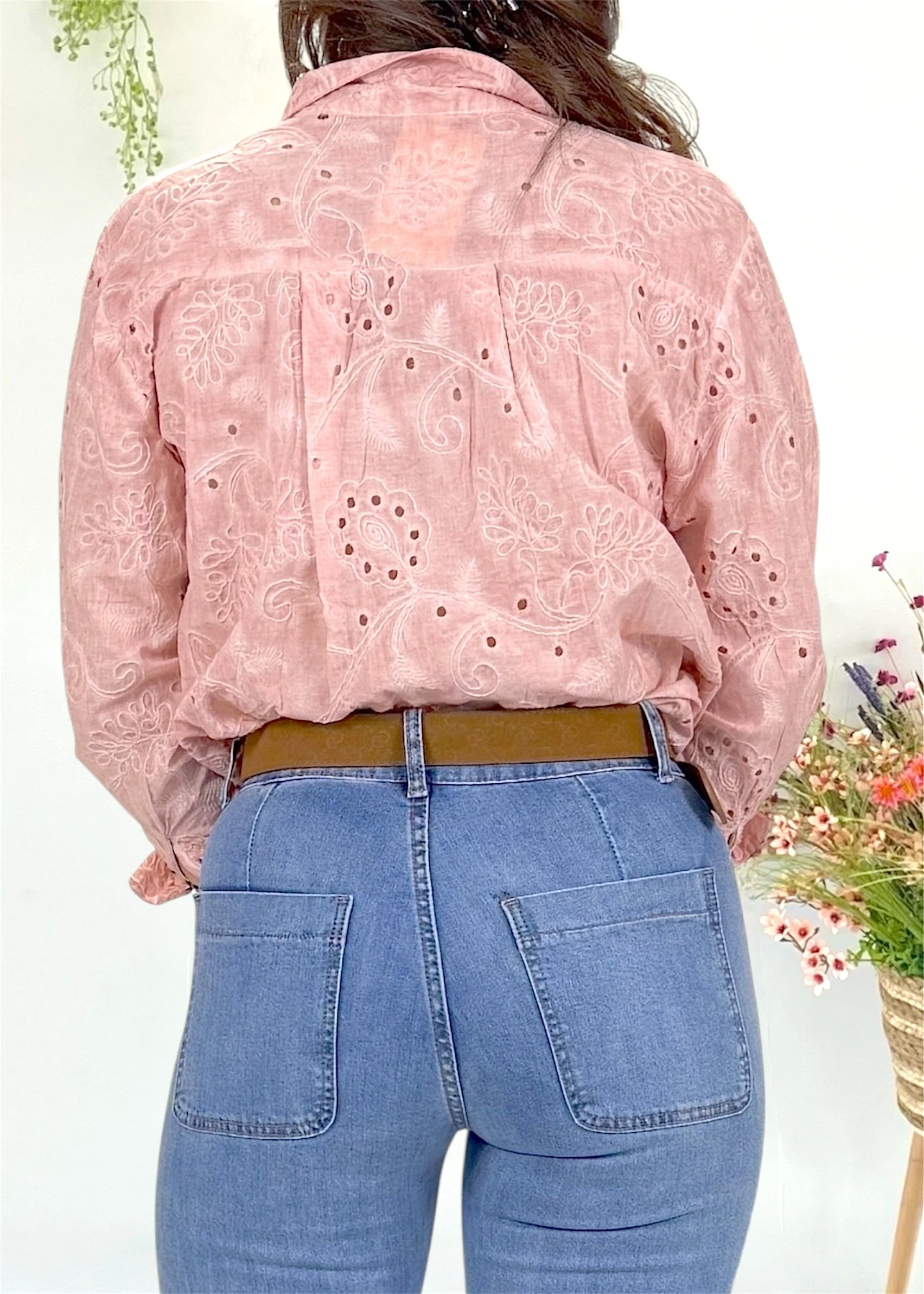 Blusa rosa efecto lavado envejecido con delicados bordados al tono que aportan textura y un acabado artesanal muy especial.