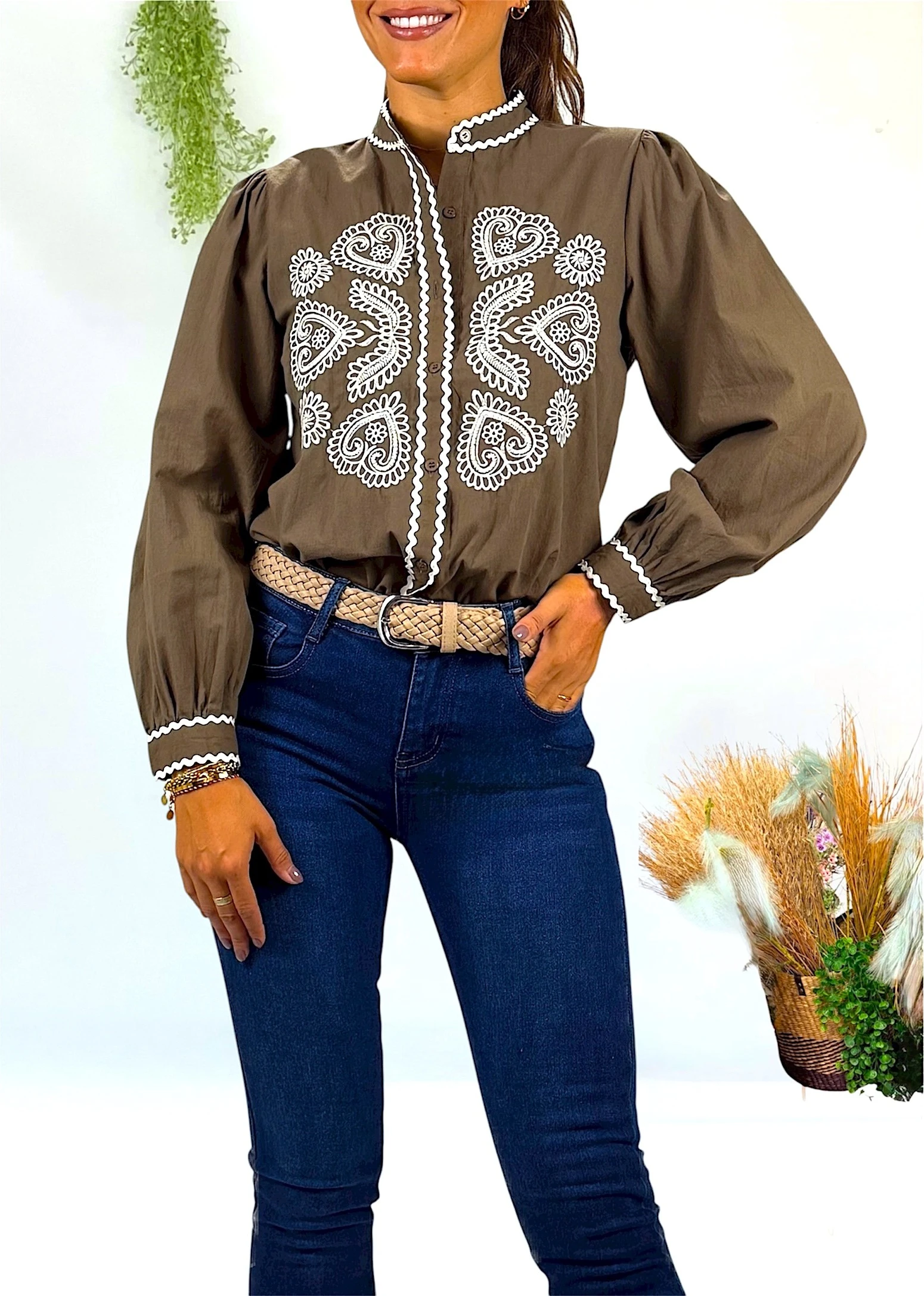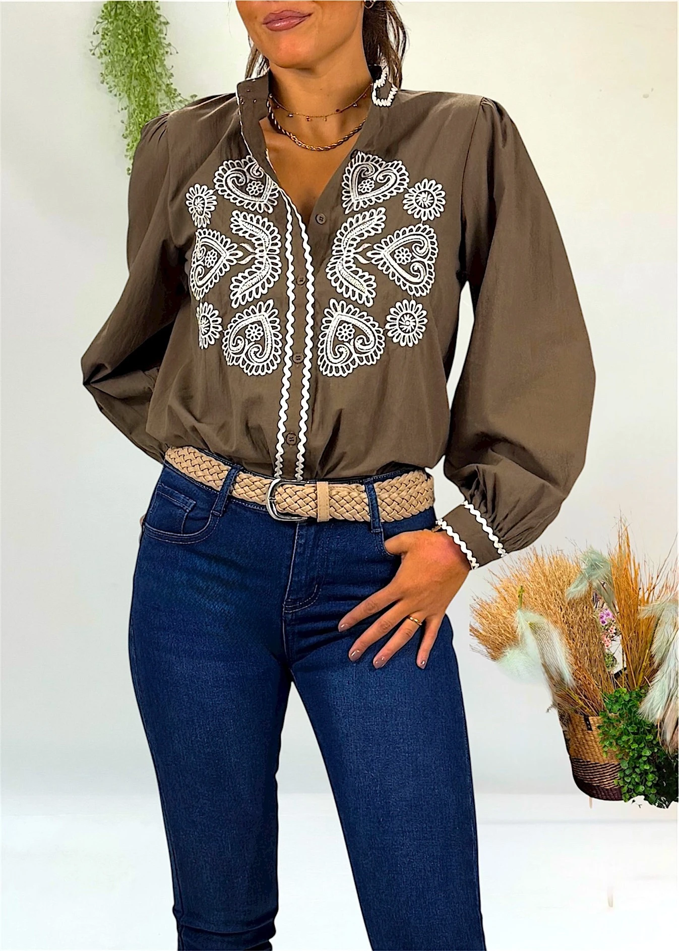 Blusa marrón con bordados blanco roto y cuello mao. Un diseño boho con encanto artesanal que realza tu estilo con elegancia natural.