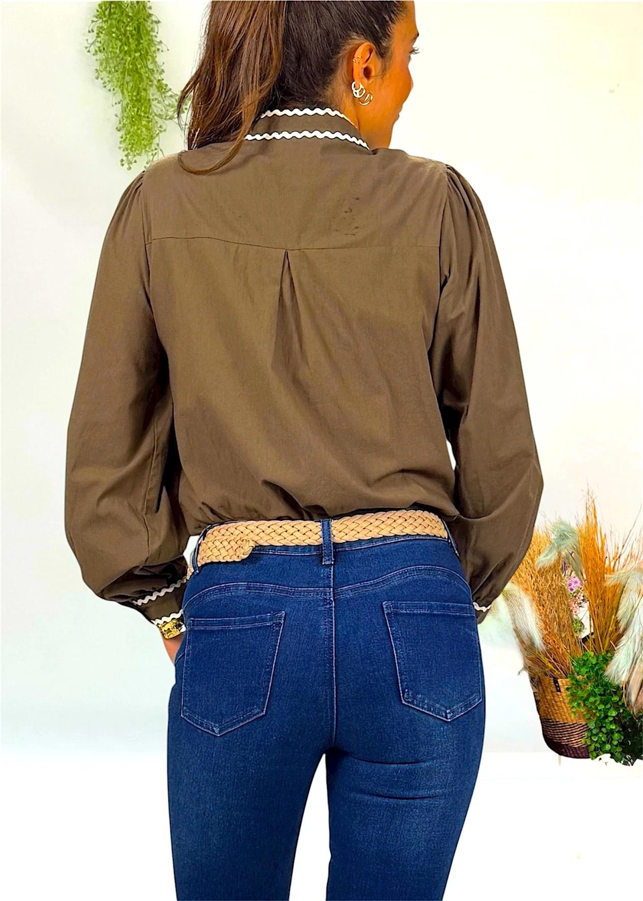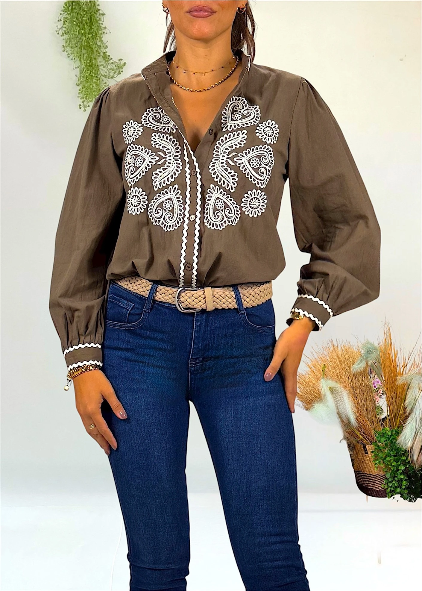 Blusa marrón con bordado blanco roto que combina artesanía y estilo en una prenda atemporal de inspiración boho.