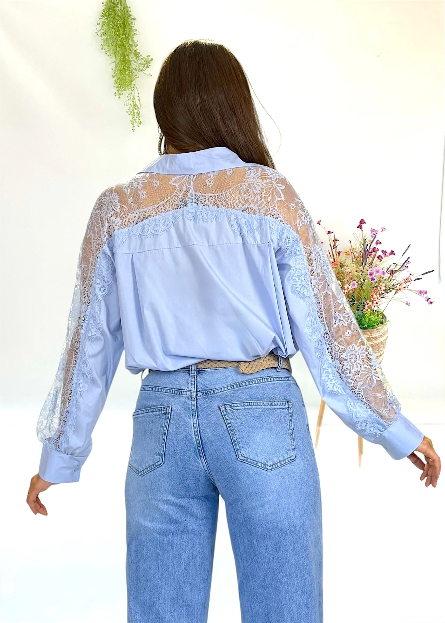 Blusa azul celeste con detalles de encaje en mangas y espalda.