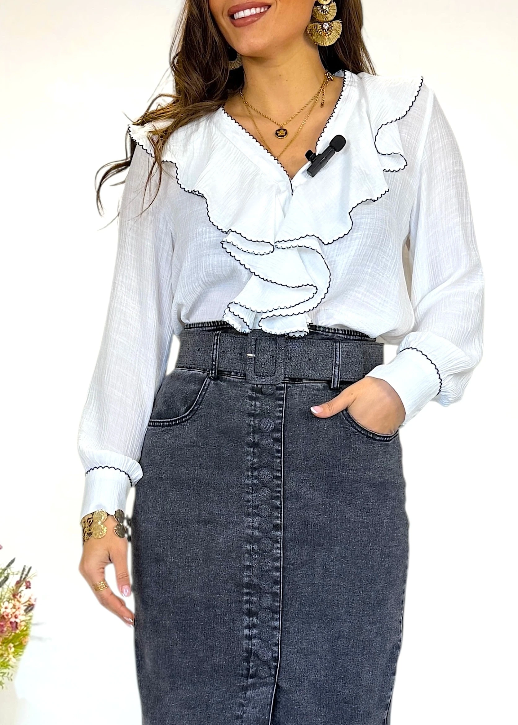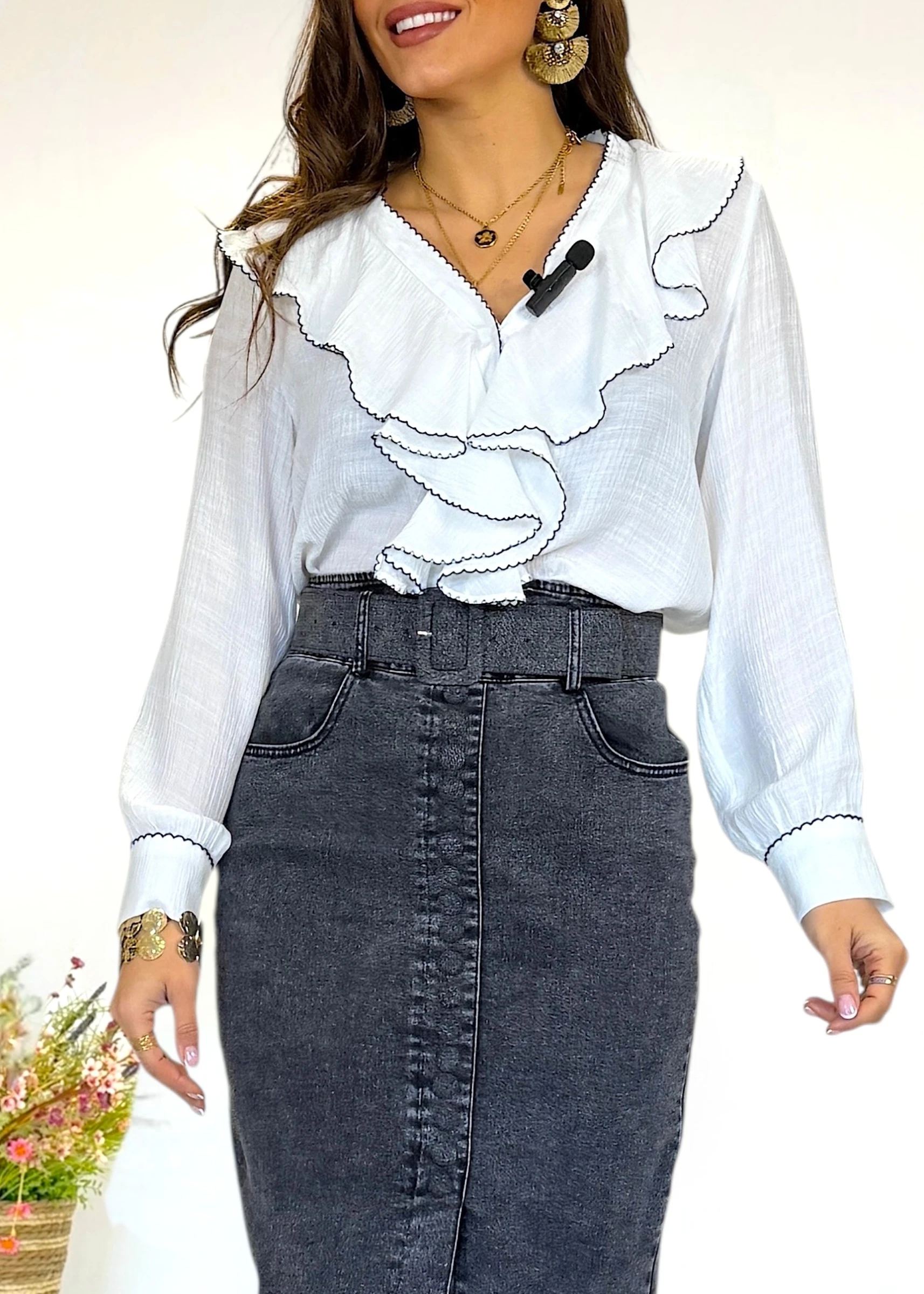 Blusa blanca con volantes terminados con detalles bordados. Cuello pico con botones frontales. Elegante, femenina y versátil. Tallas S, M y L.