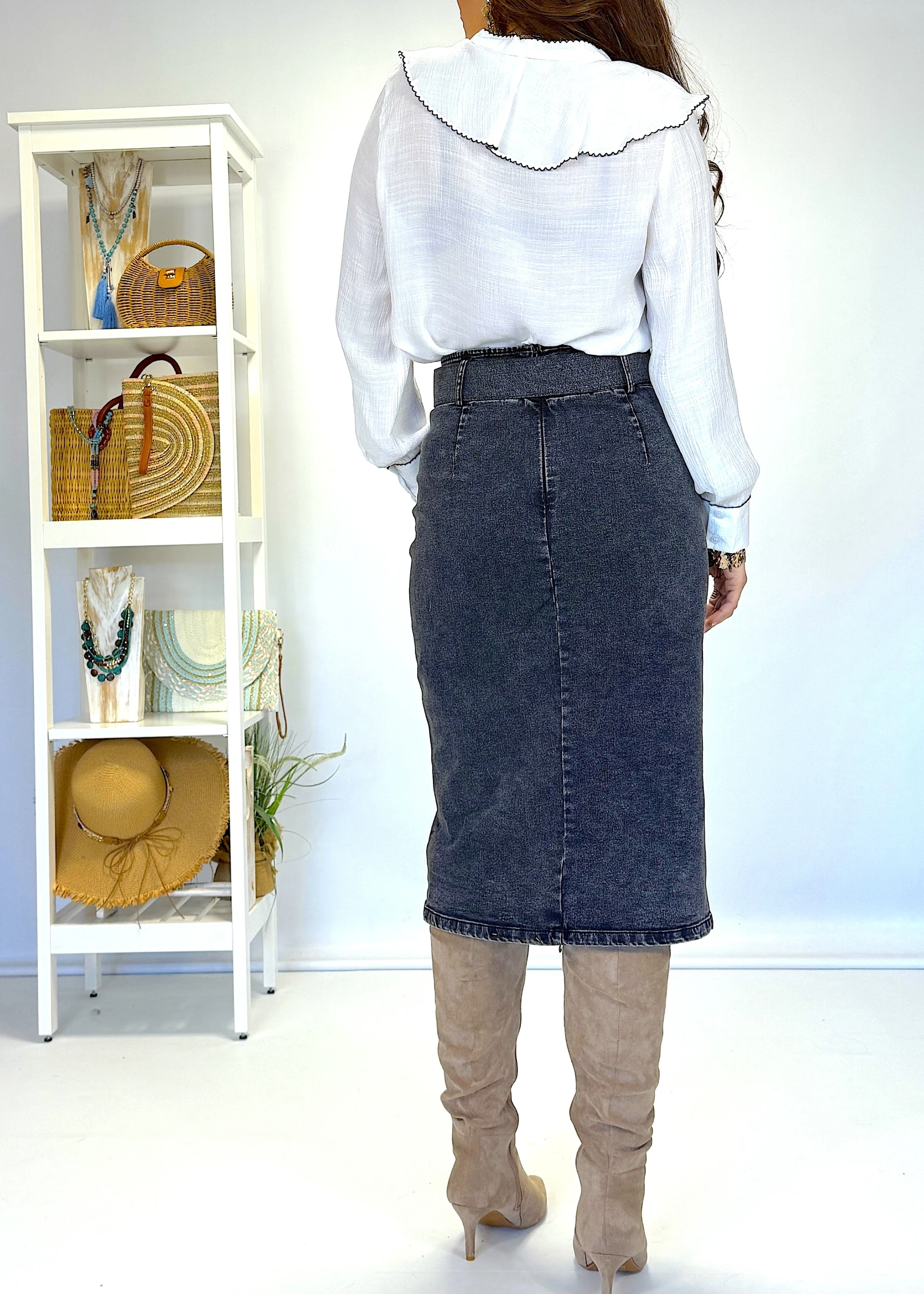 Blusa fluida en color azul con diseño romántico y femenino. Presenta un elegante volante frontal terminado en fino bordado blanco, cuello pico y cierre con botones delanteros.