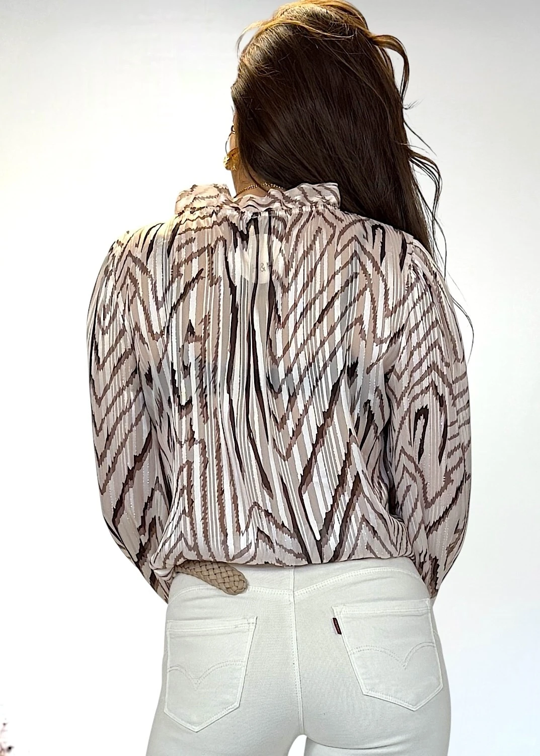Blusa de gasa beige con estampado marrón, escote pico con volante, mangas semitransparentes y puños elásticos.