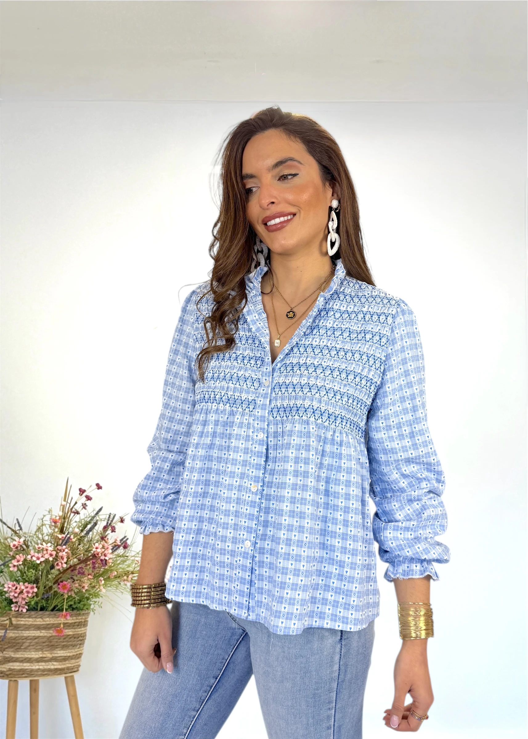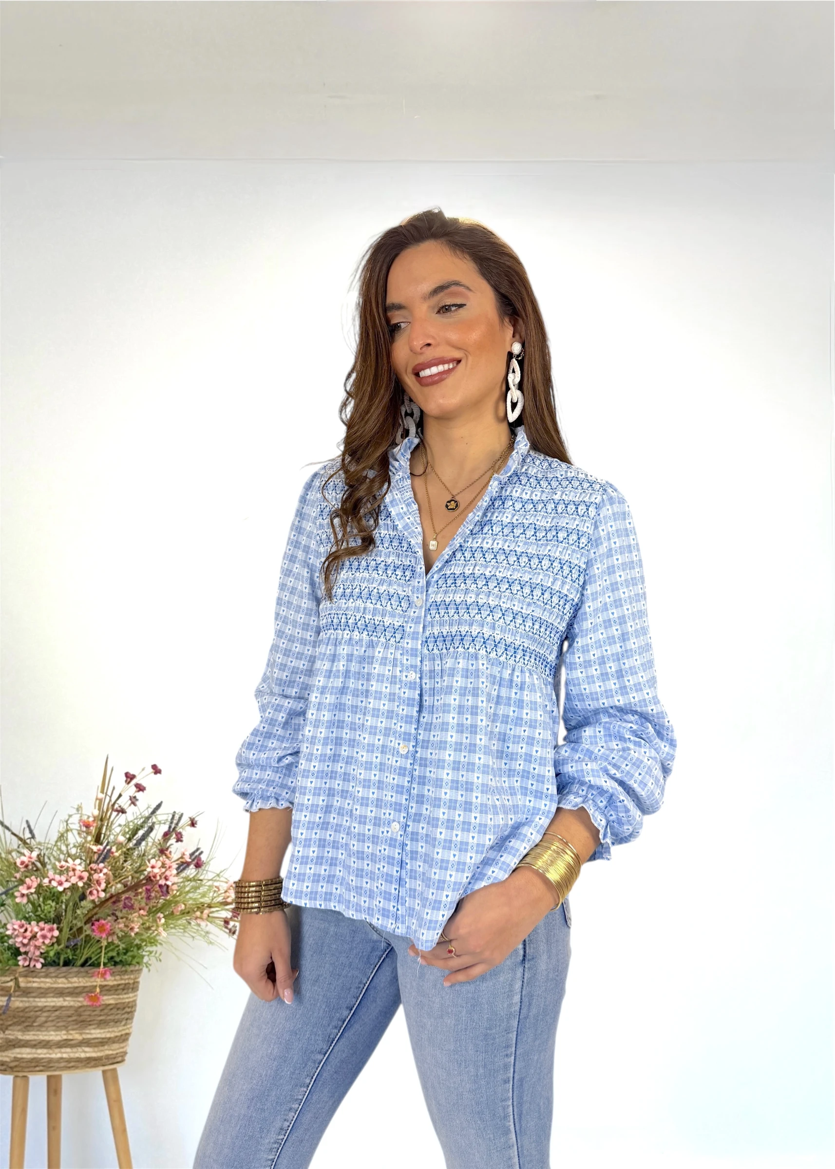 Blusa elática en la zona del pecho con nido de abeja y manga larga terminada en elástico. Corte suelto y cómodo. Disponible en tallas S, M, L y XL.