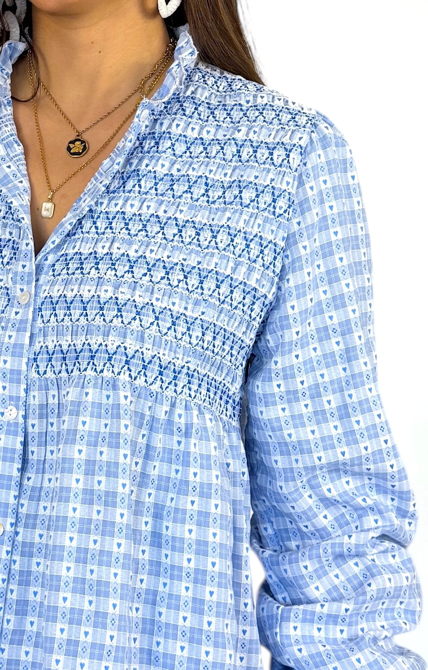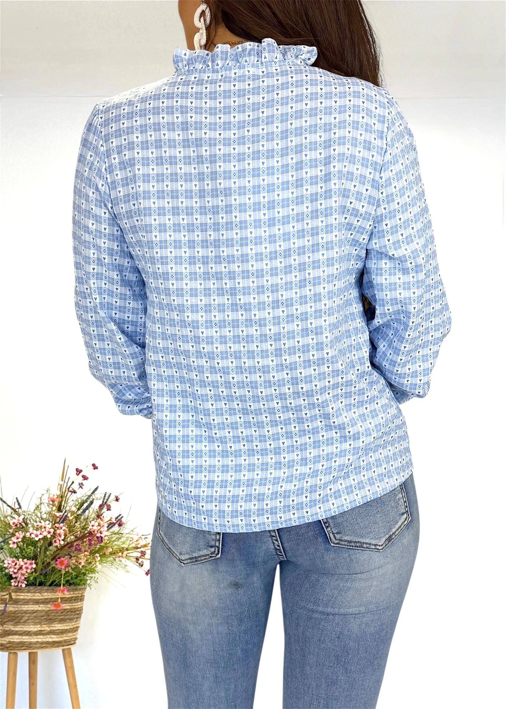 Blusa con diseño relajado y favorecedor. Presenta un cómodo elástico tipo nido de abeja en la parte superior del pecho, que se adapta muy bien a distintas tallas. Las mangas largas terminan en un pequeño volante con elástico, aportando un toque femenino y actual.