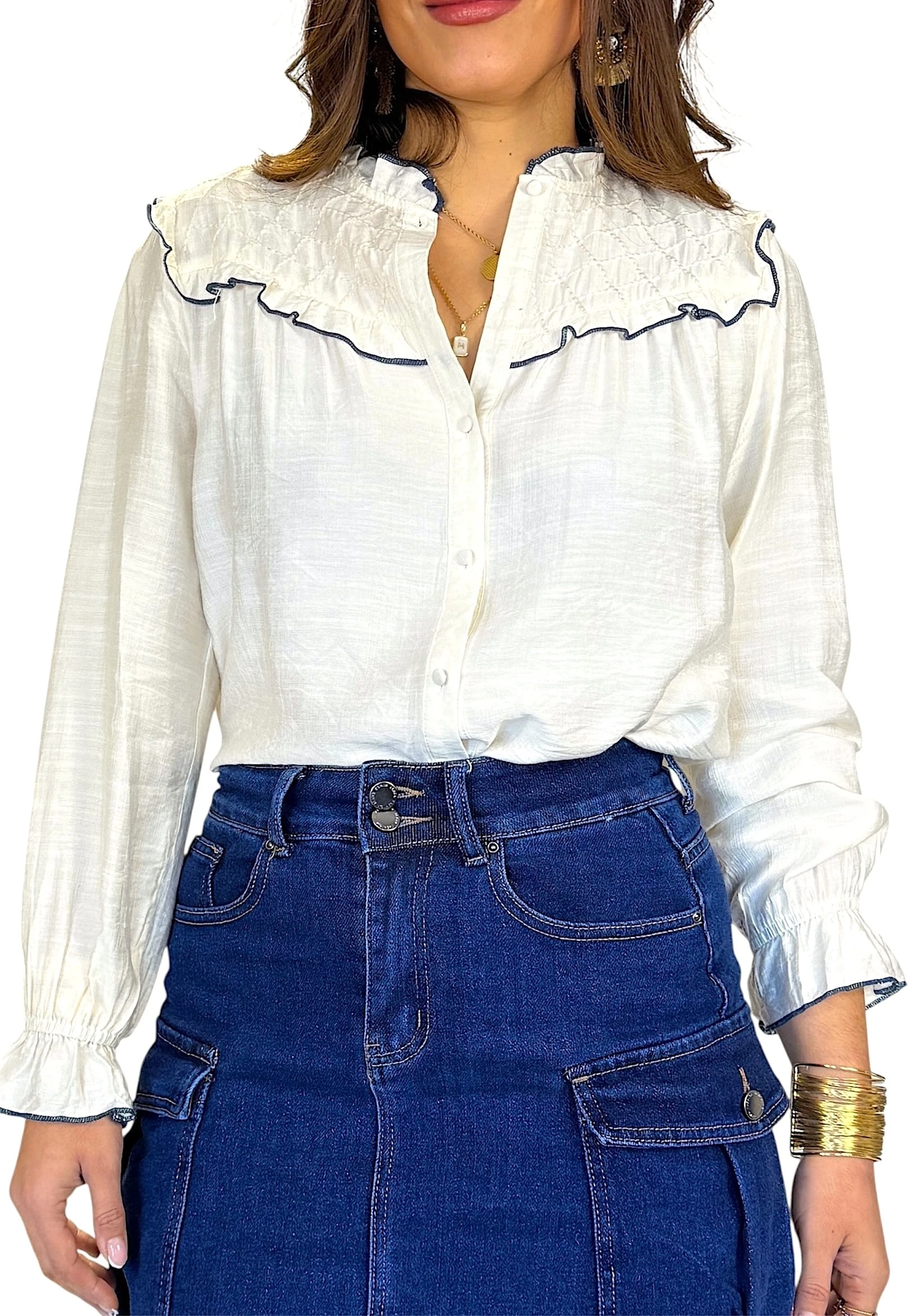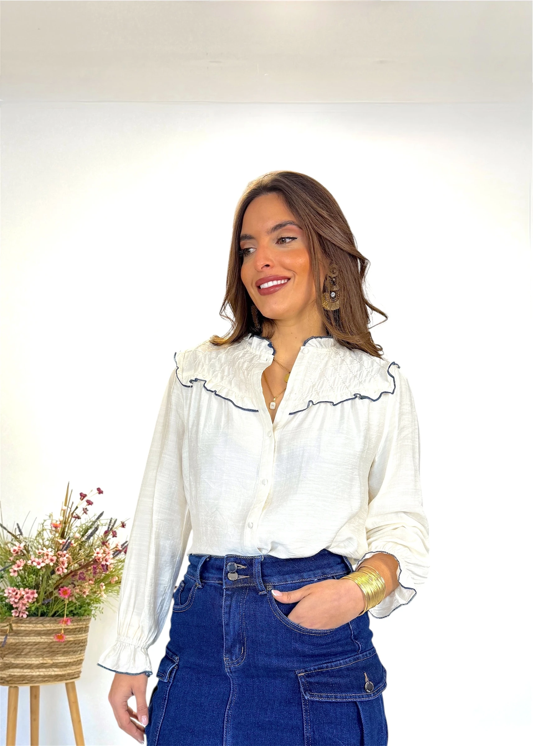 Blusa de color beige claro con detalles en azul marino que aportan contraste y un toque especial al diseño. El cuello mao y la zona superior bordada al tono elevan su estilo sin perder comodidad. Las mangas terminan con un pequeño volante y elástico, perfectas para un ajuste cómodo y femenino.