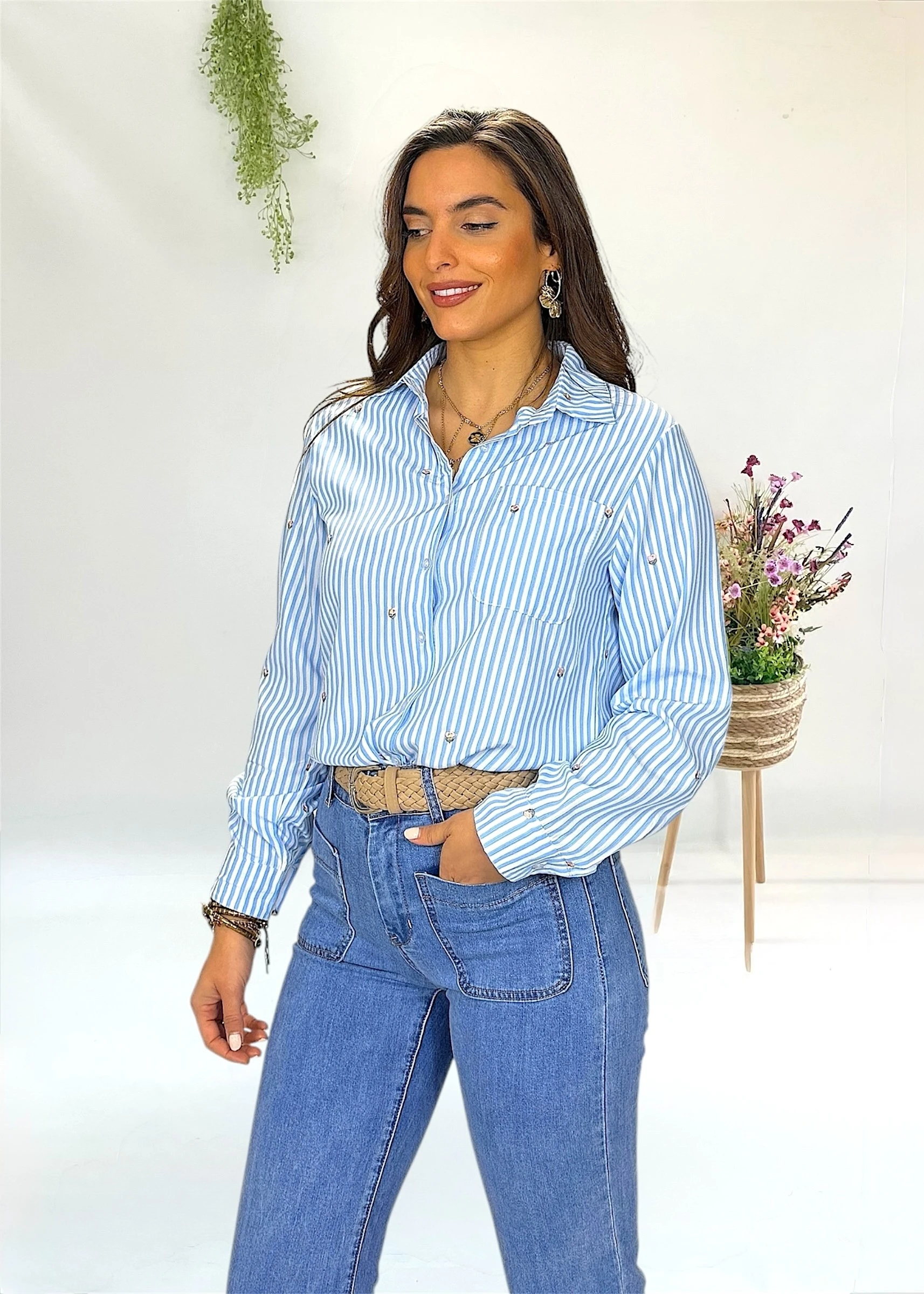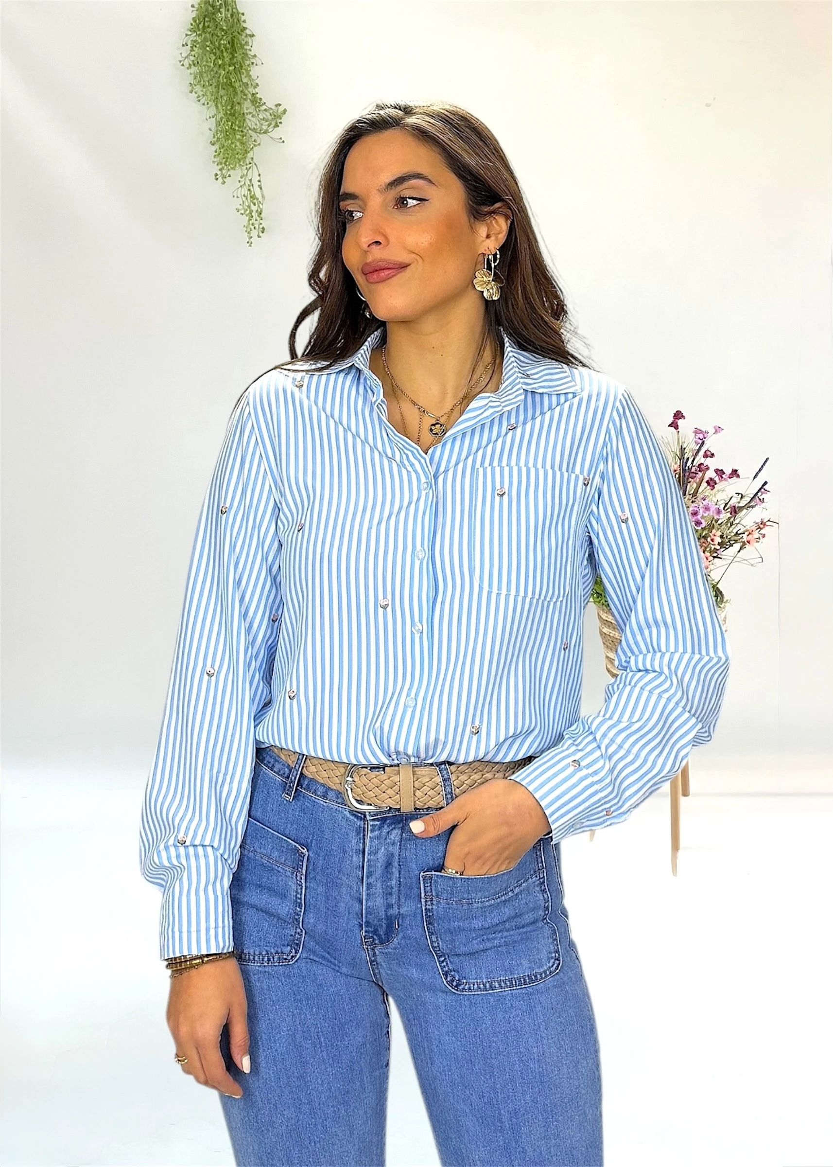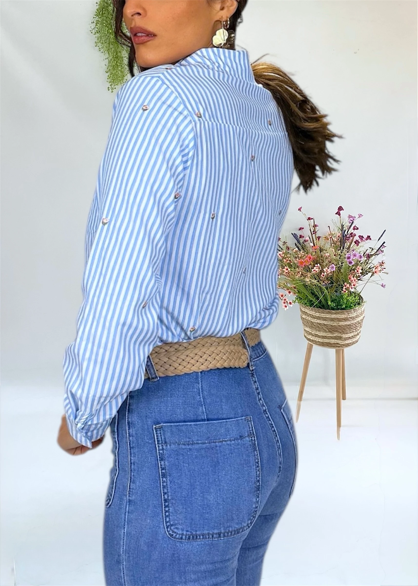 Blusa de rayas azul y blanca con bordados florales pequeños repartidos por toda la prenda. Corte recto, manga larga, cuello camisero y cierre frontal con botones.
