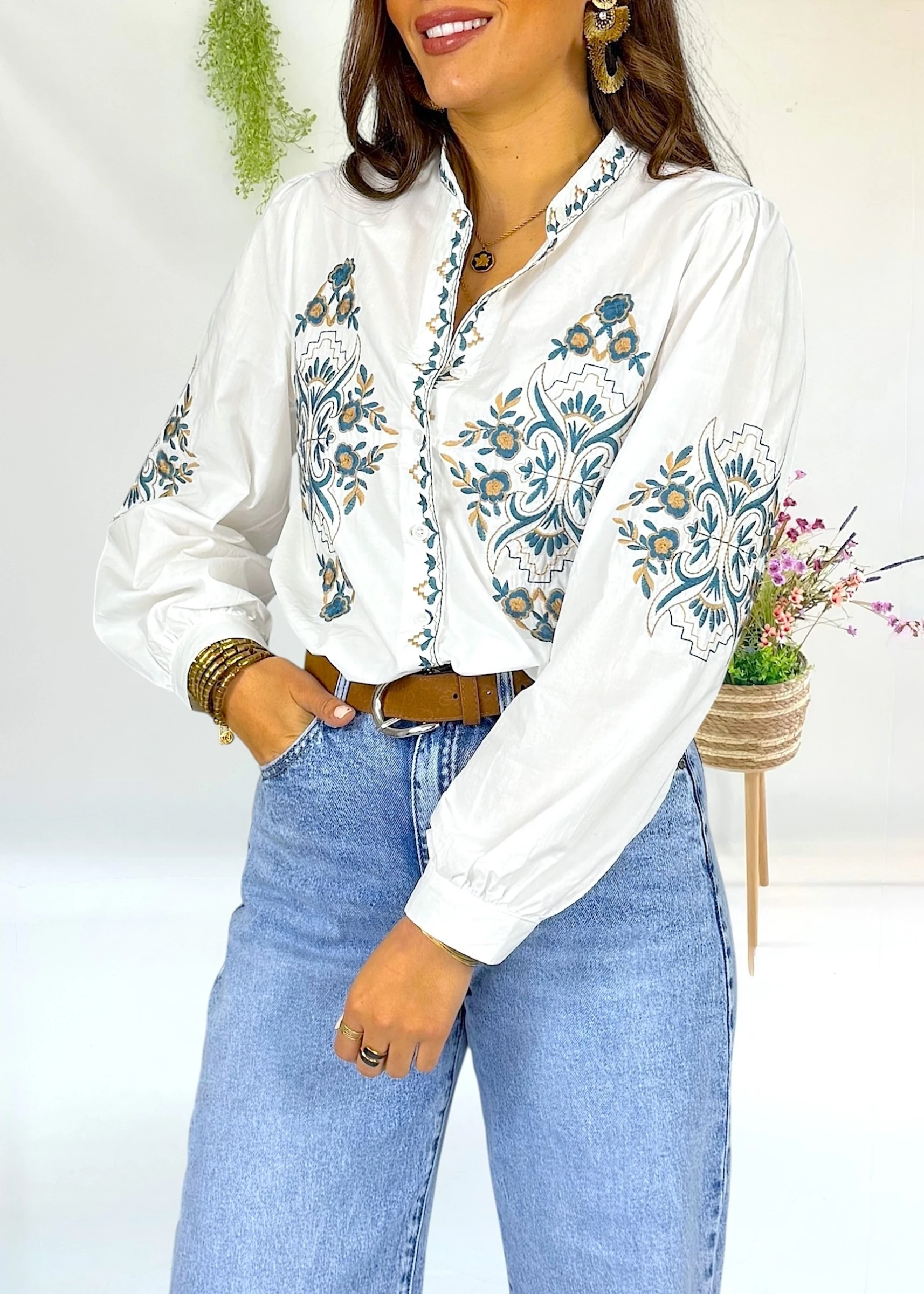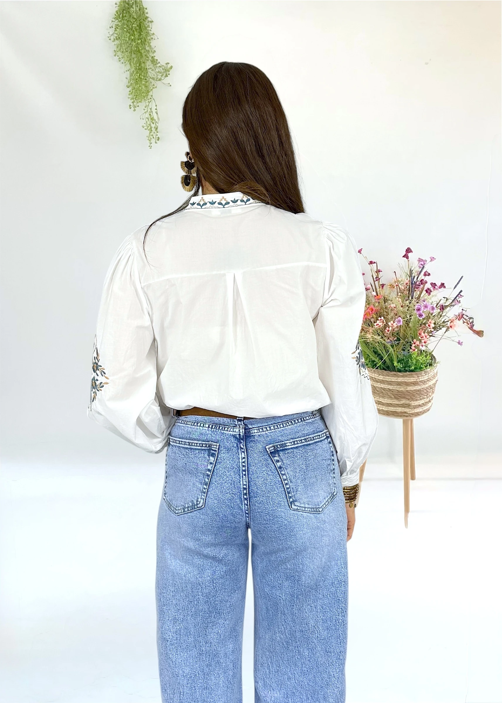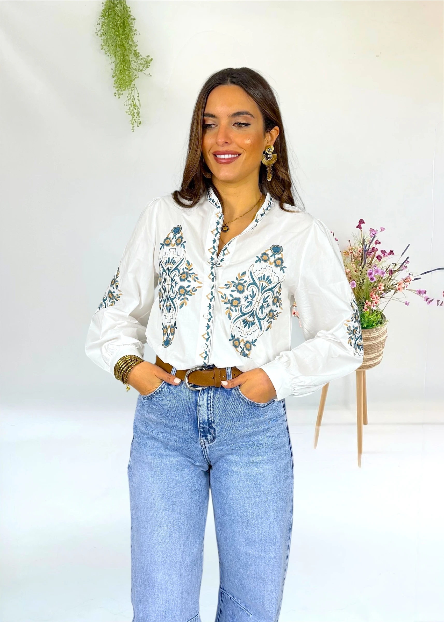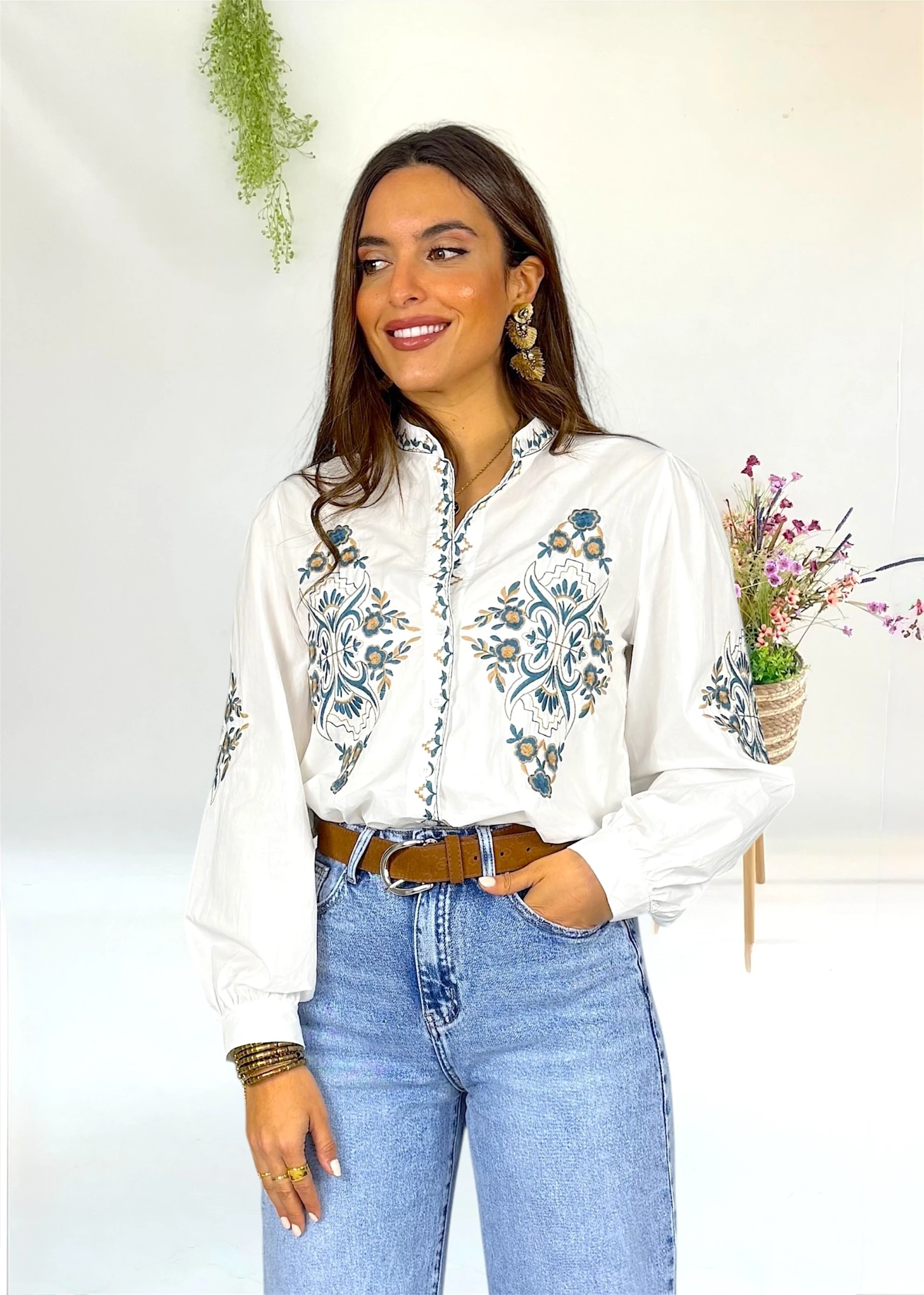 Blusa blanca con bordados en azul y beige y cuello mao. Tallas disponibles: S, M, L