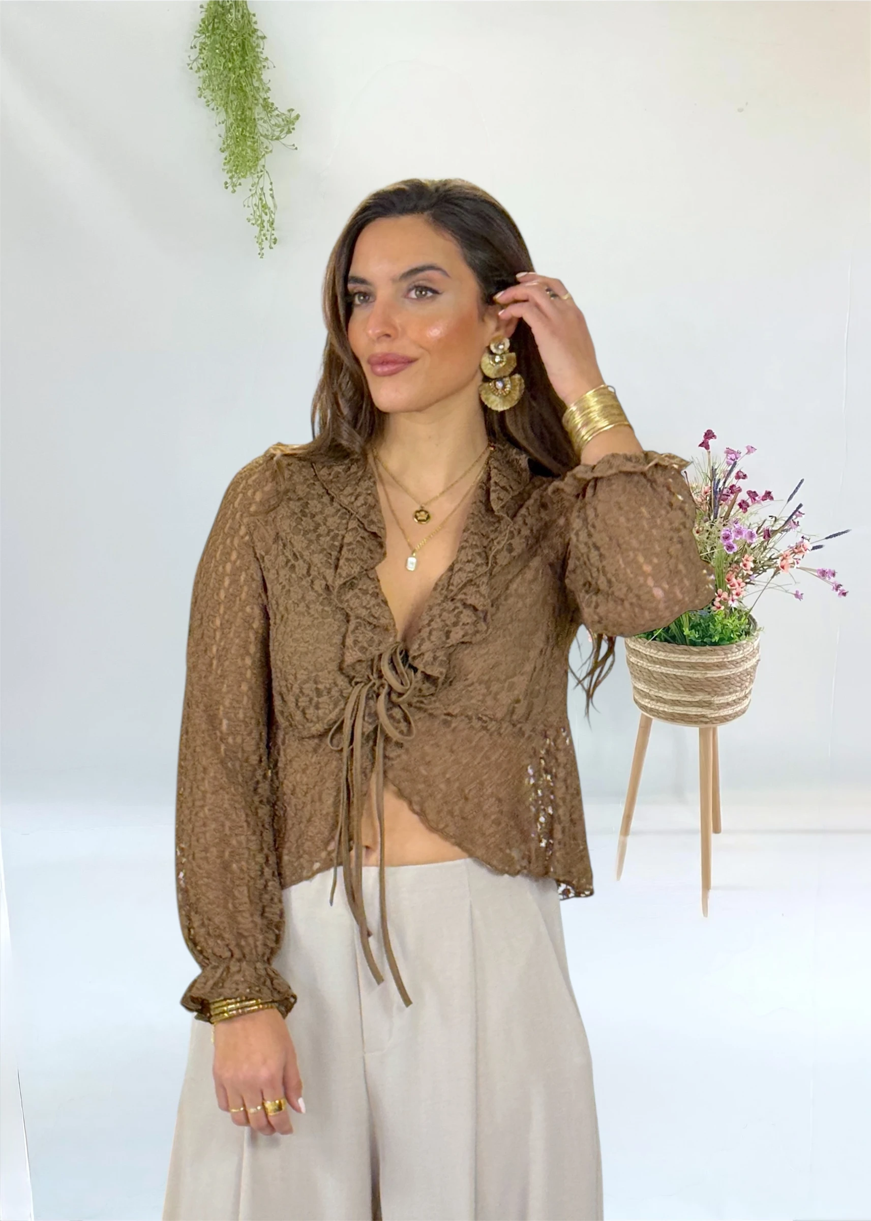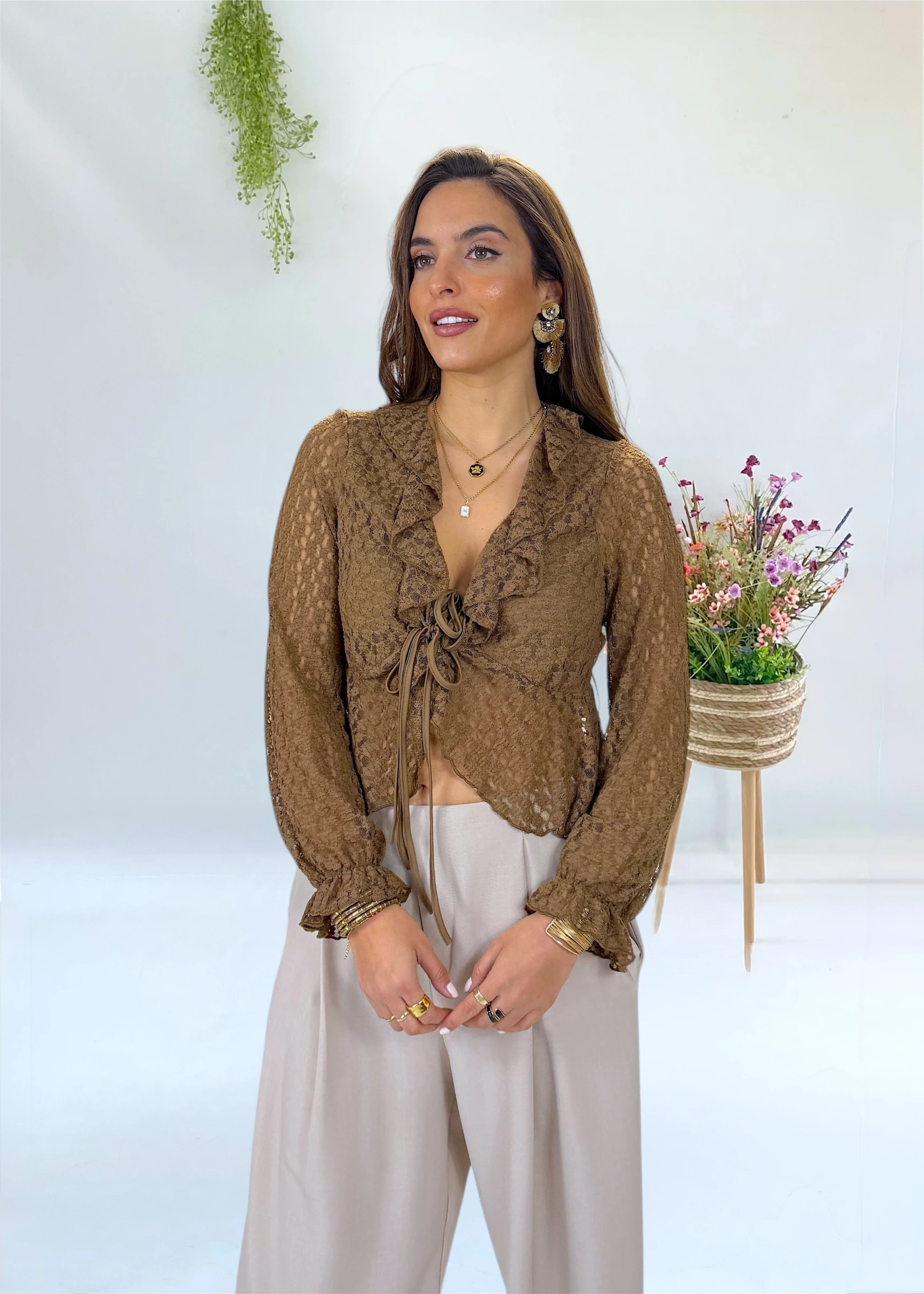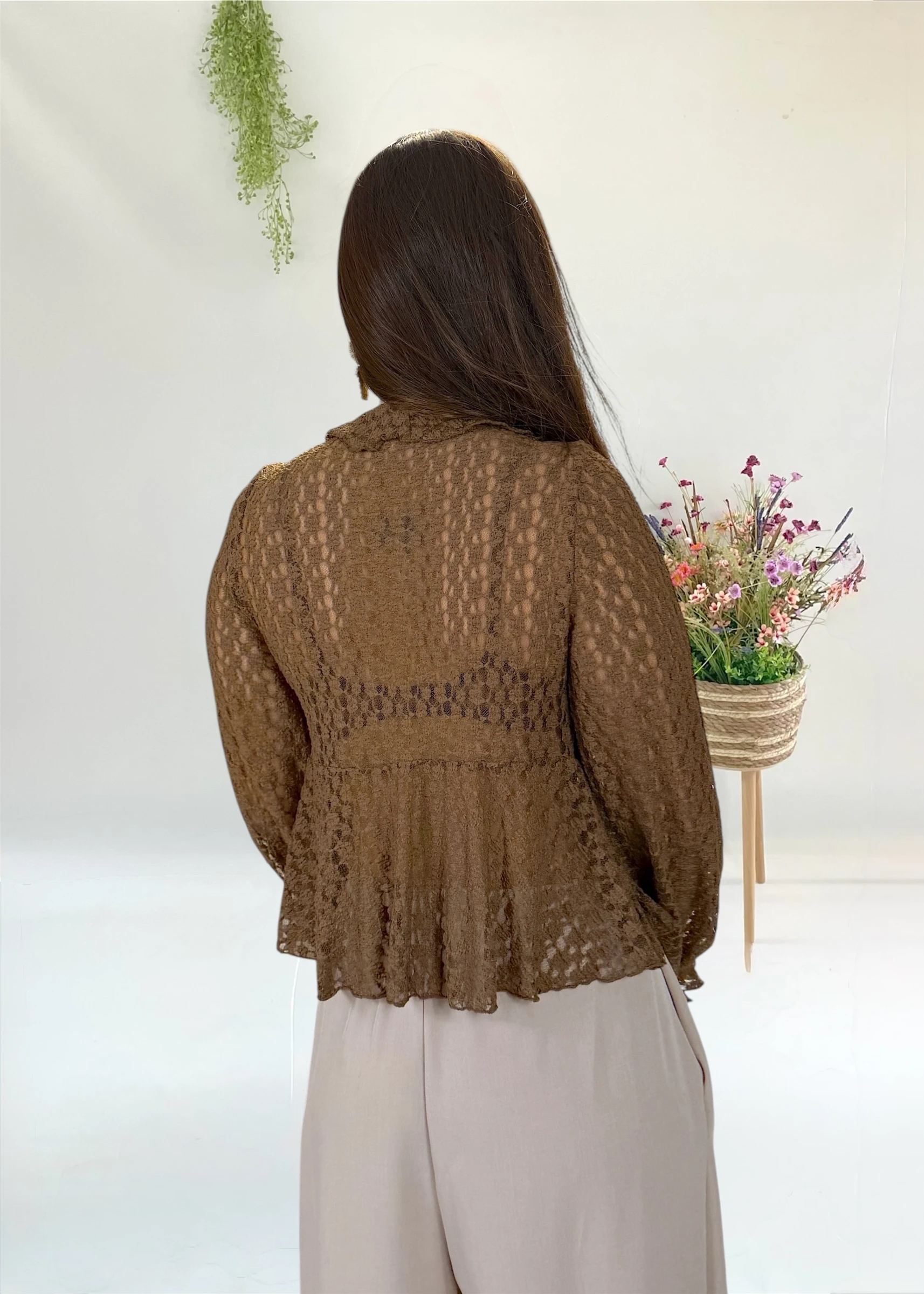 Chaqueta de encaje marrón con volantes, cierre ajustable y mangas elásticas. Puedes llevarla como blusa.