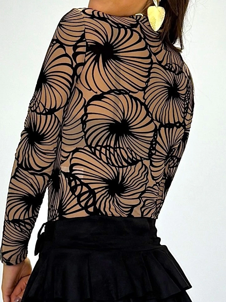 Body de gasa semitransparente con efecto tattoo en terciopelo. Ajuste cómodo y favorecedor gracias a su tejido elástico.