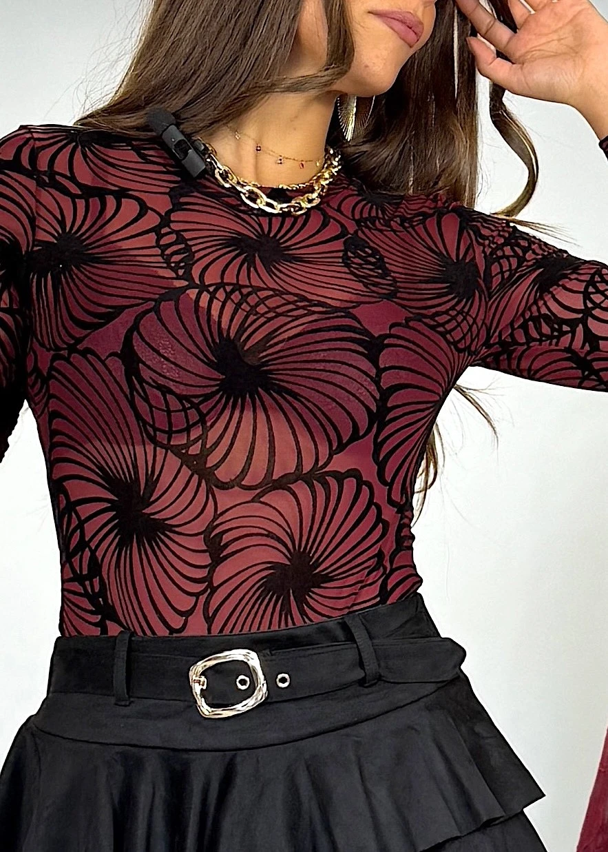 Body de gasa semitransparente con un original efecto tattoo creado por detalles en terciopelo flocado