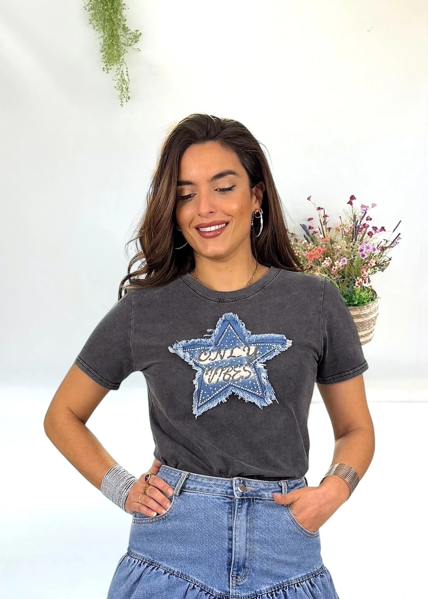 Camiseta gris efecto lavado con estrella central en denim y mensaje bordado que aporta un aire desenfadado y actual. Una prenda con carácter que eleva cualquier look casual.