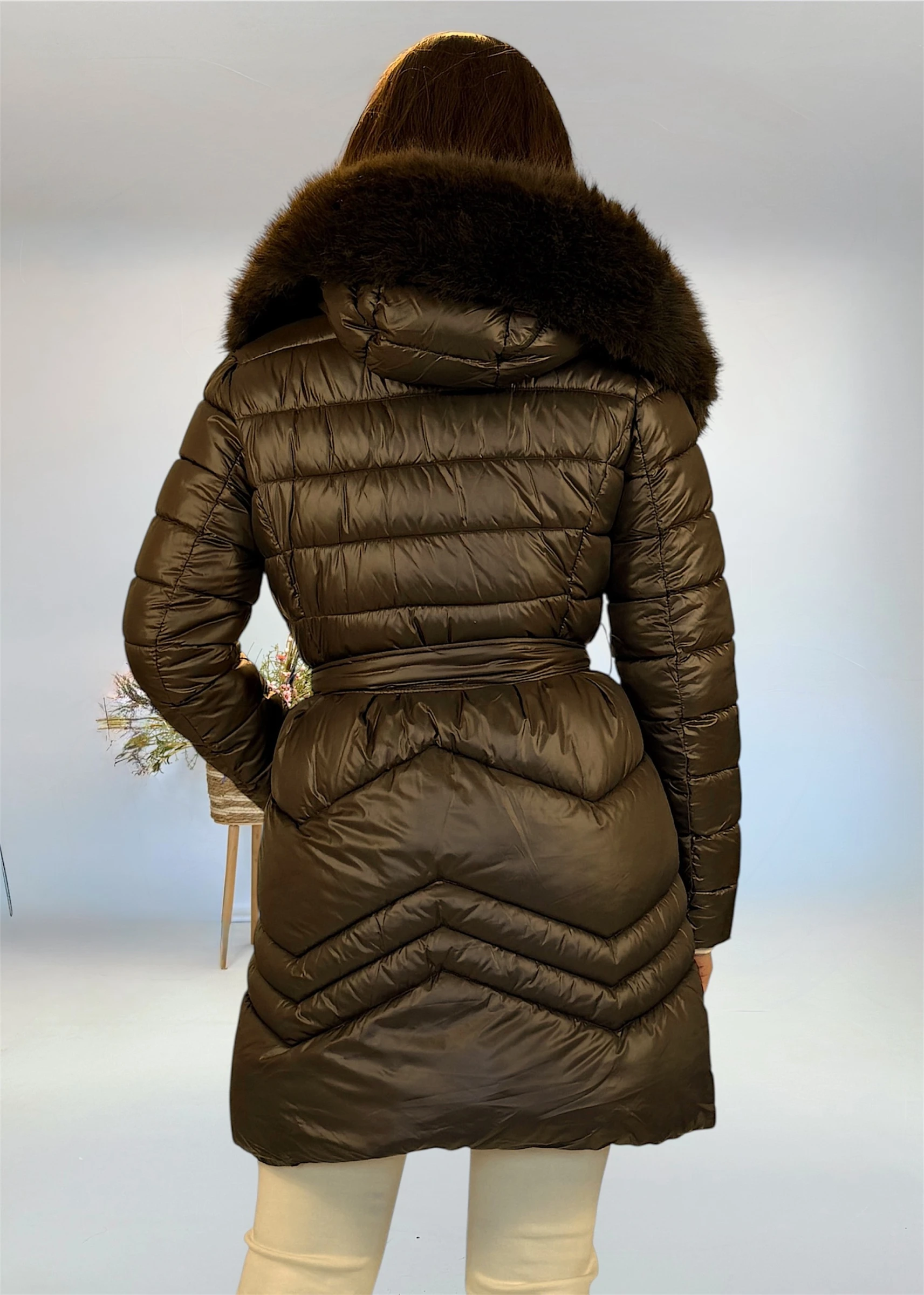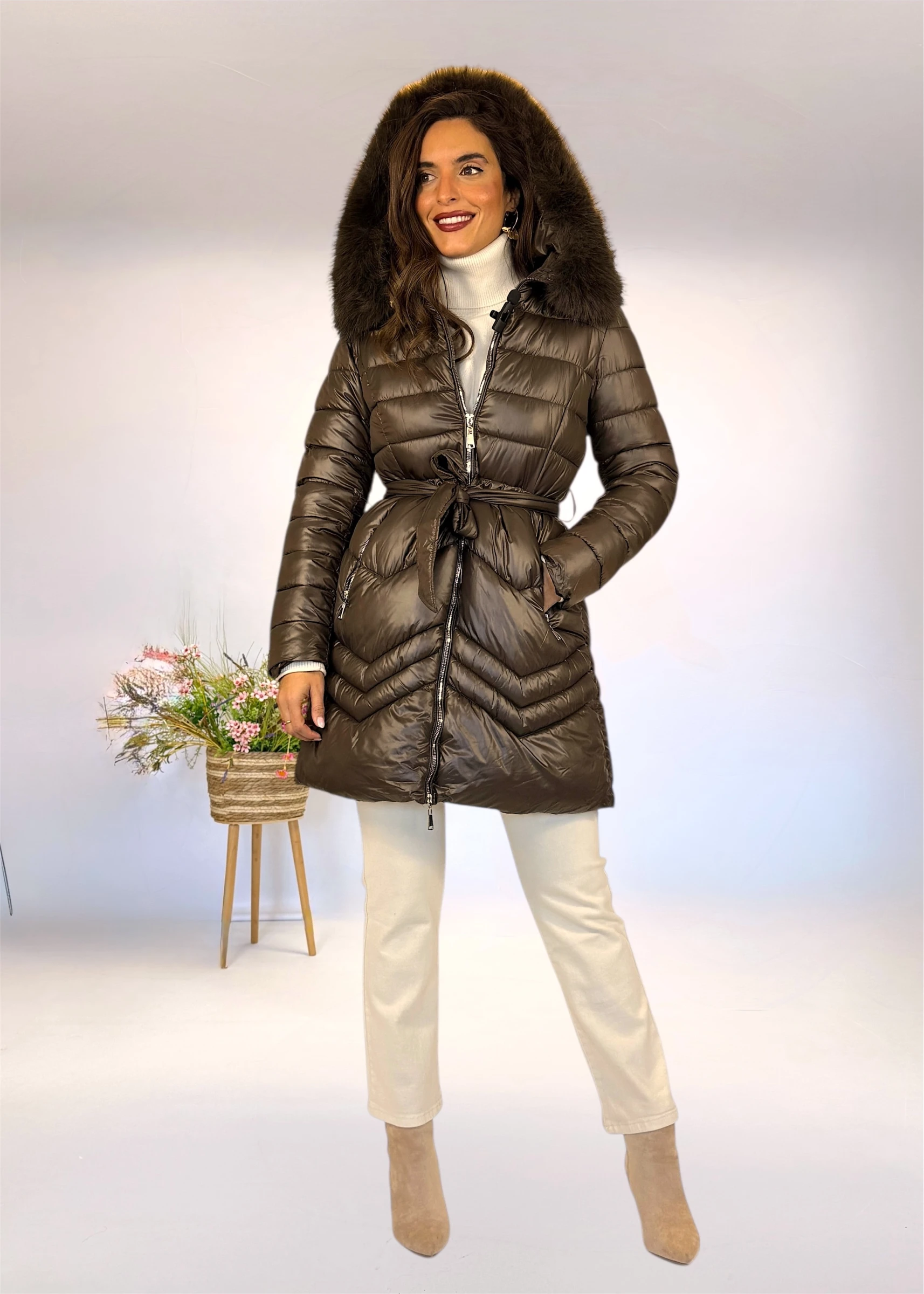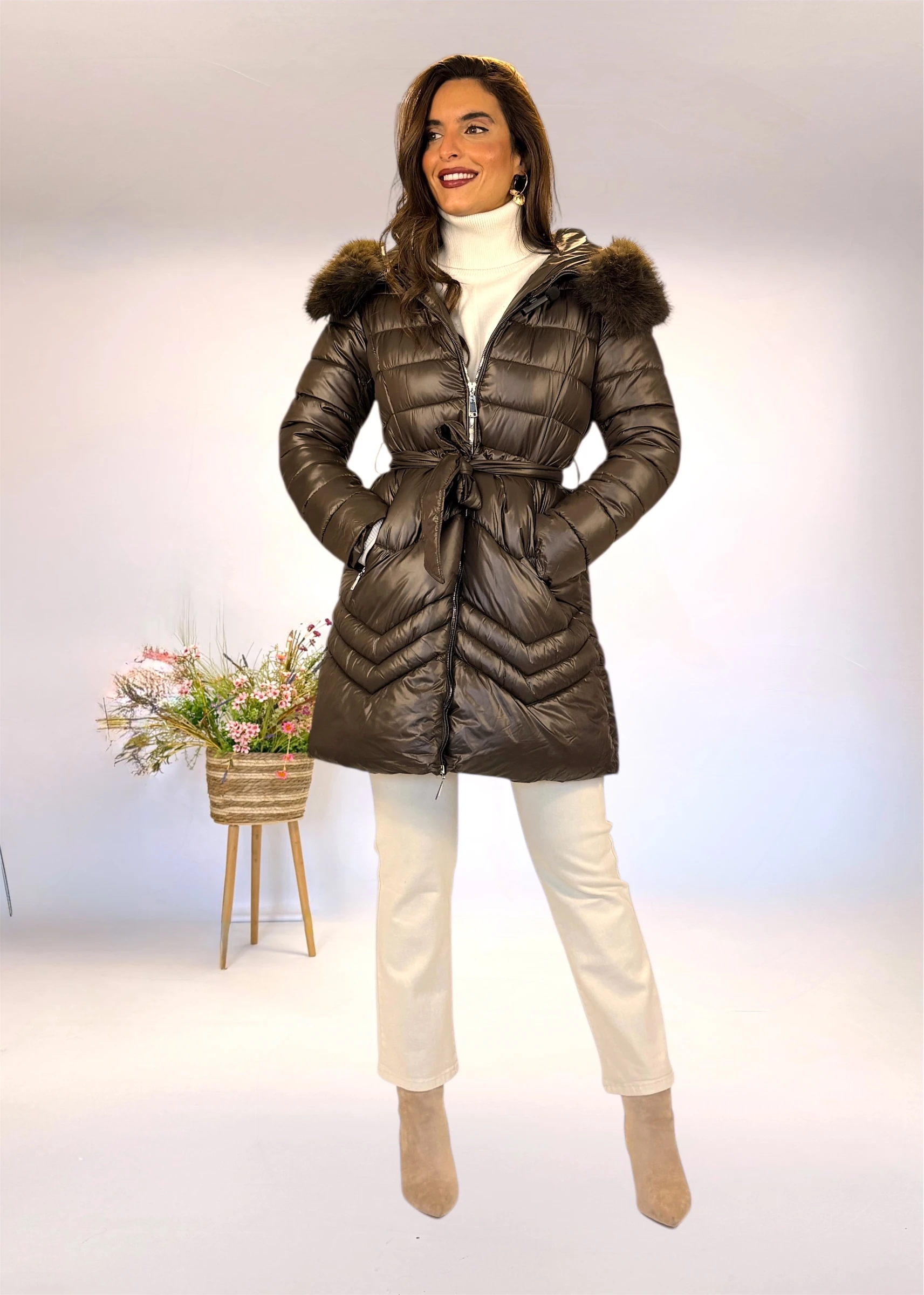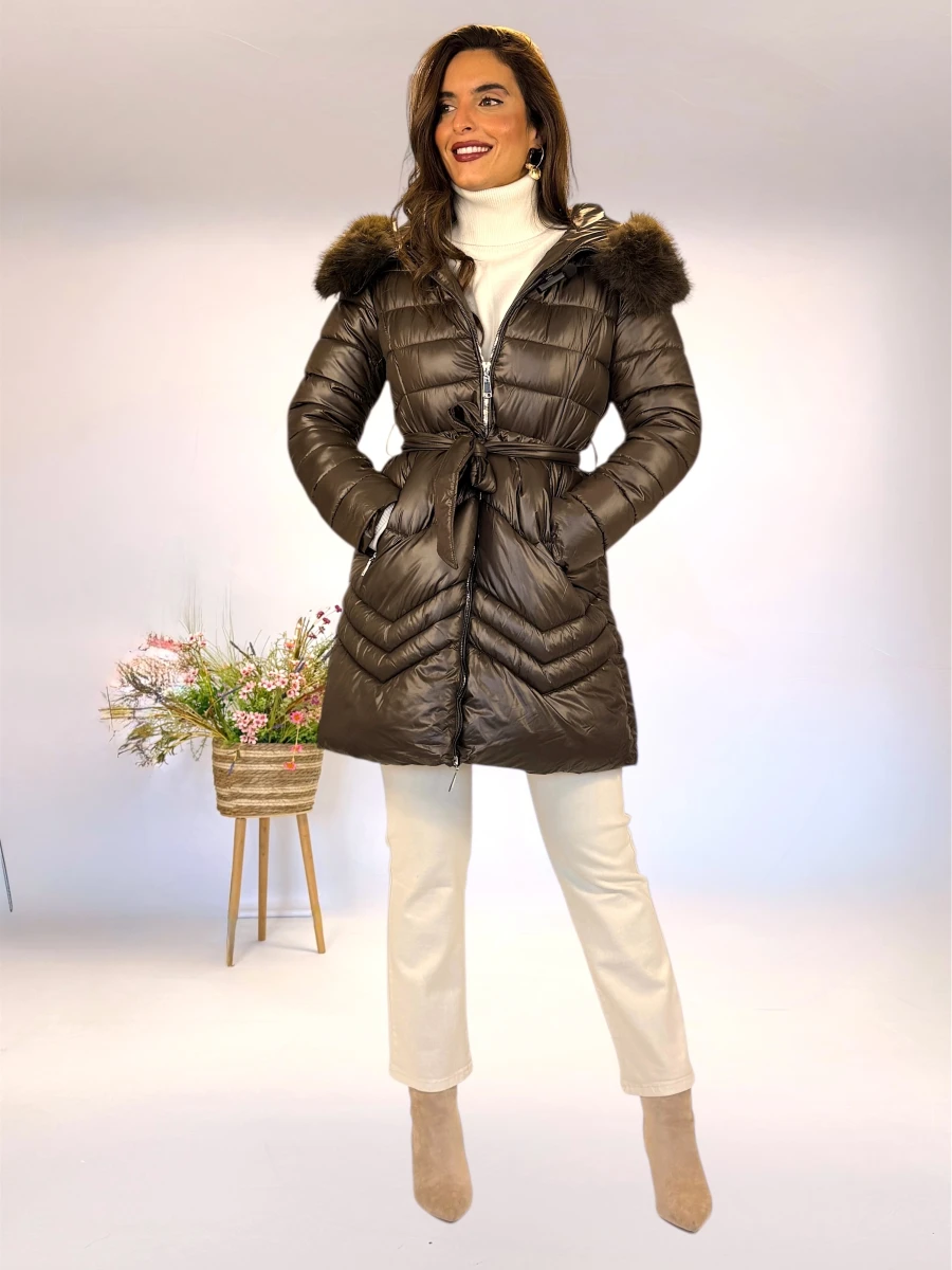 Abrigo acolchado marrón chocolate con capucha de pelo desmontable y con cinturón del mismo tejido. Cremallera y bolsillos funcionales.