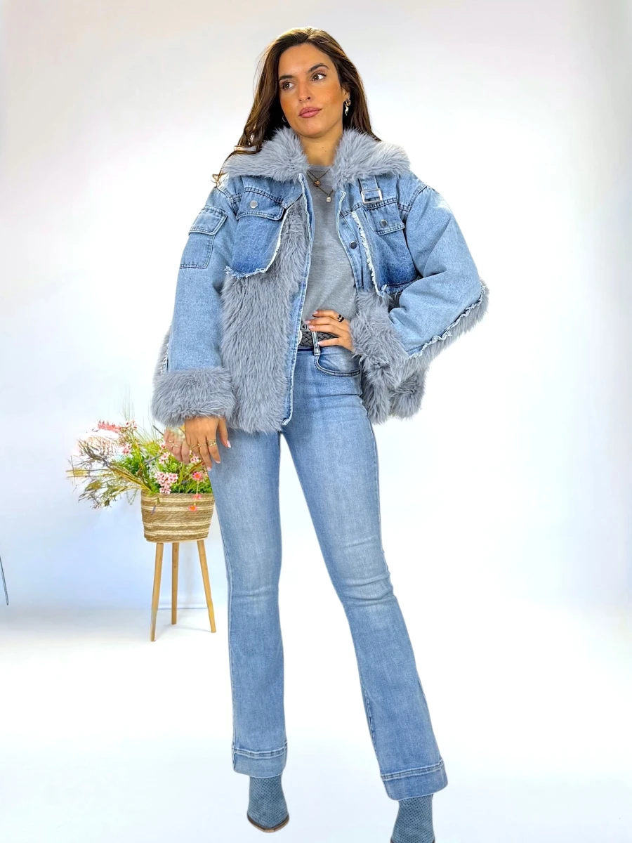 Abrigo corto acolchado que combina pelo sintético suave con tejido denim en contraste. Una prenda original, abrigada y con mucho estilo.