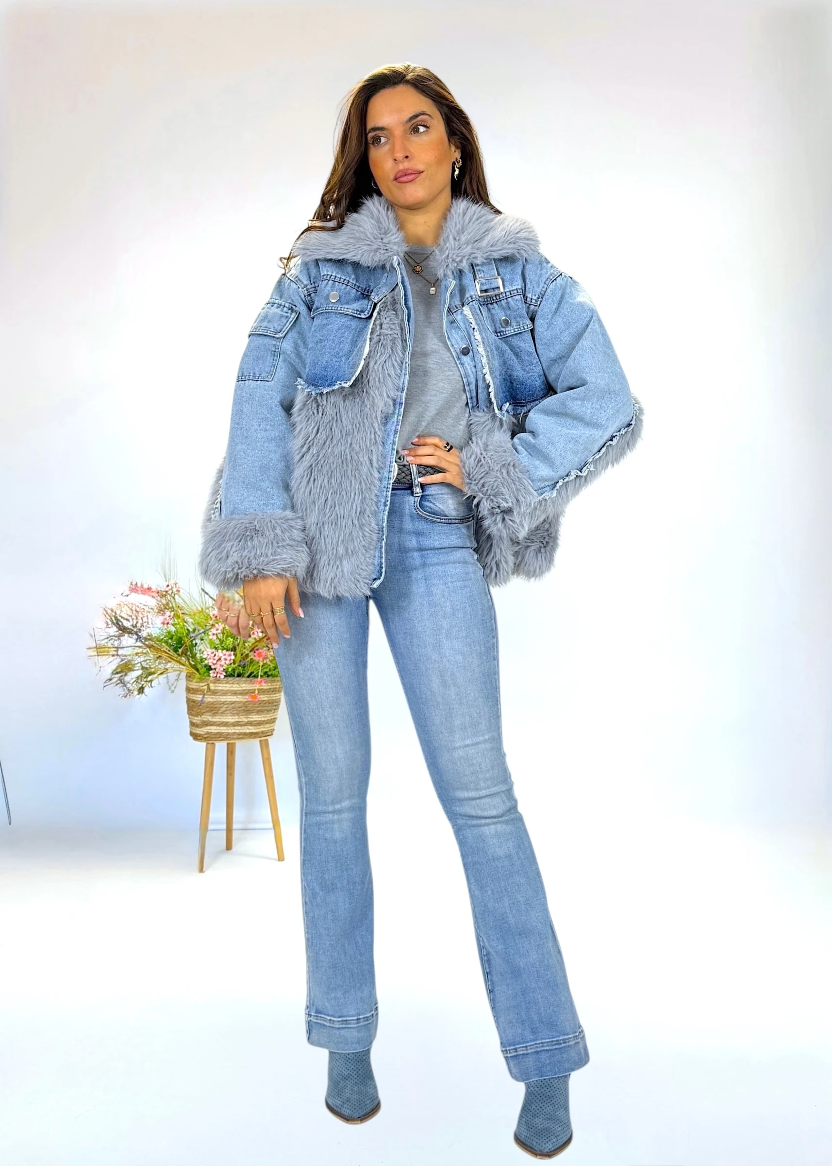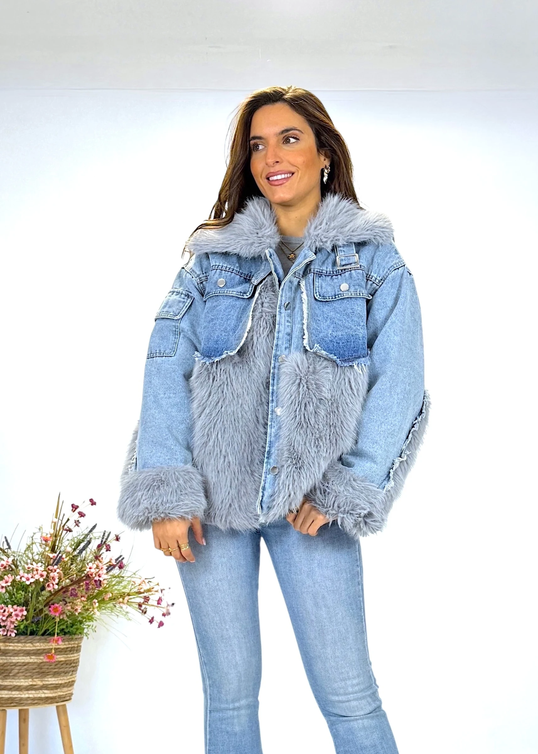 - Diseño moderno con mezcla de texturas: pelo sintético y denim