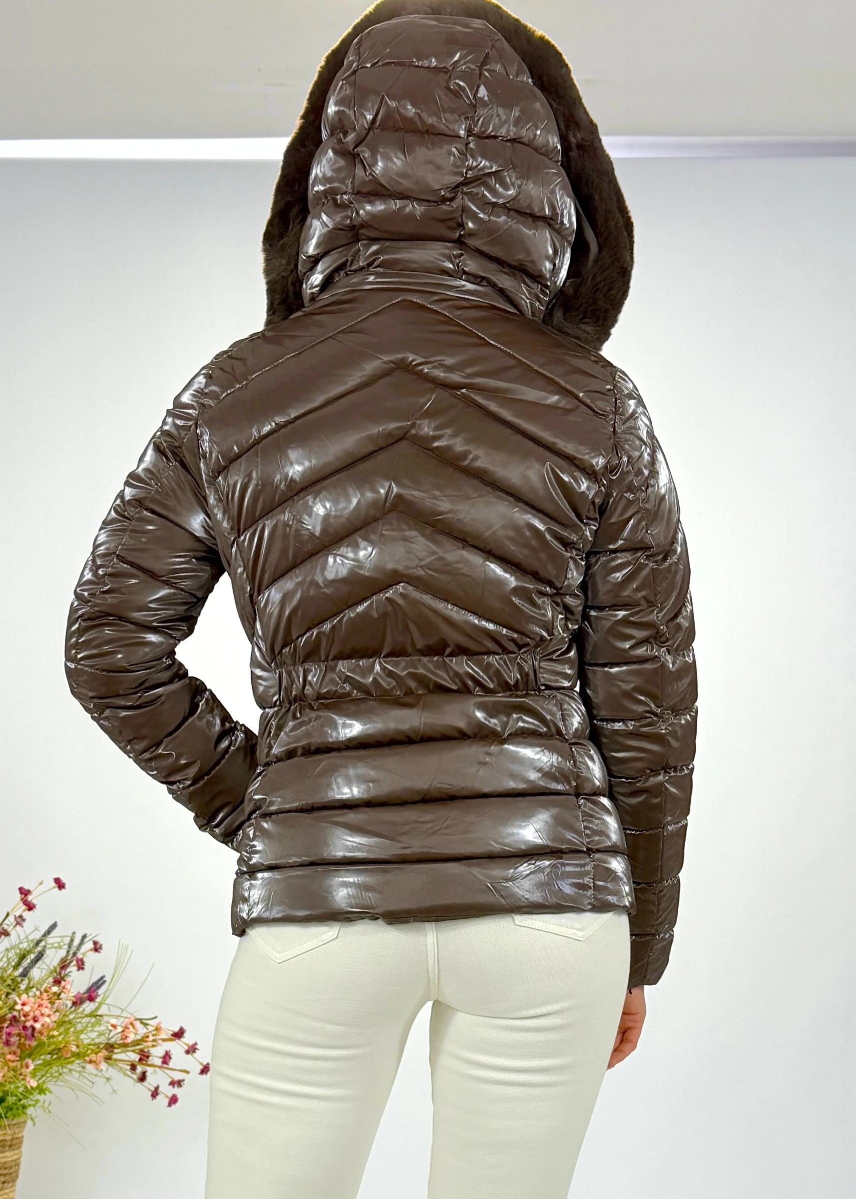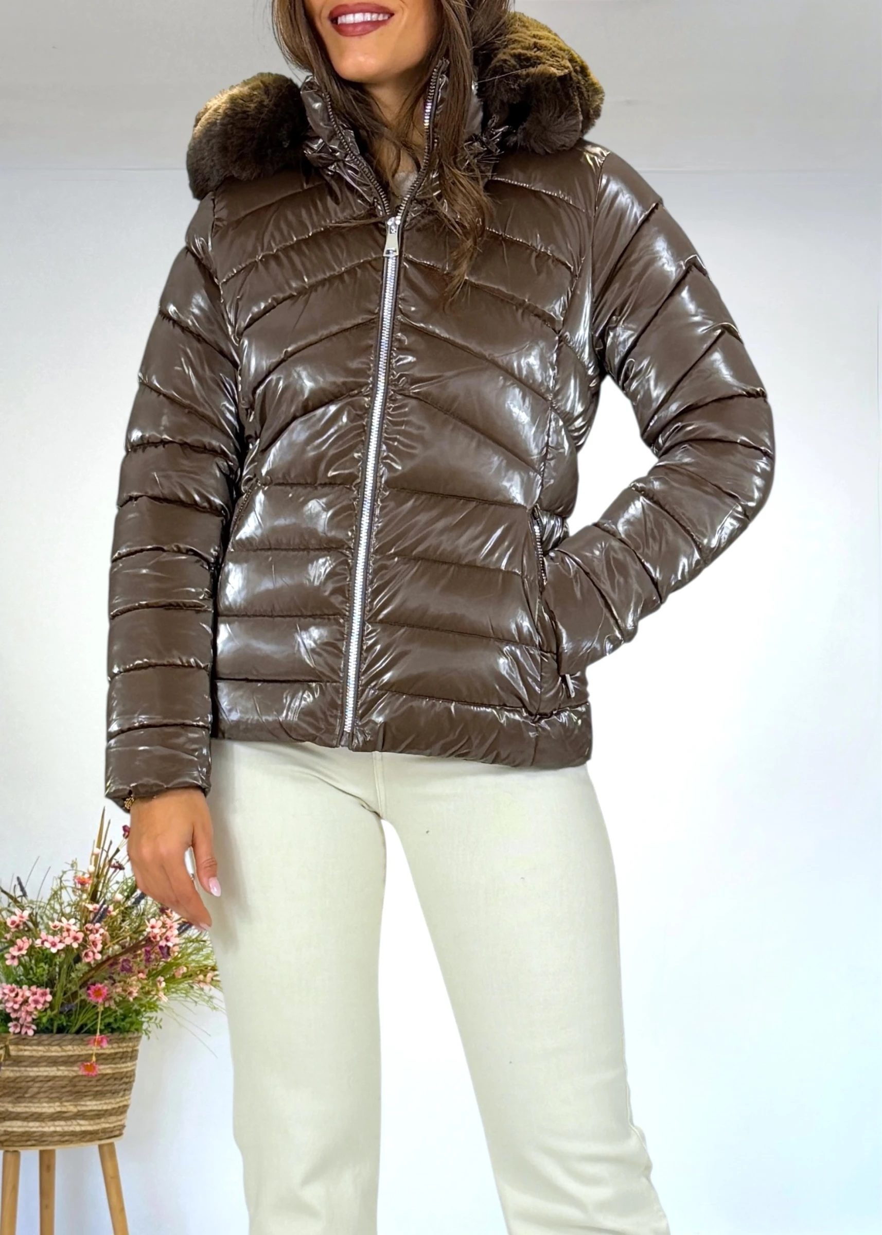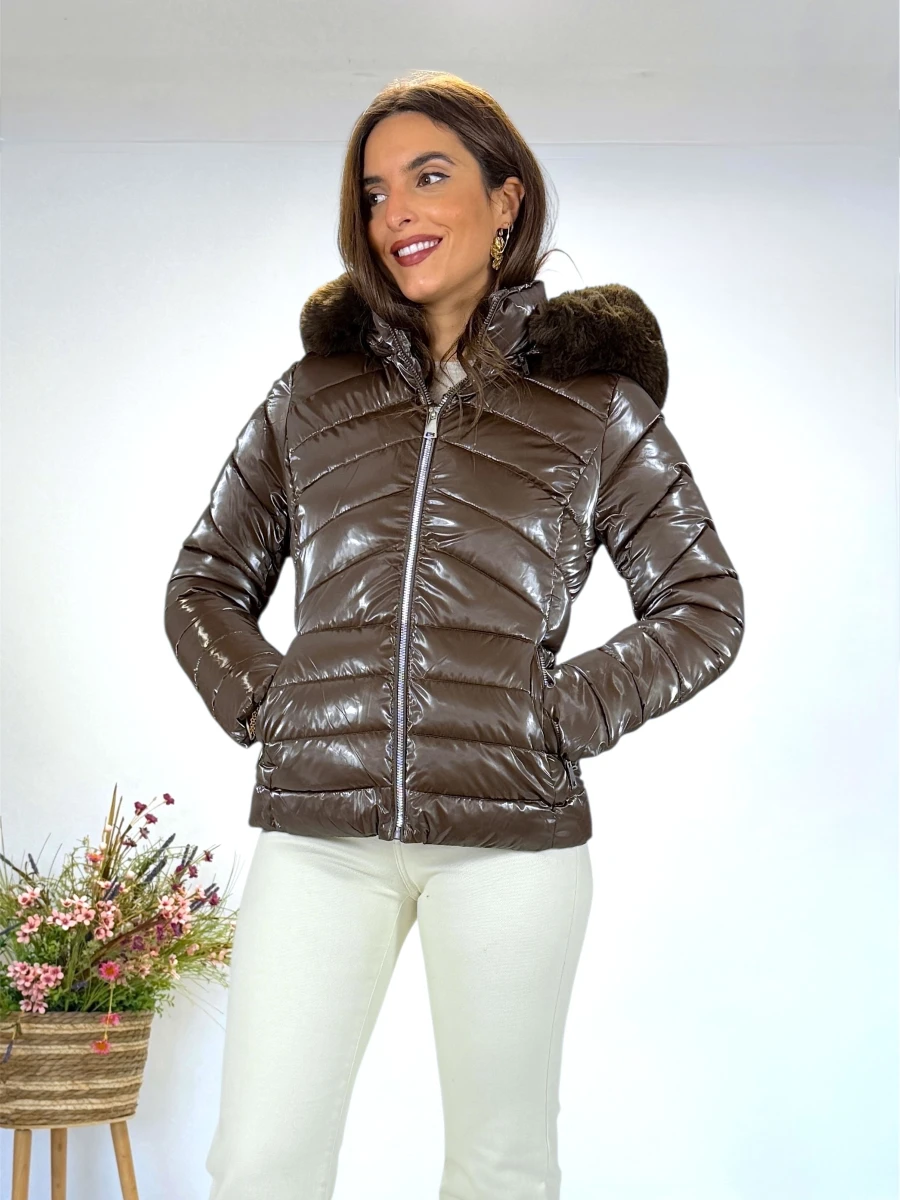 Abrigo corto acolchado en color marrón con acabado metlizado. Capucha con pelo desmontable, cierre frontal con cremallera y bolsillos laterales. Ideal para el invierno por su diseño cálido y práctico.