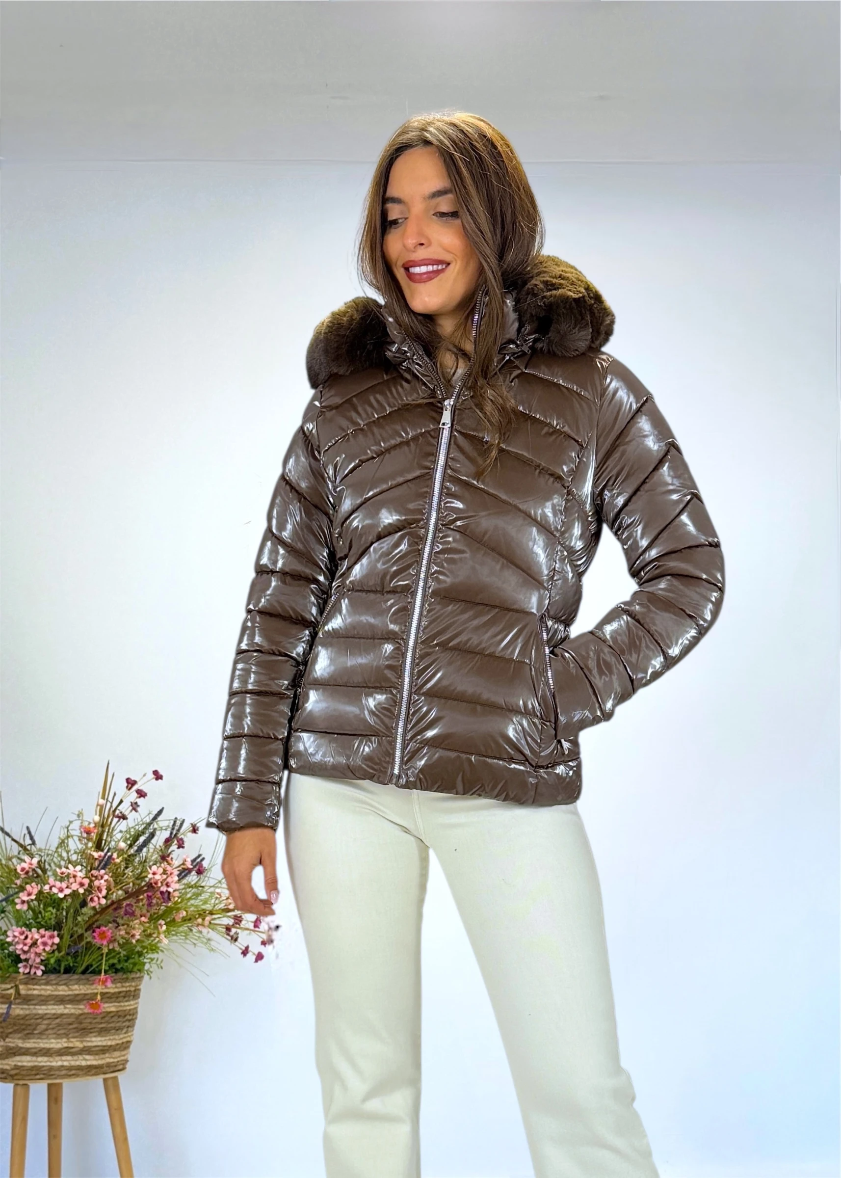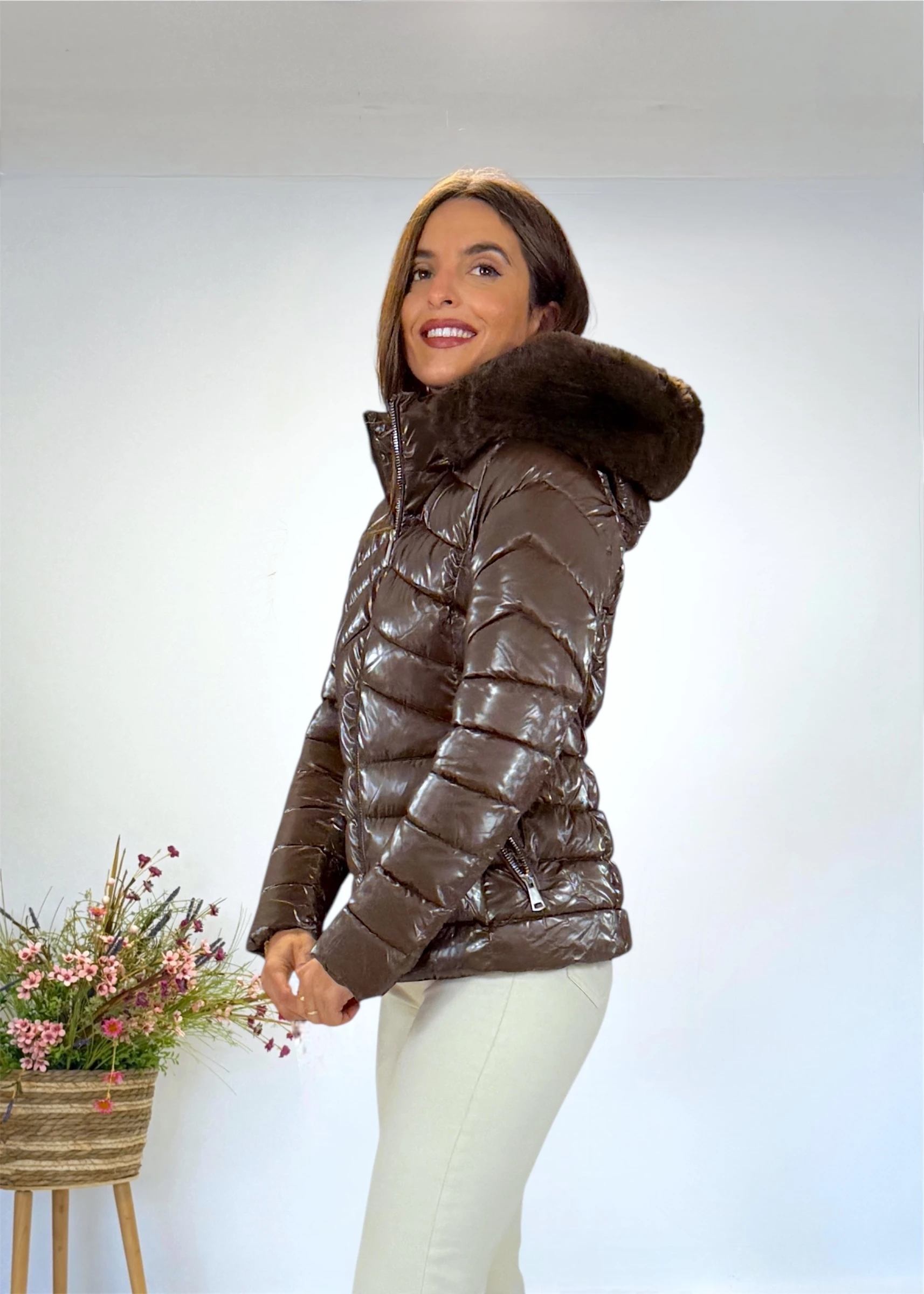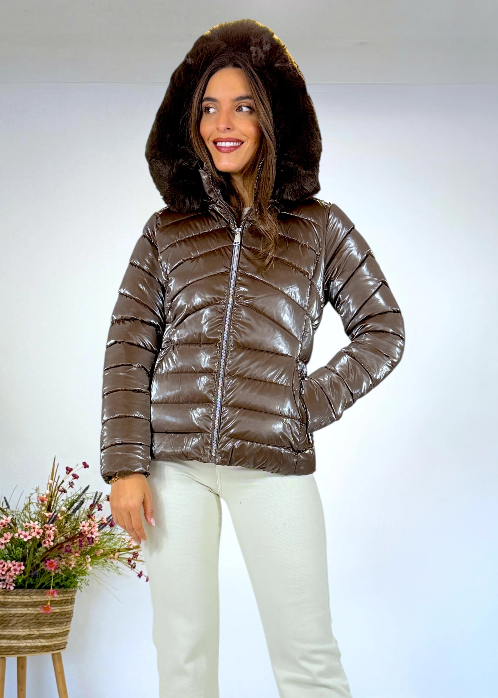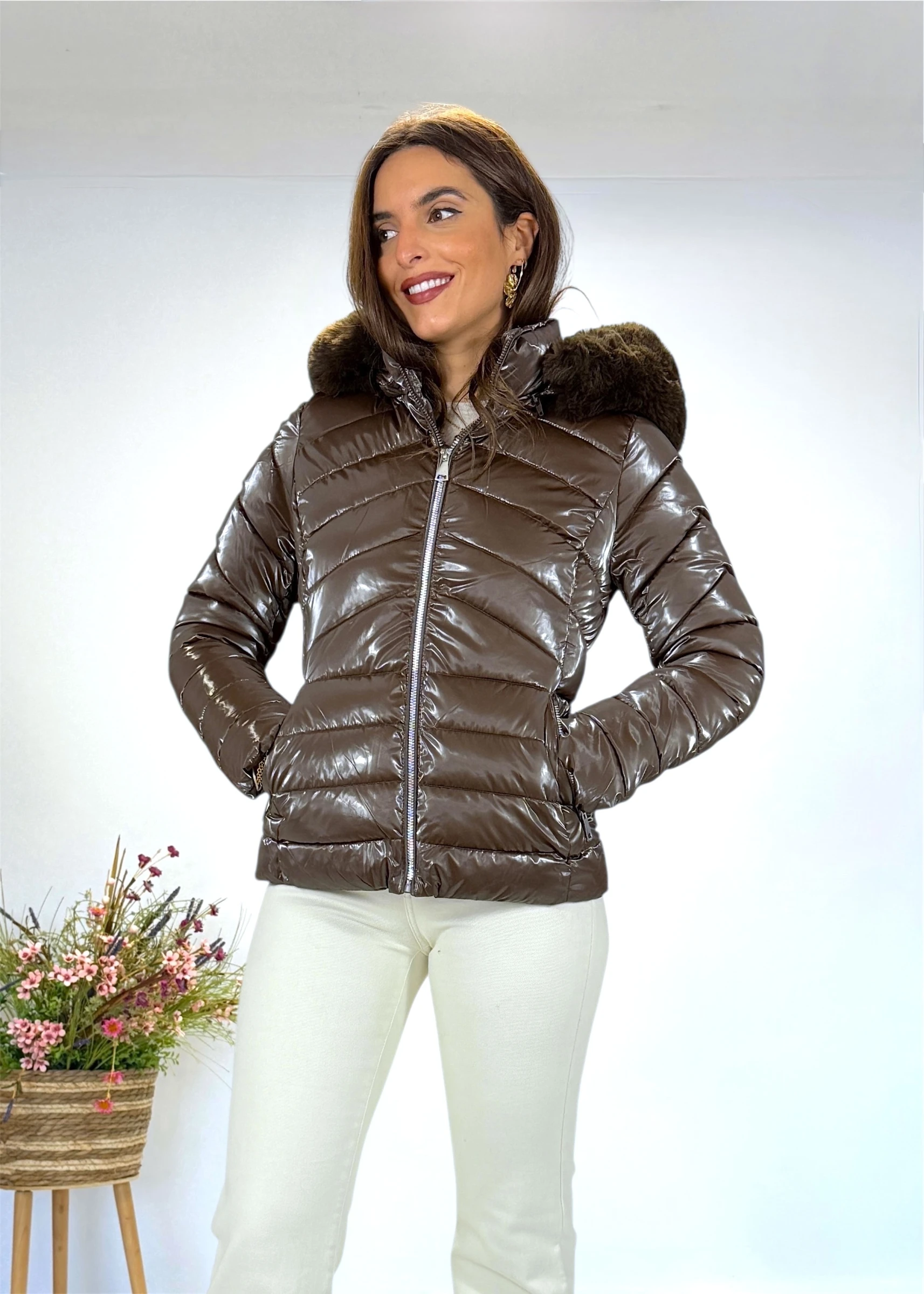 Abrigo corto acolchado marrón con capucha y pelo desmontable. Cierre con cremallera y bolsillos. Disponible desde la talla S hasta la XXL.