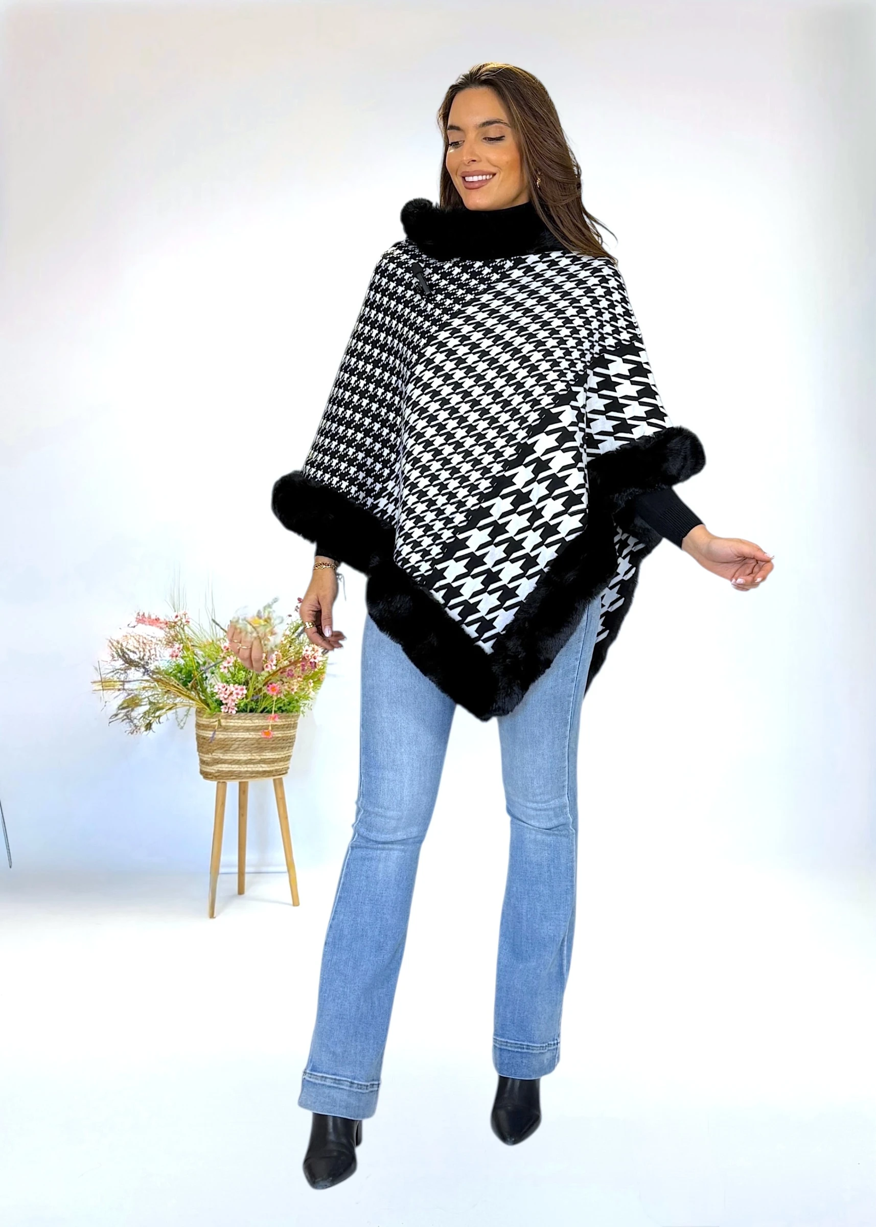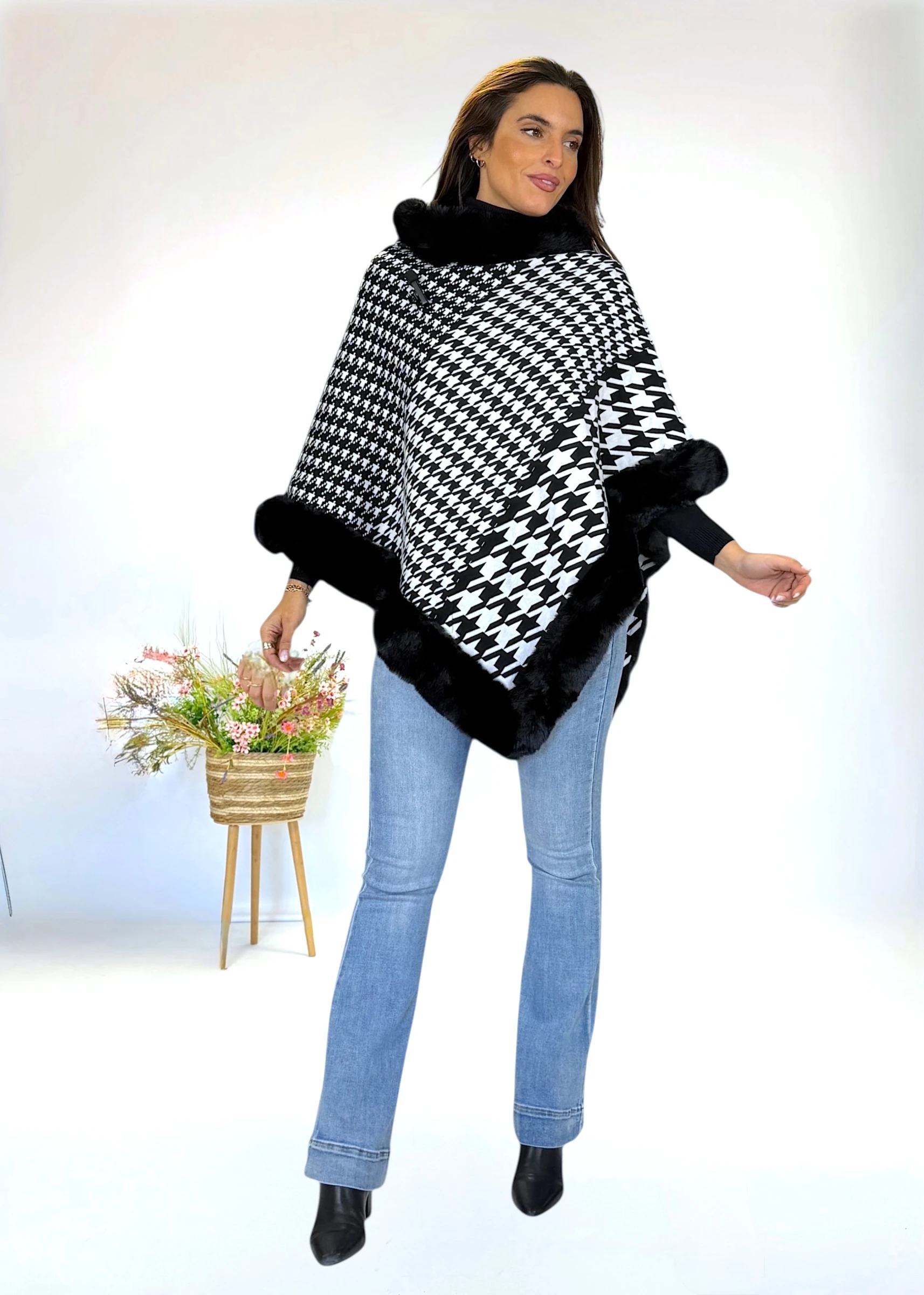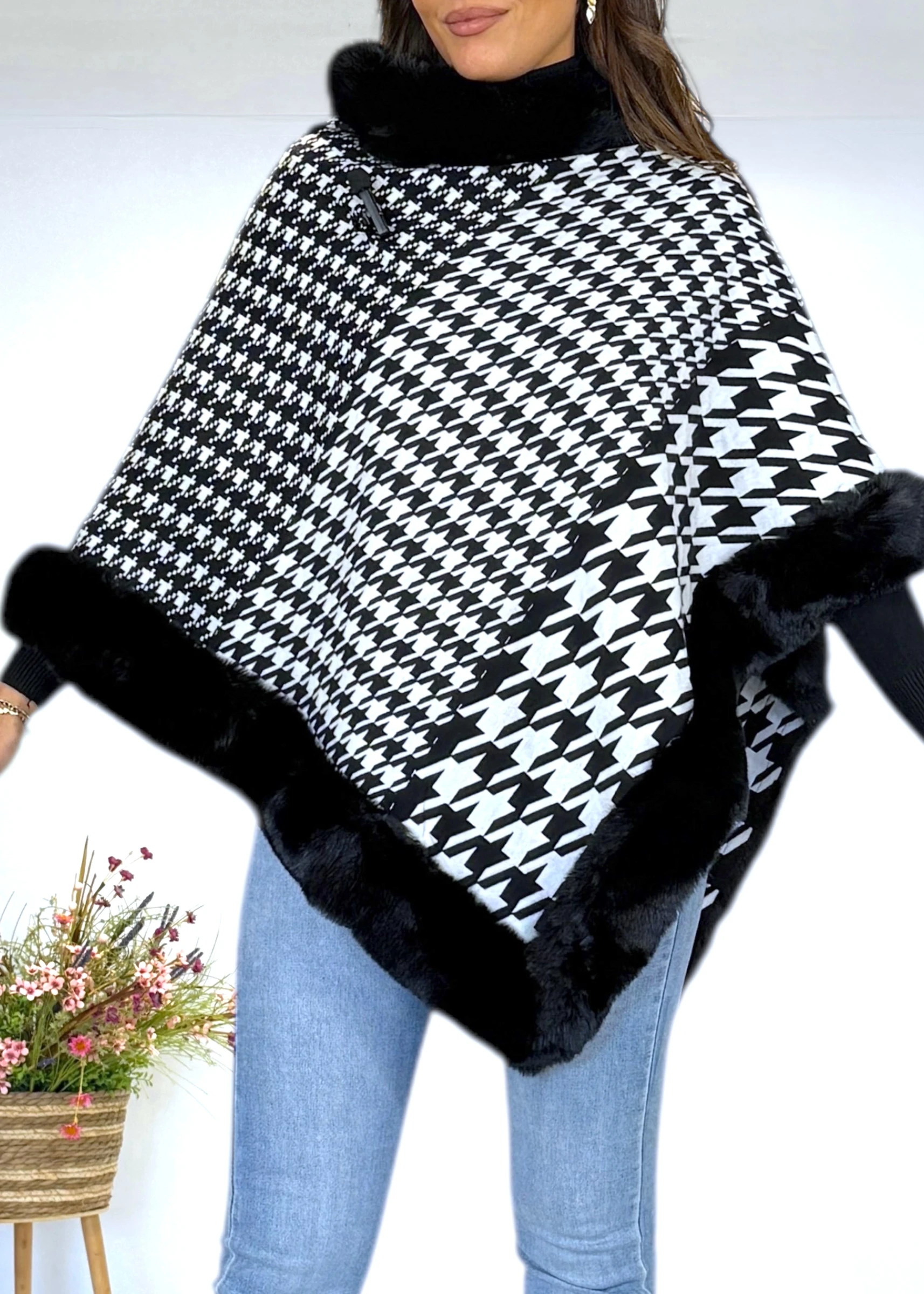 Capa en tonos blano y negro con ribete de pelo sintético a tono en cuello y bajo. Diseño amplio y envolvente, ideal para aportar calidez con estilo.