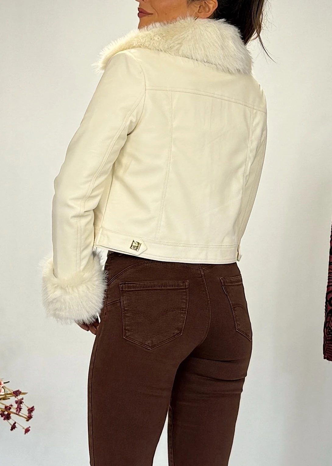 Cazadora efecto piel con cuello y puños de pelo desmontable. Interior forrado con pelito suave. Disponible de la talla 36 a la 42.
