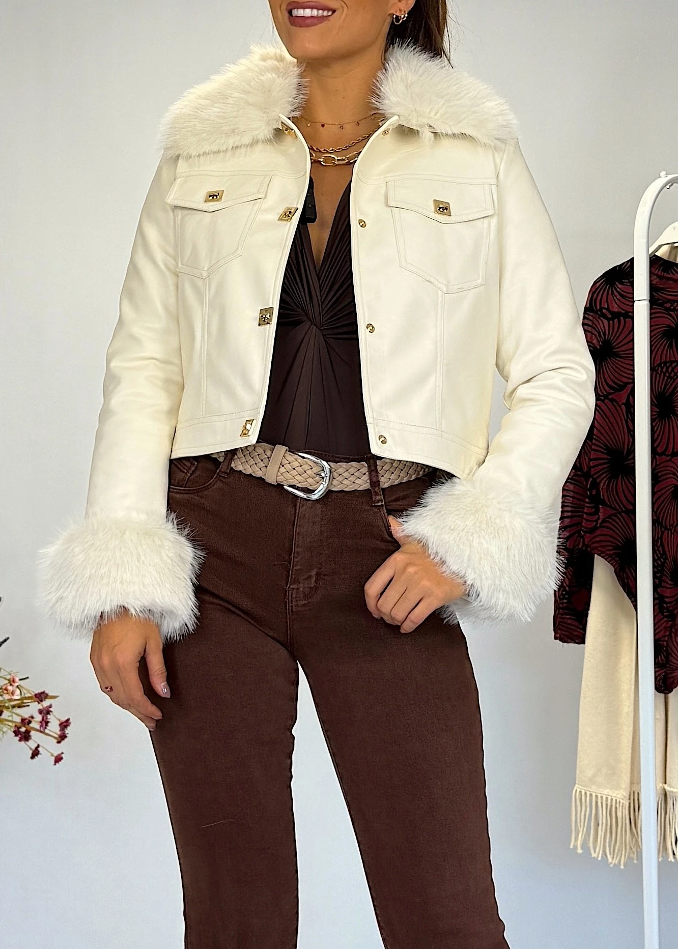 Cazadora efecto piel beige con cuello y puños de pelo sintético desmontable. Interior forrado con pelito suave que aporta confort en días fríos.