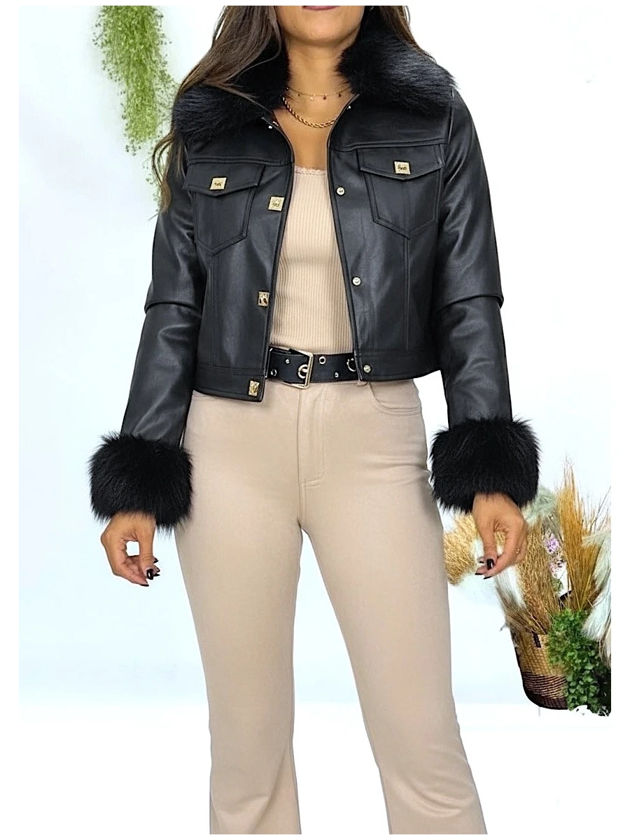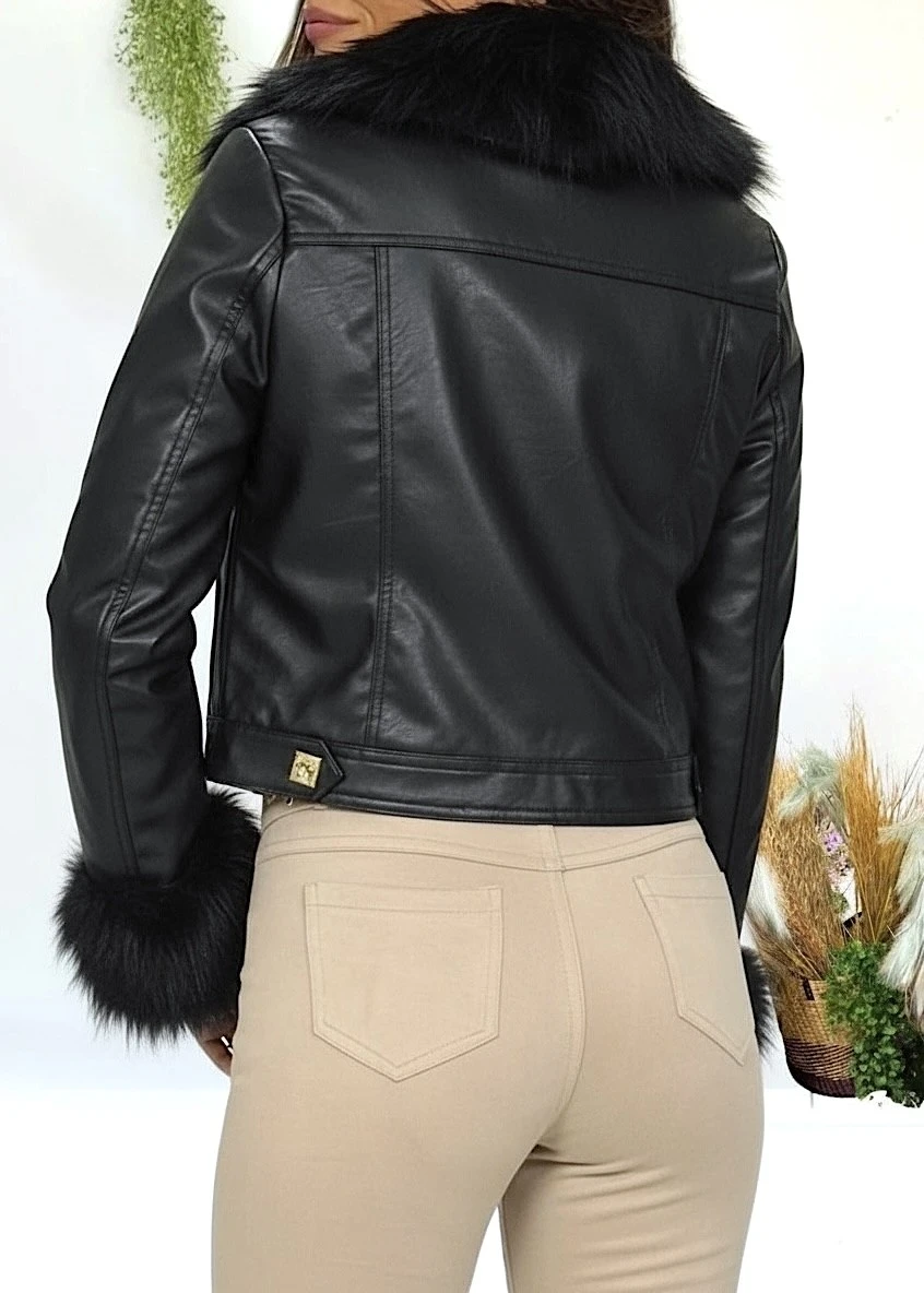 Cazadora efecto piel con cuello y puños de pelo desmontable. Interior forrado con pelito suave. Disponible de la talla 36 a la 42.