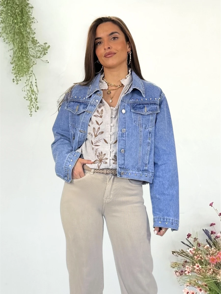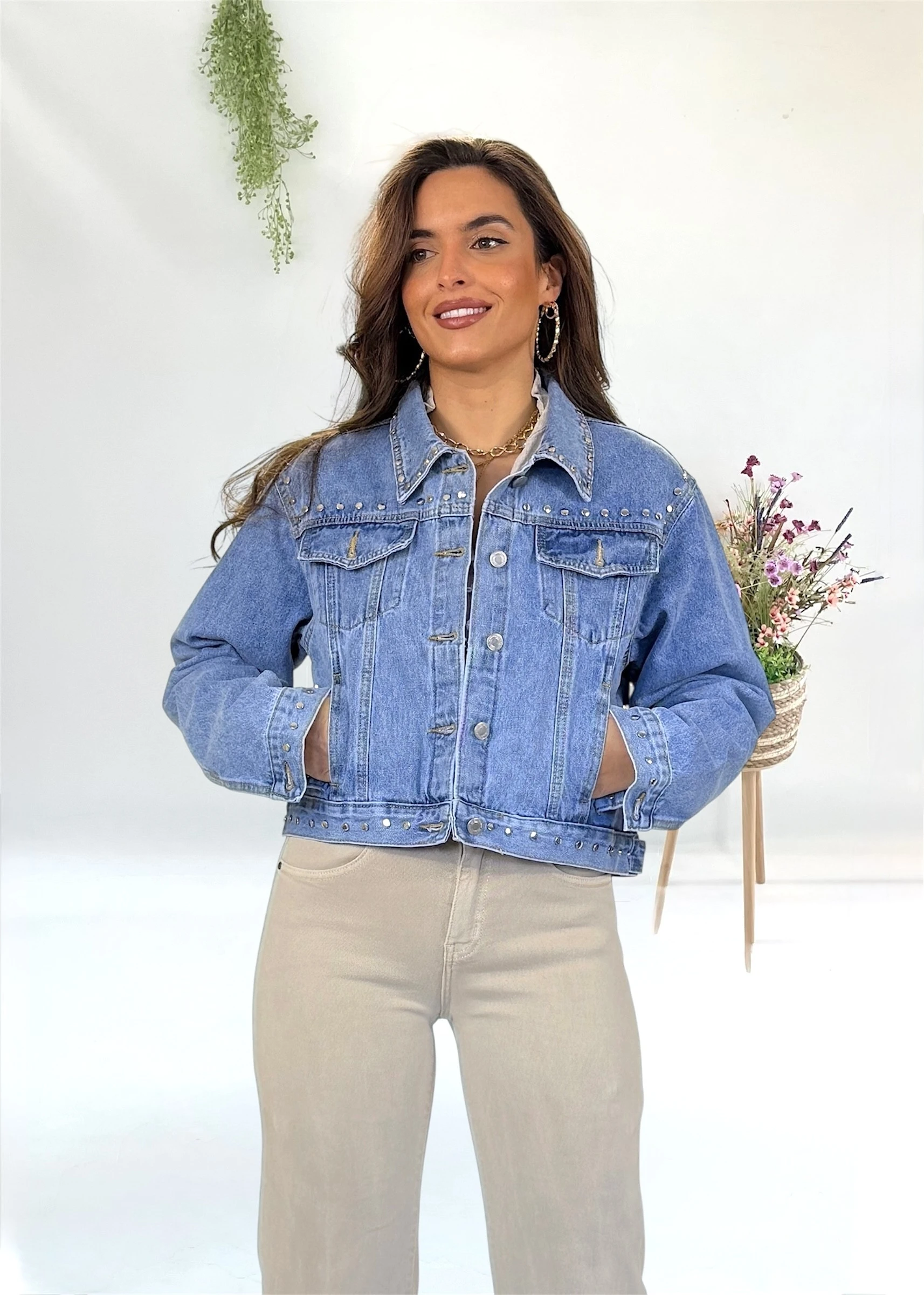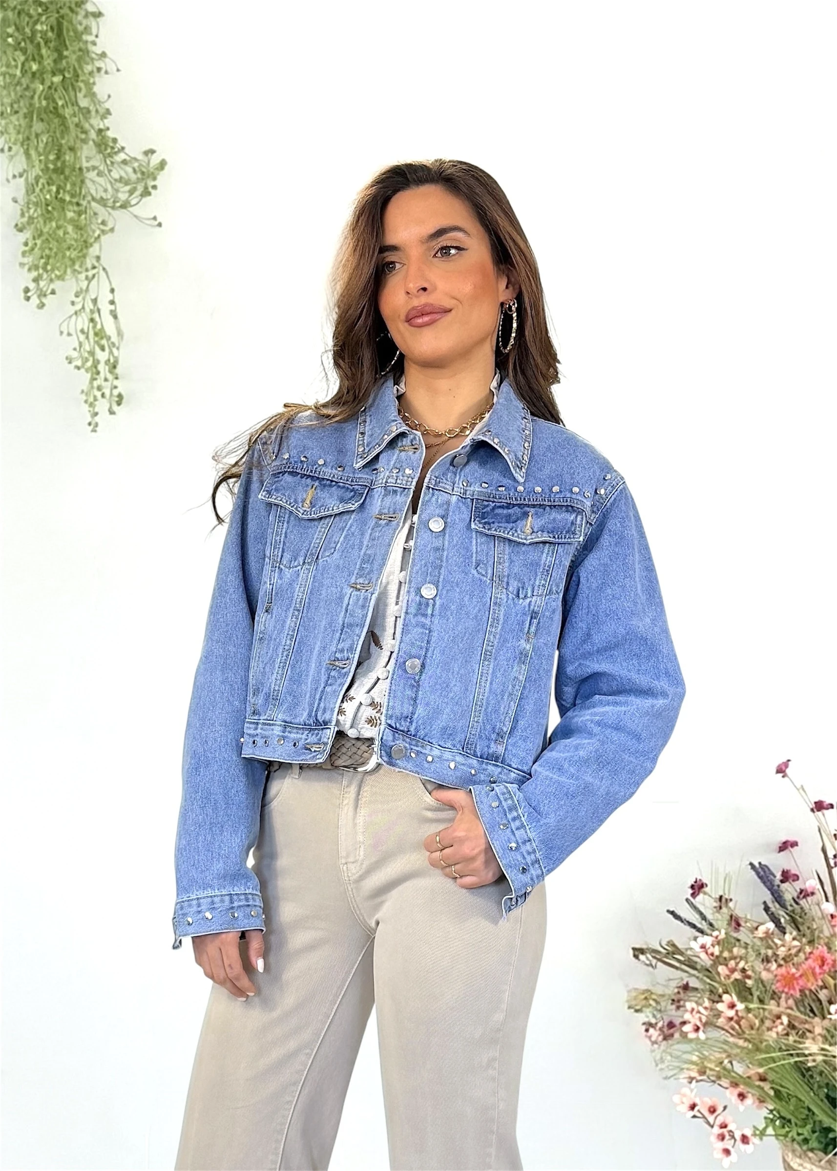 Cazadora vaquera con tachas metalizadas, una prenda versátil que reinventa el clásico denim con un aire actual y femenino.