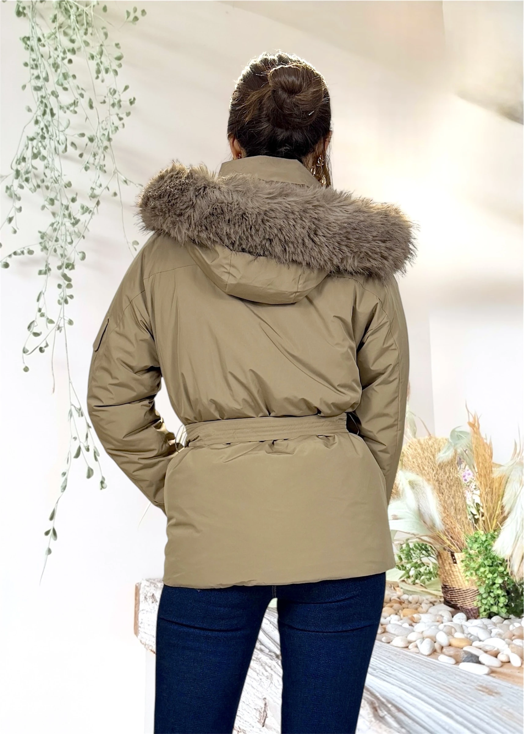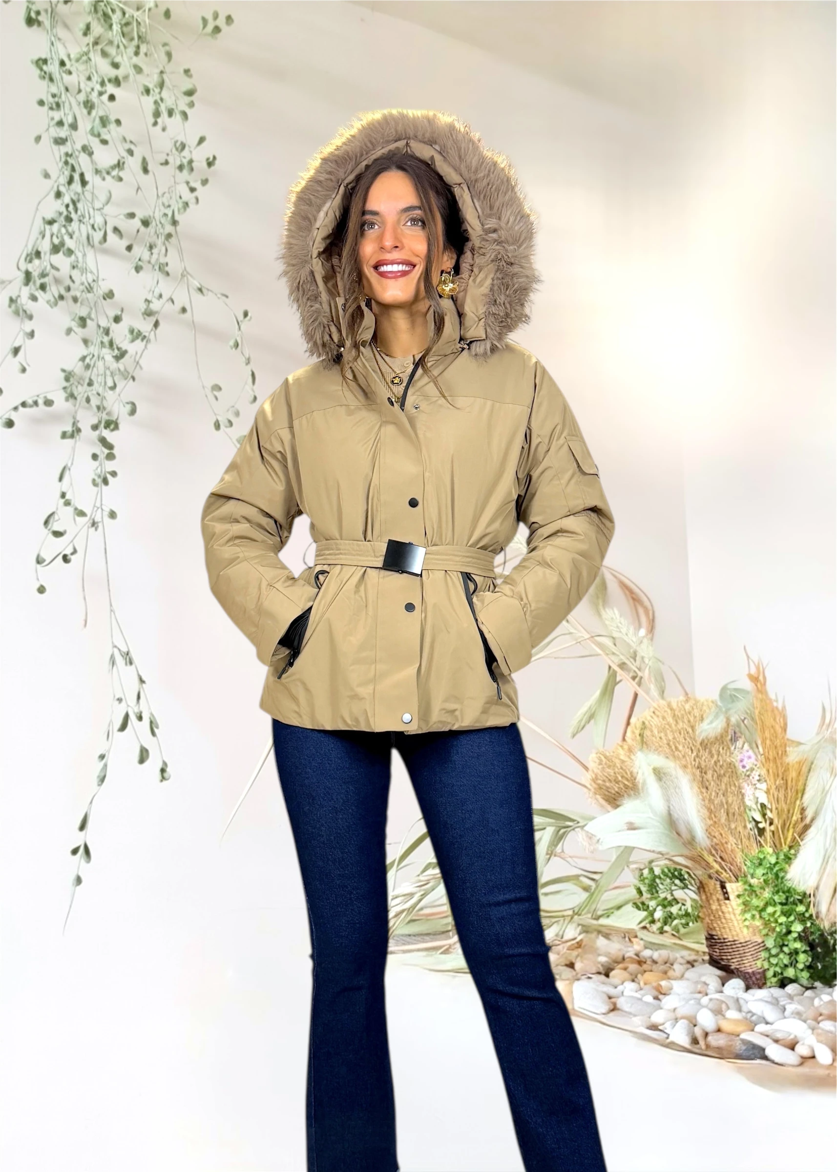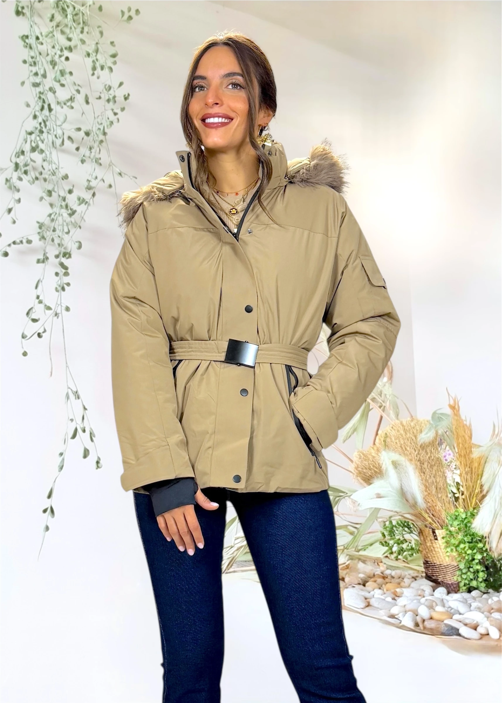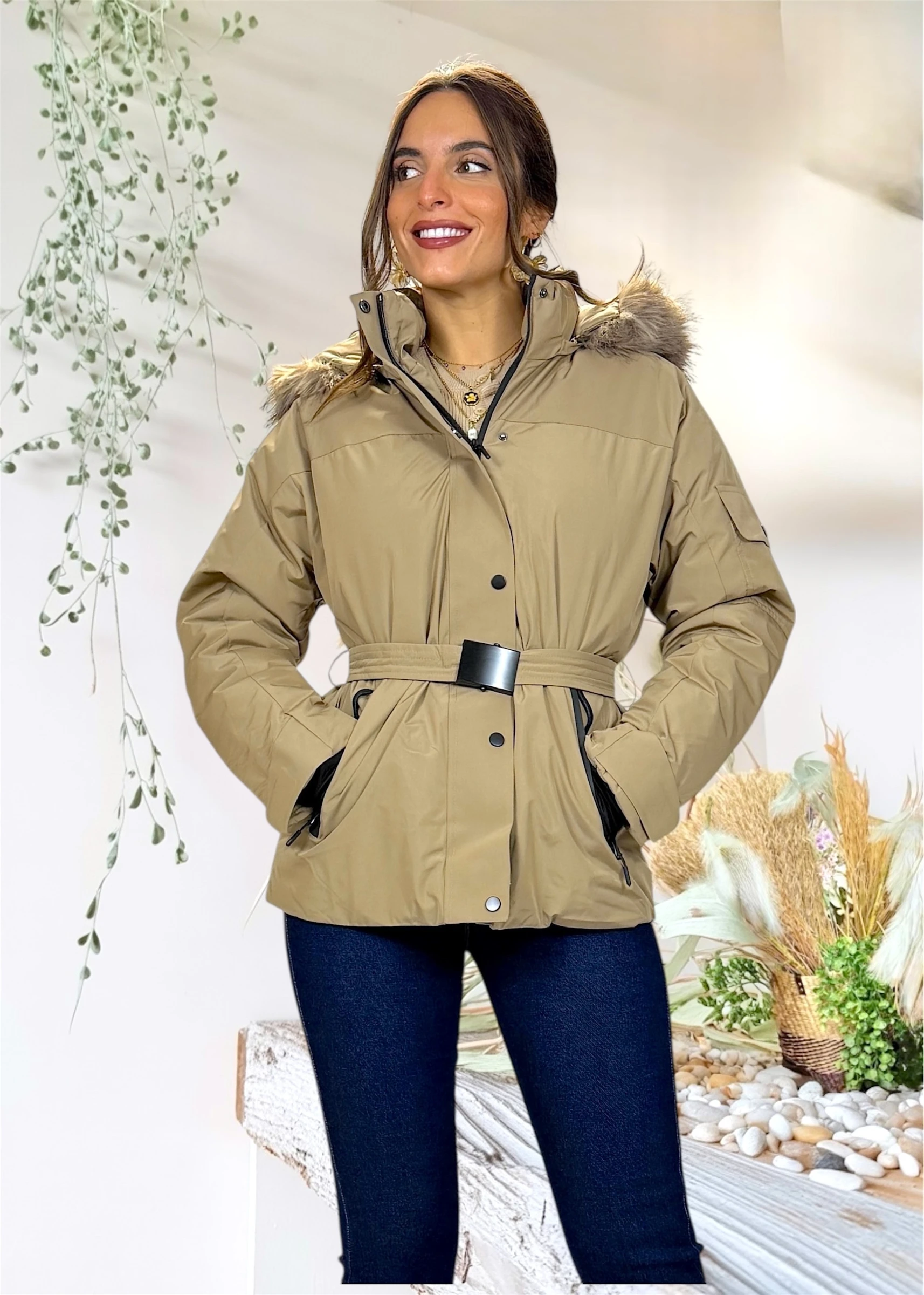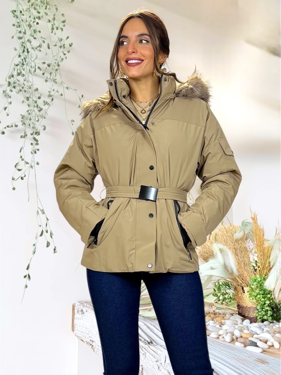 Incluye pelo desmontable en la capucha, cinturón ajustable para marcar la cintura y cierre frontal con cremallera y tapeta de botones. Los bolsillos laterales con cremallera negra aportan funcionalidad y un toque moderno al diseño.