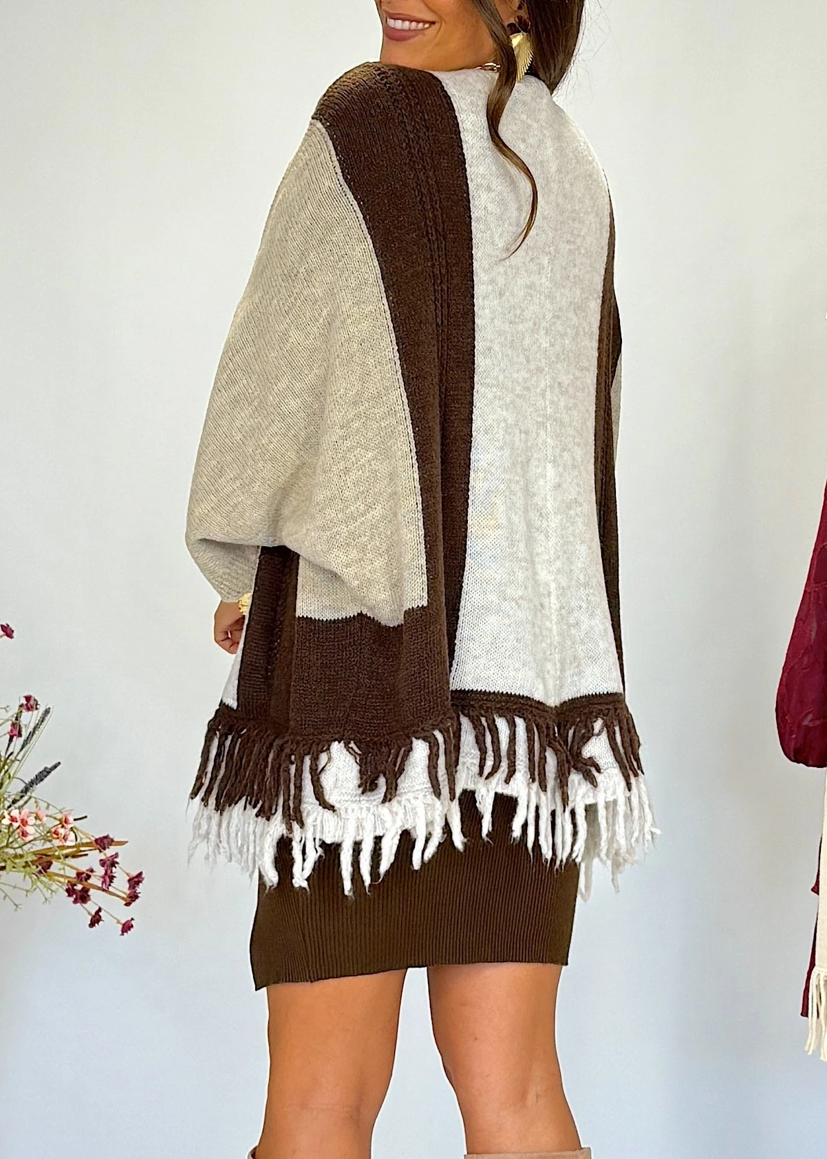 Poncho de punto en tonos tierra con flecos y corte holgado. Una prenda cálida y versátil que suma estilo a tus looks de otoño.
