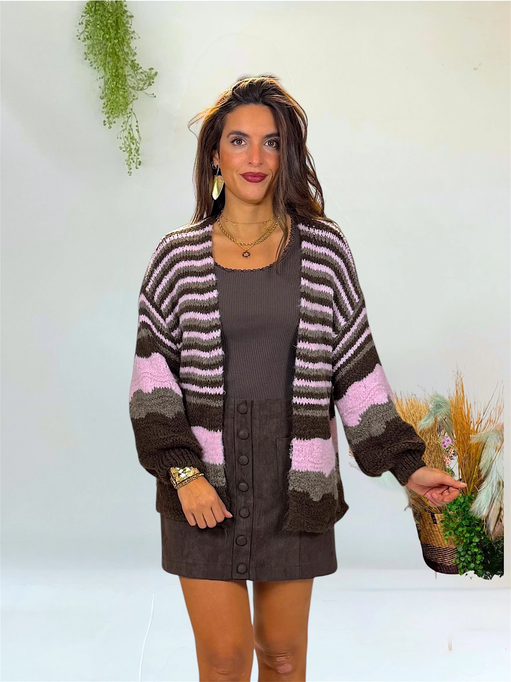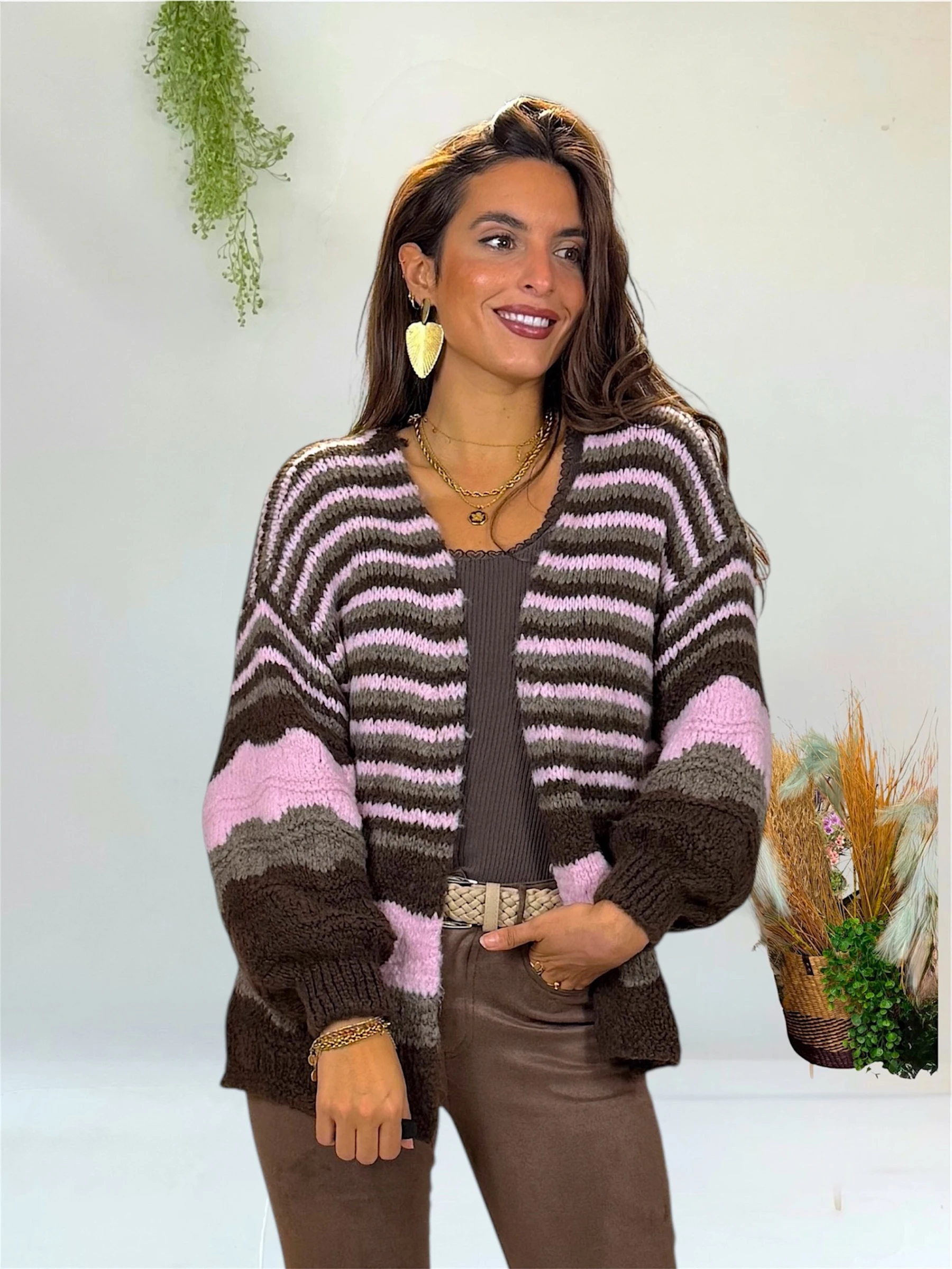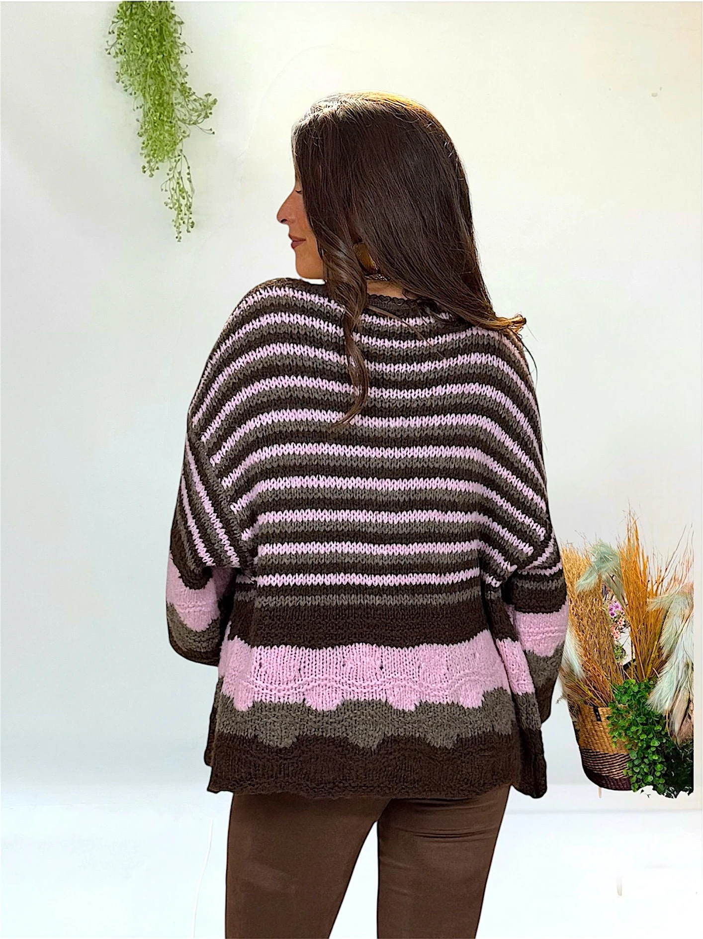 Chaqueta de punto suelta con rayas marrón y rosa. Mangas abullonadas y diseño cómodo con largo ideal de 67 cm.