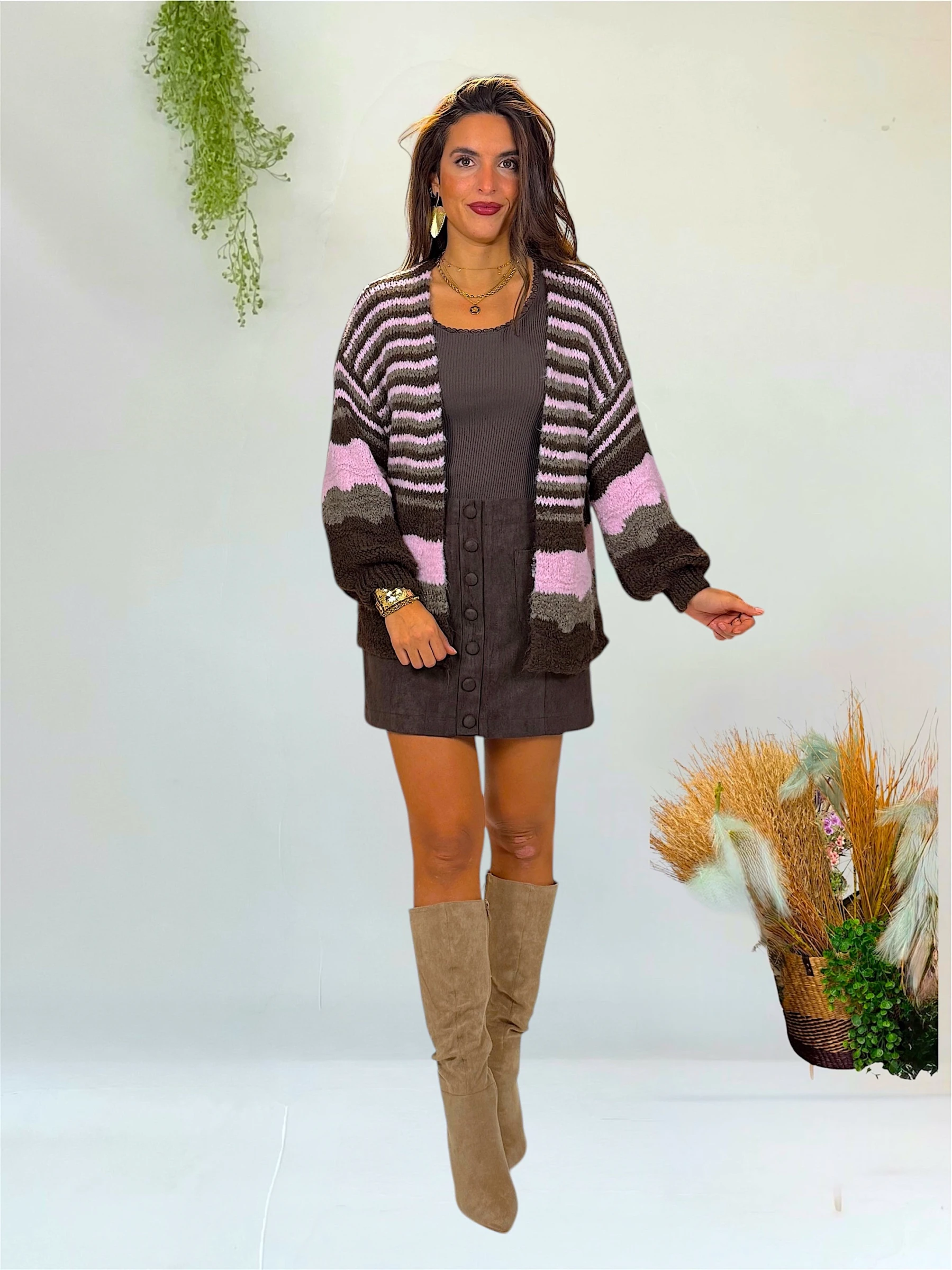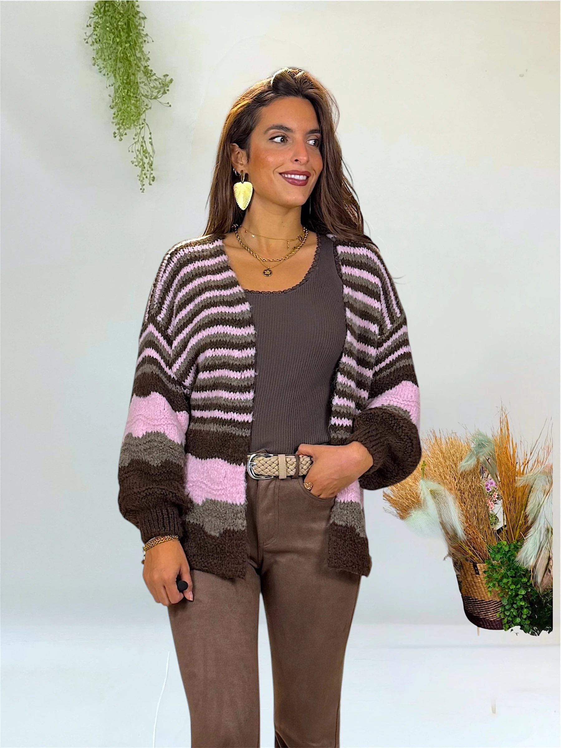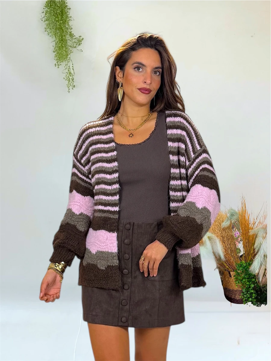 Chaqueta de punto suelta con rayas marrón y rosa. Mangas abullonadas y diseño cómodo con largo ideal de 67 cm.