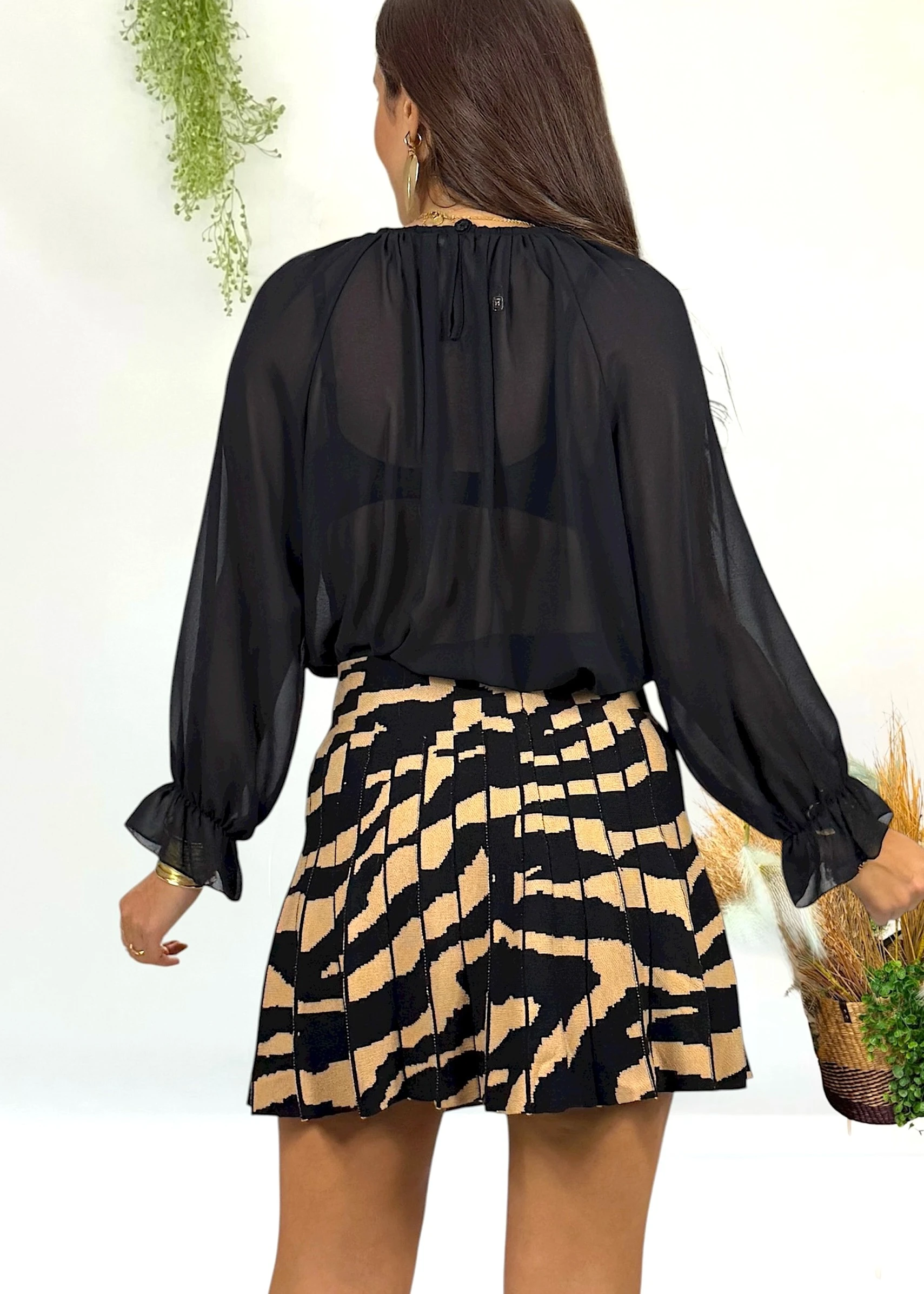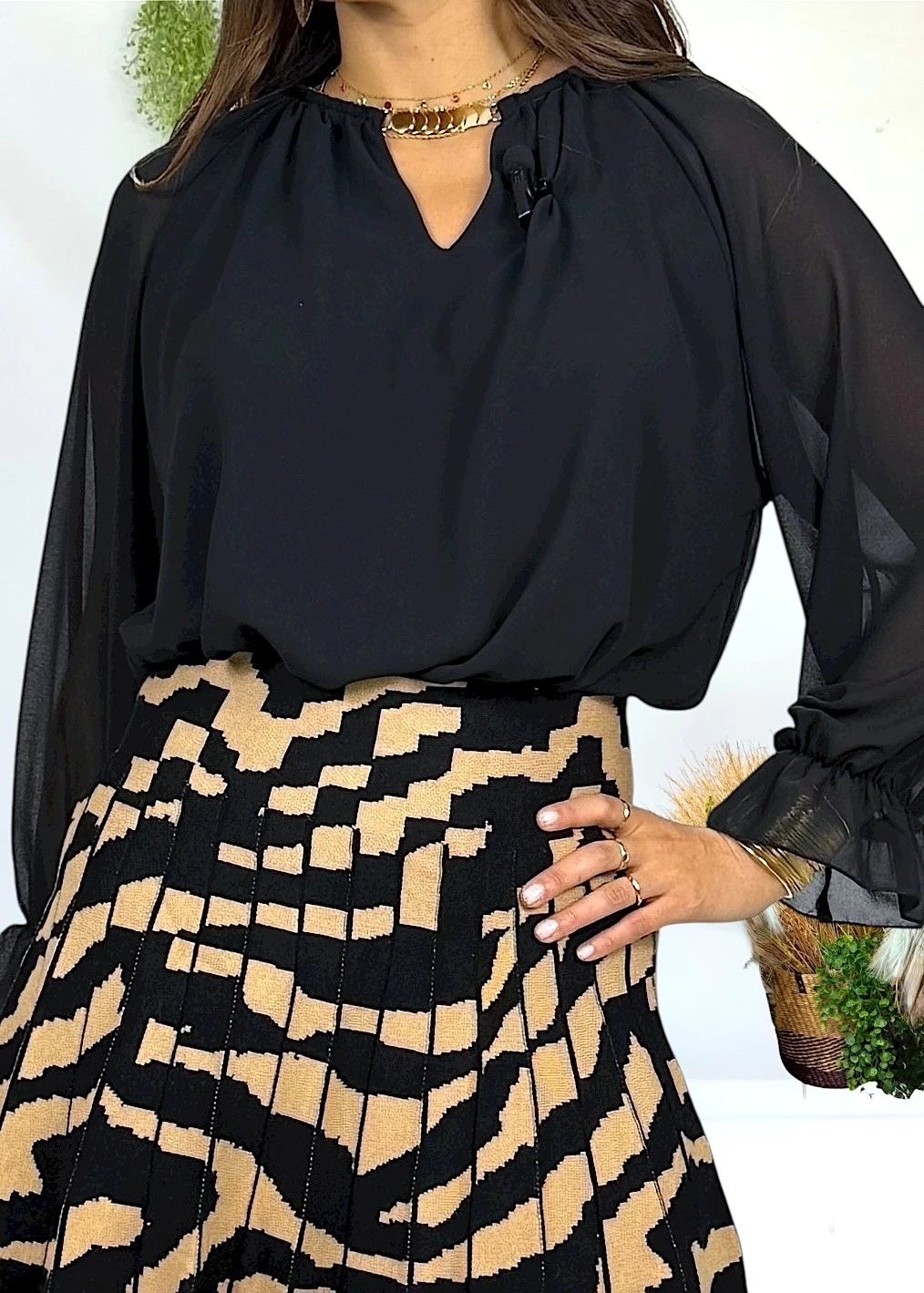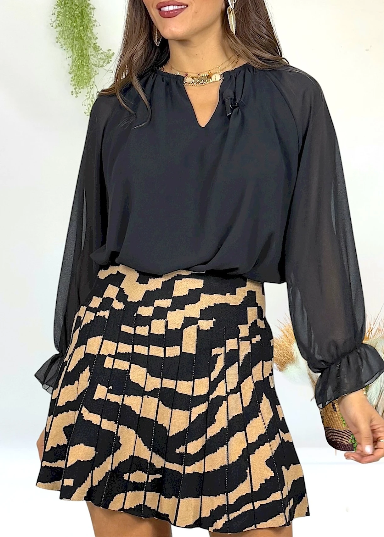Conjunto con blusa de gasa negra y cadena dorada en el cuello, y falda plisada en punto elástico con estampado camel y negro