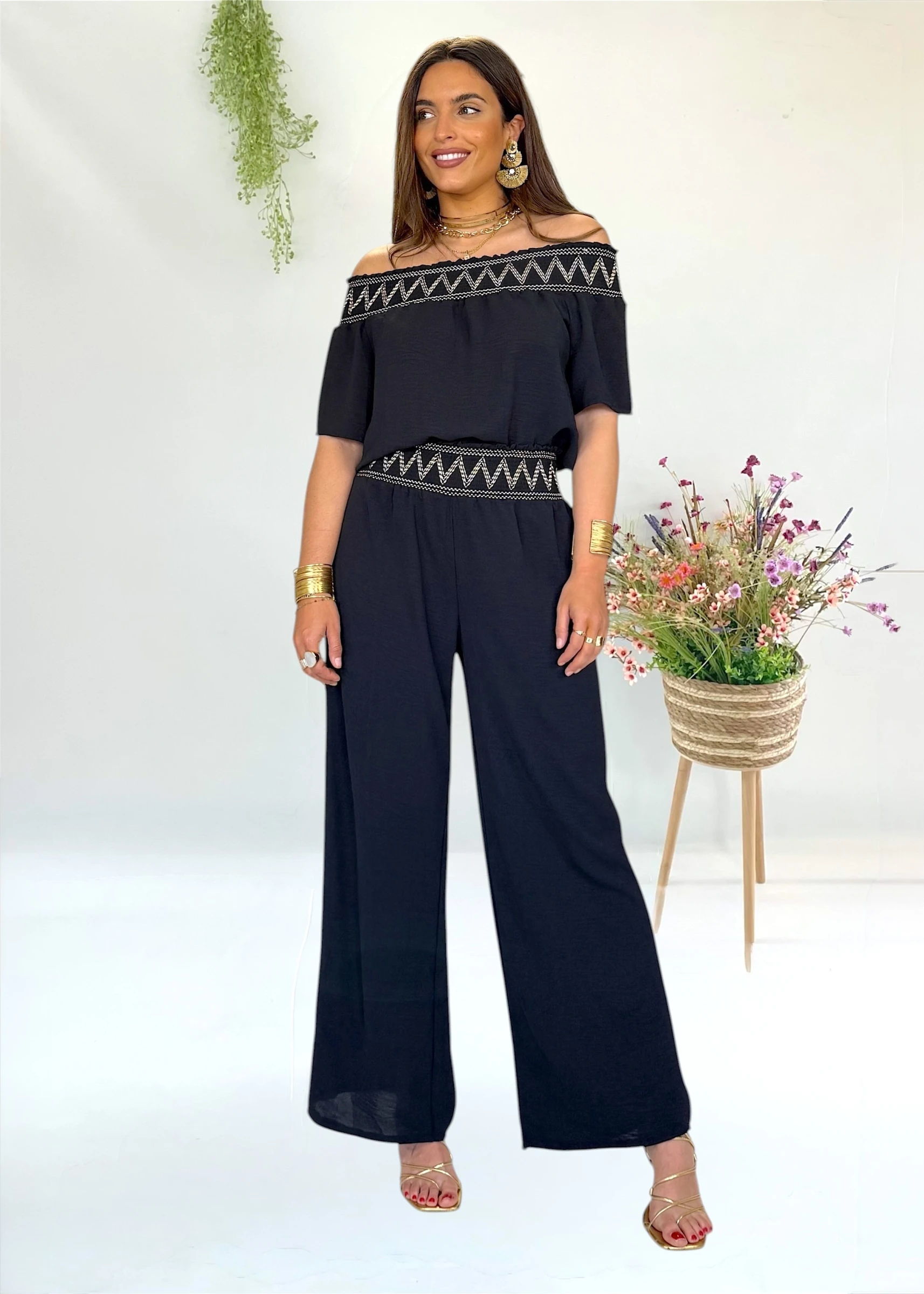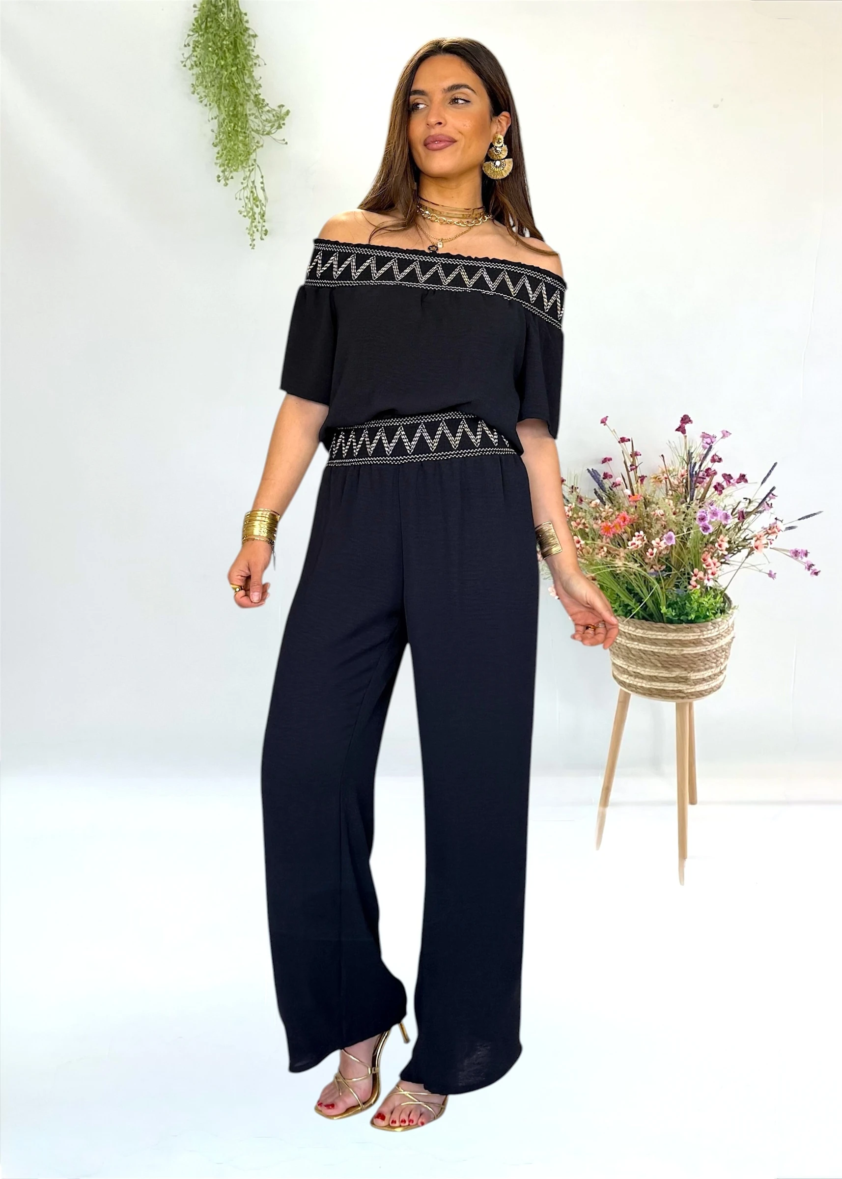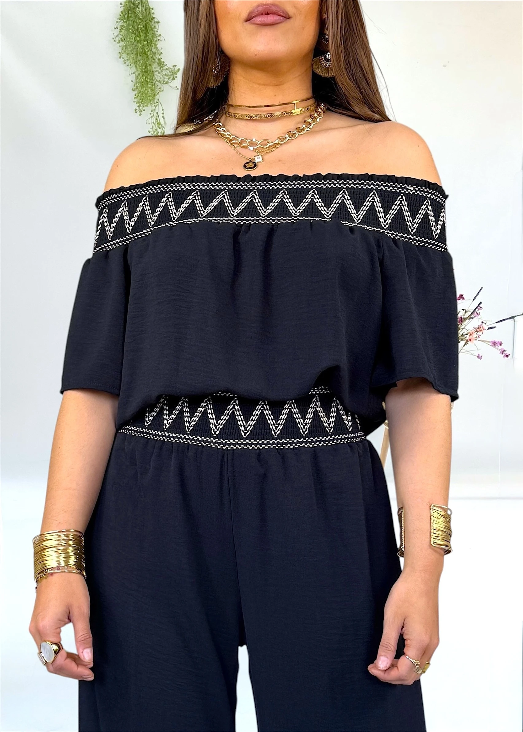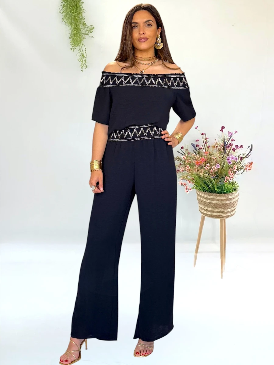 Conjunto negro con bordados en beige dorado y escote bardot. Elegante y veratil, para que lo puedas llevar en distintas ocasiones