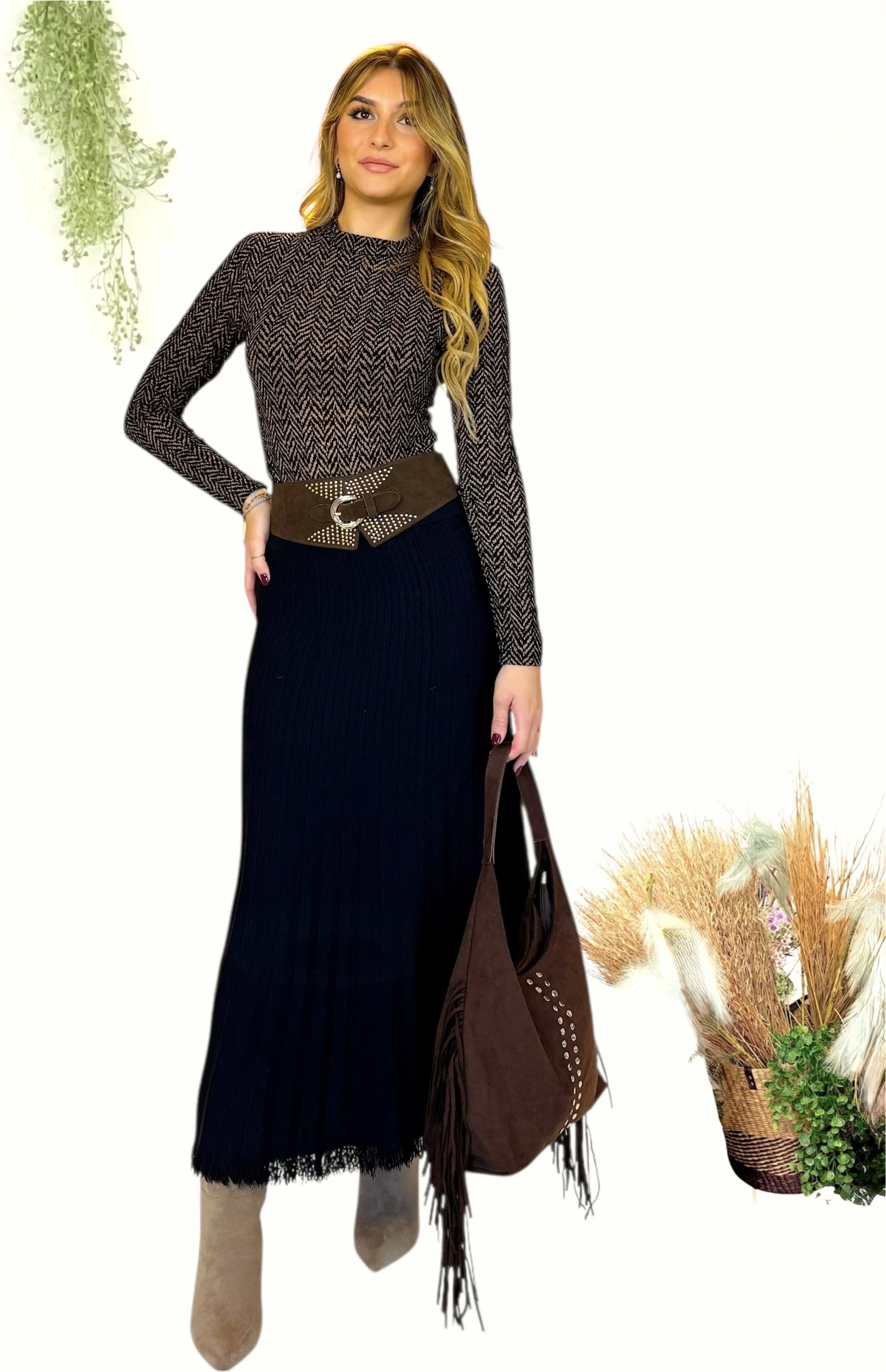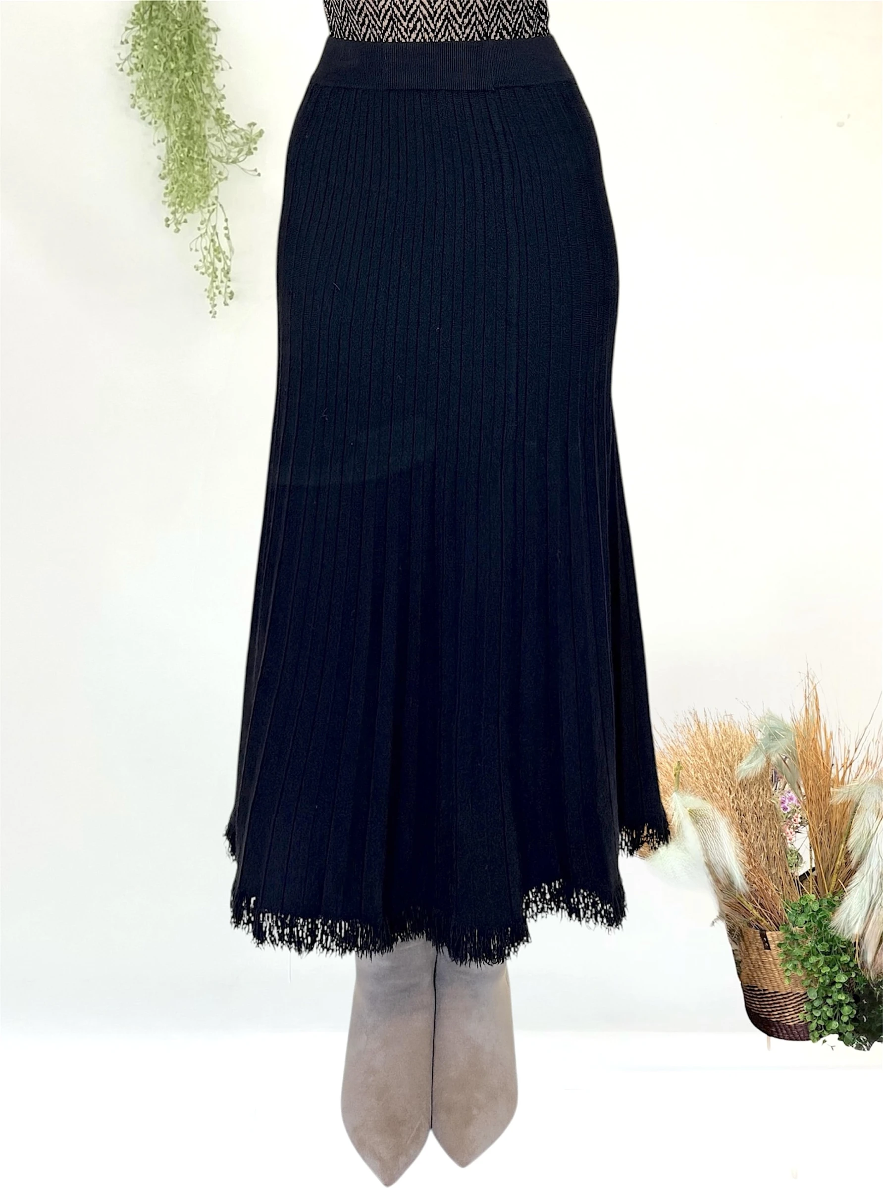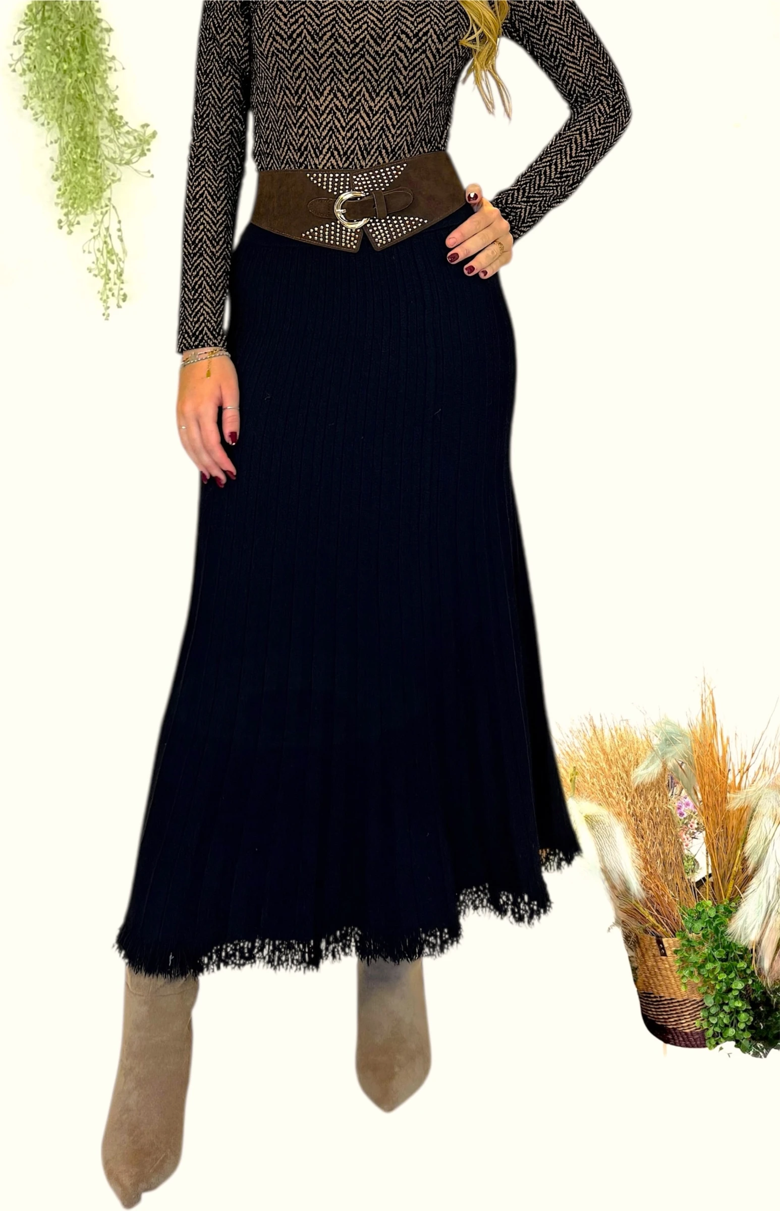 Falda de punto grueso negro con silueta ligeramente plisada, pensada para ofrecer estilo sin renunciar a la comodidad.