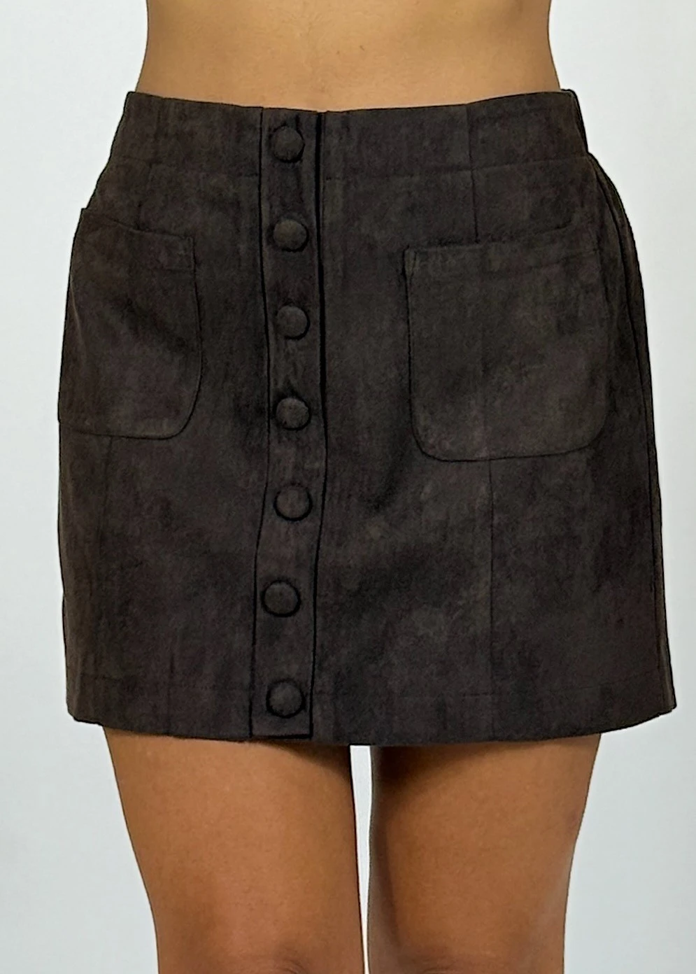 Falda de antelina marrón, forrada y con cintura elástica trasera. Suave, estructurada y cómoda, con bolsillos y falsos botones al frente.