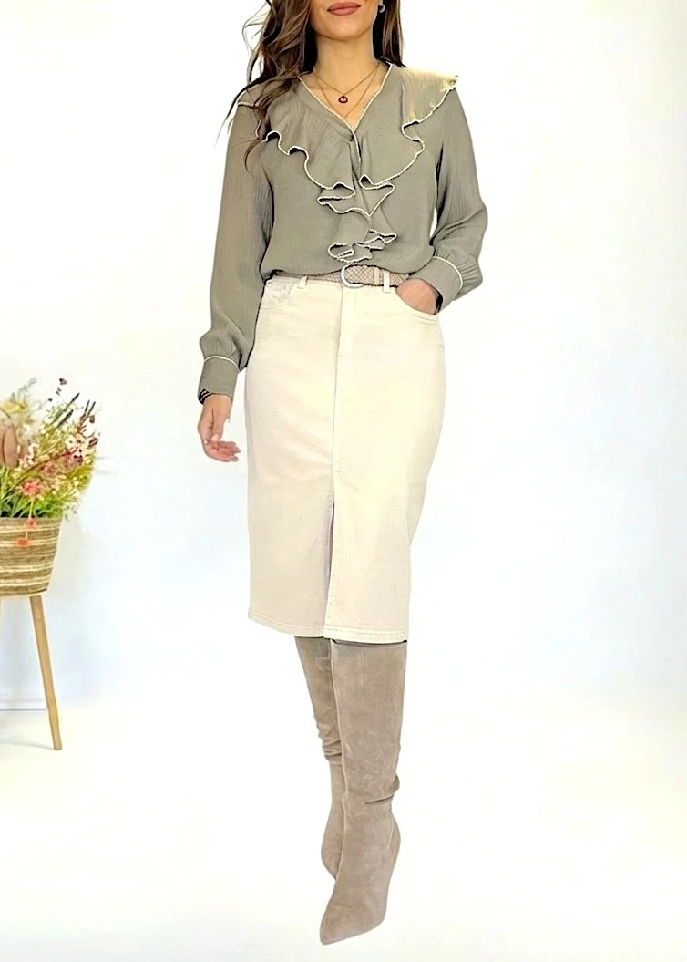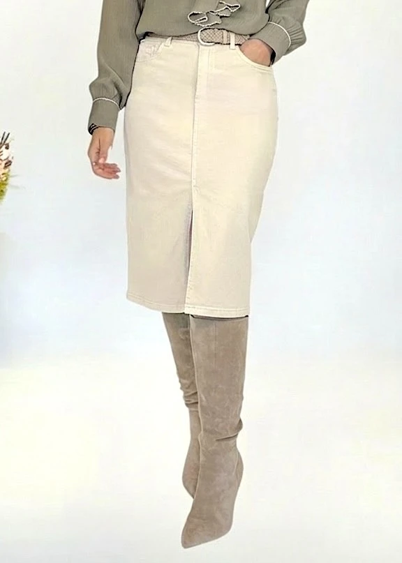 Falda vaquera midi en color beige claro, con diseño ajustado que realza la figura. Tejido elástico para una mayor comodidad y adaptabilidad. Largo por debajo de la rodilla, ideal para looks sofisticados y urbanos.