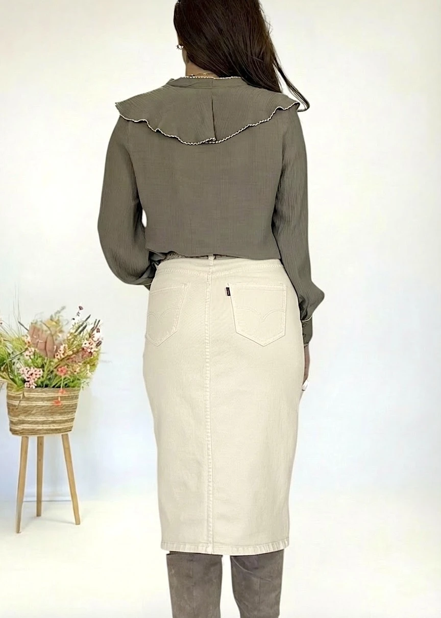 Falda vaquera midi en color beige claro. Corte ajustado con tejido elástico. Disponible en tallas XS-S-M-L-XL