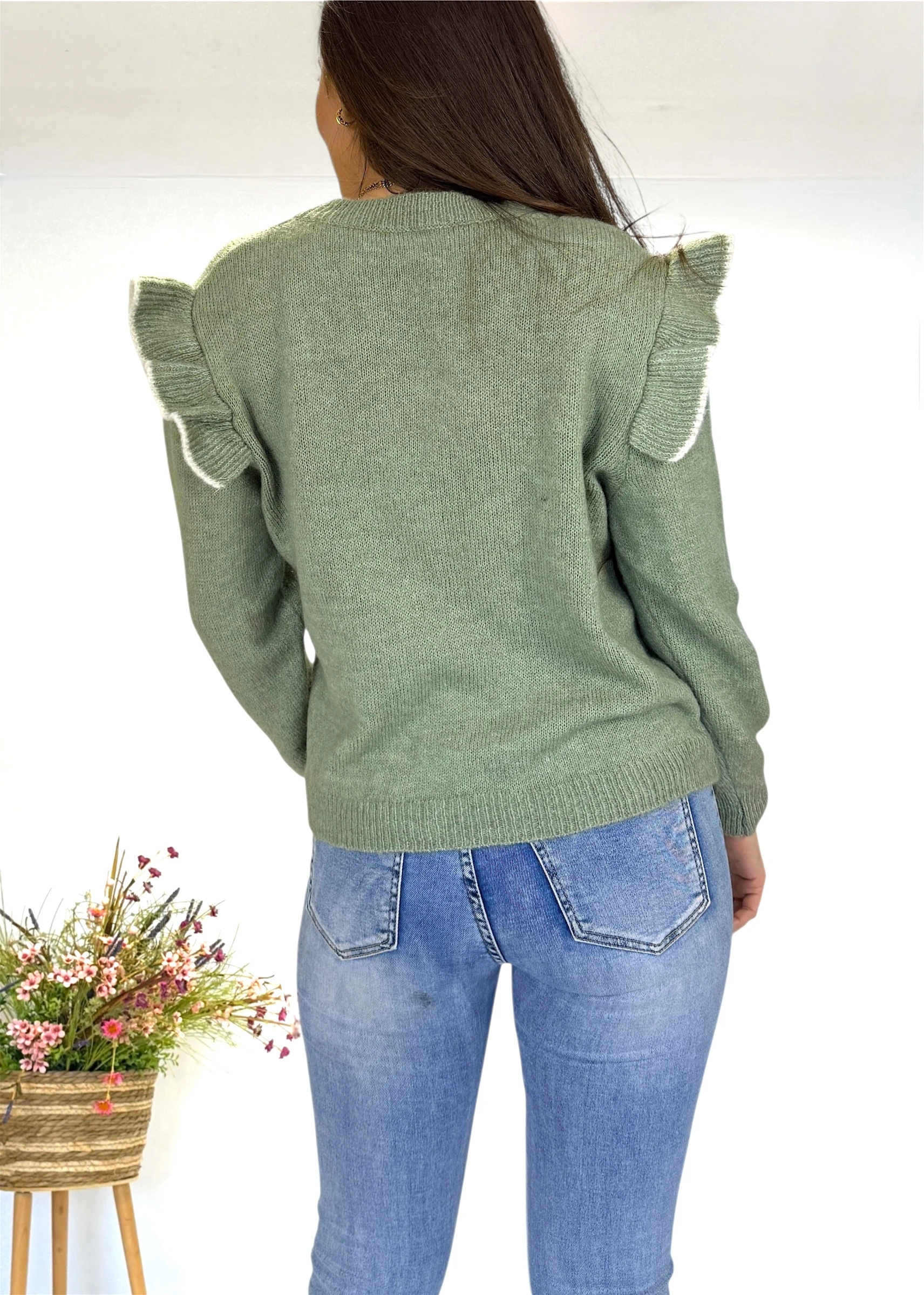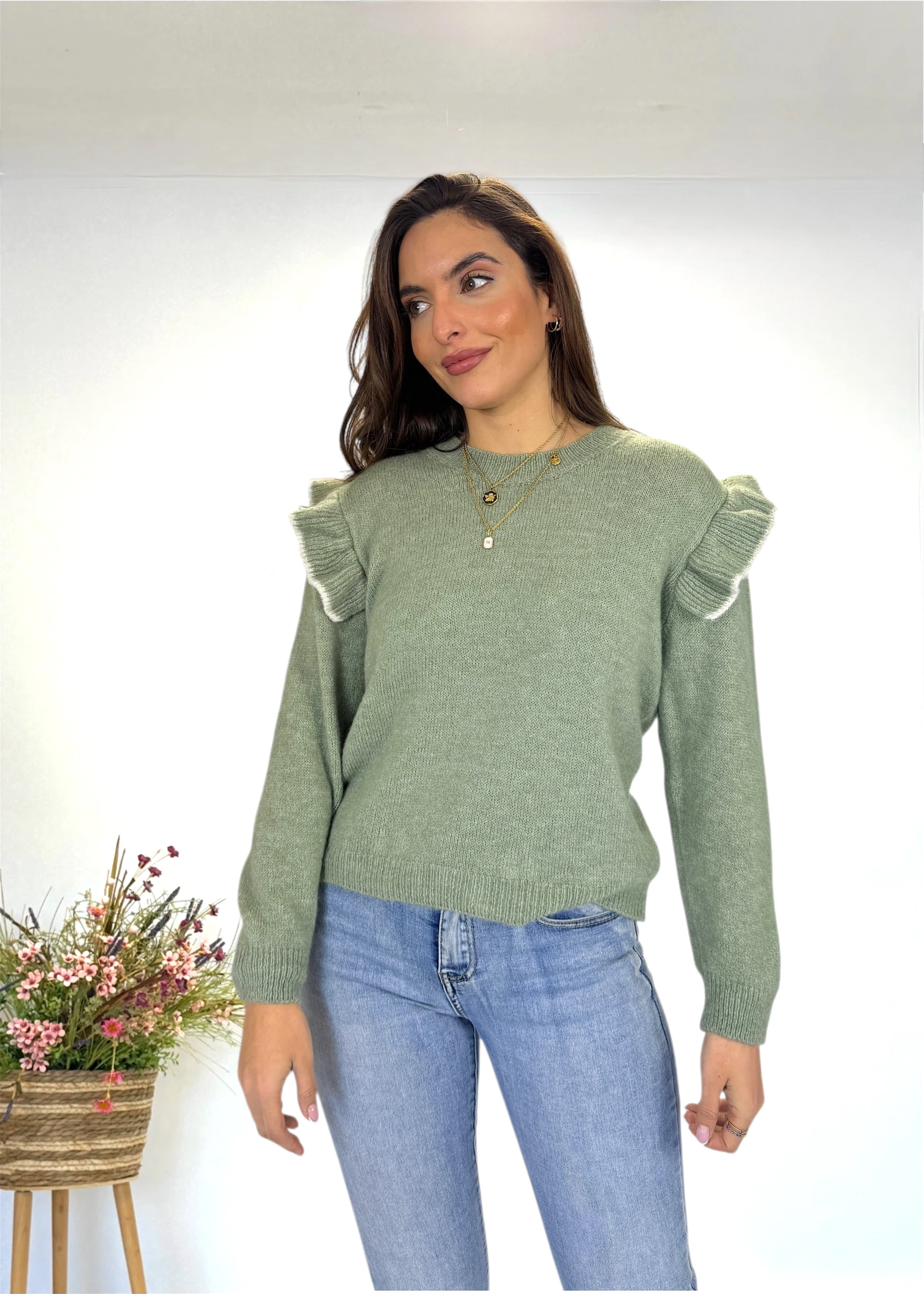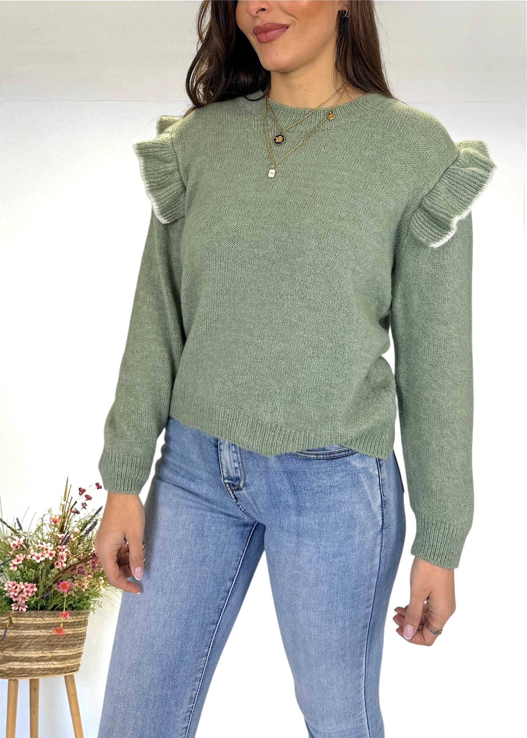 Jersey verde decorado con delicados volantes en los hombros, rematados con un fino ribete crudo que aporta un toque romántico y femenino. Su patrón recto y cómodo lo convierte en una prenda ideal para el día a día.
