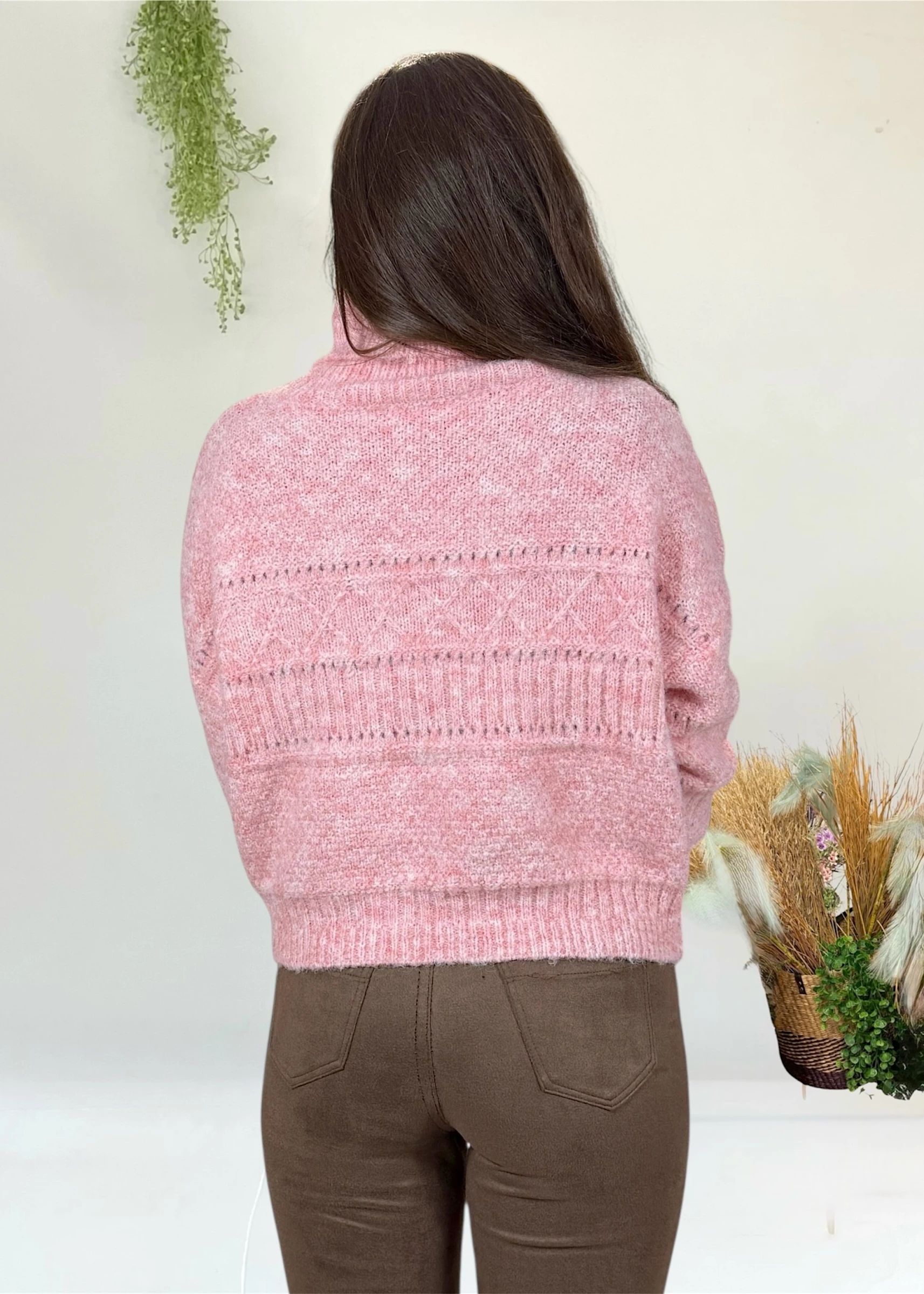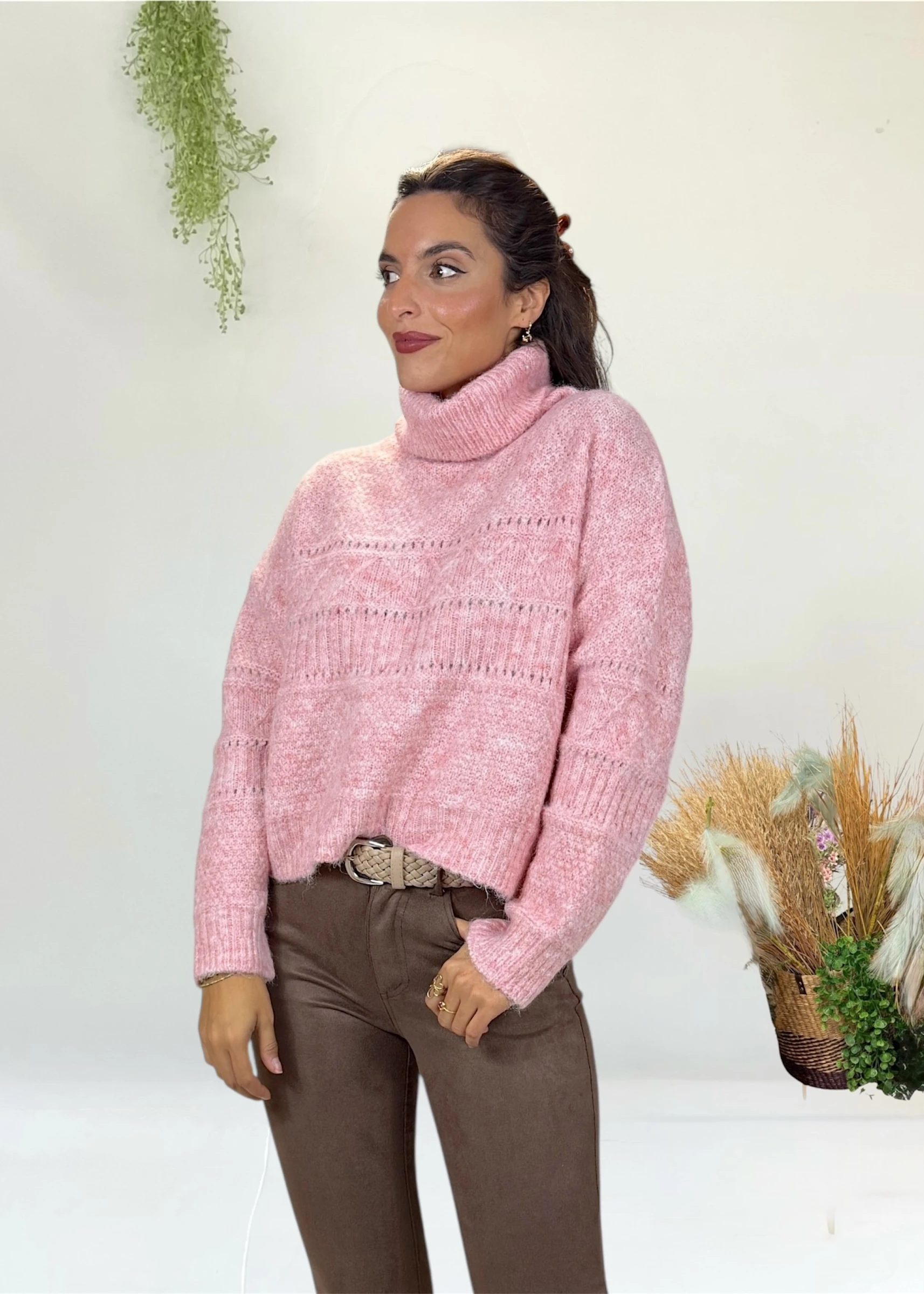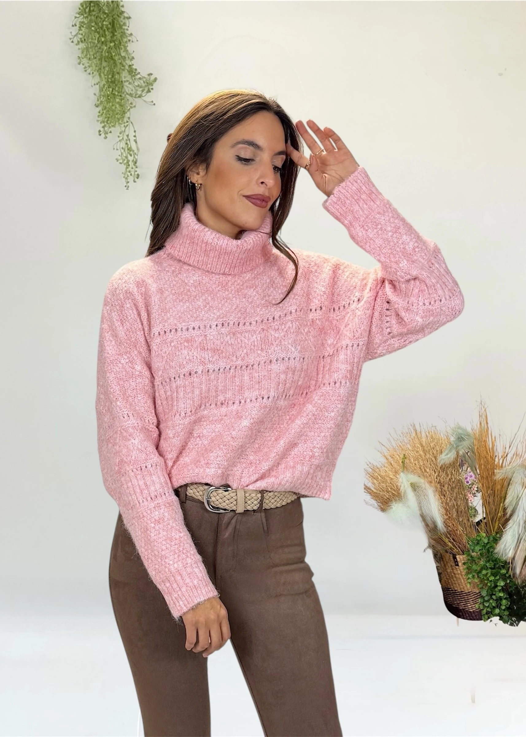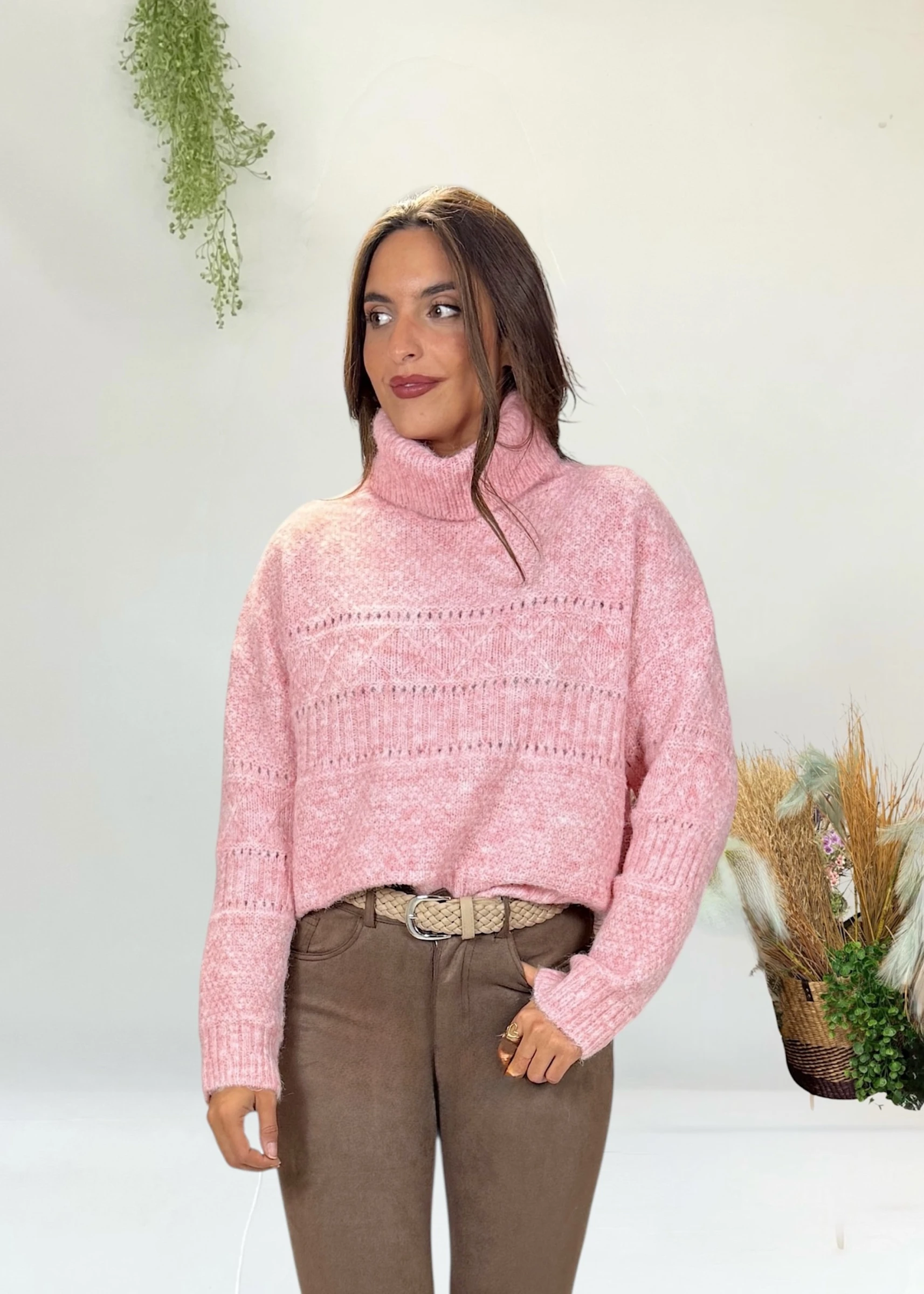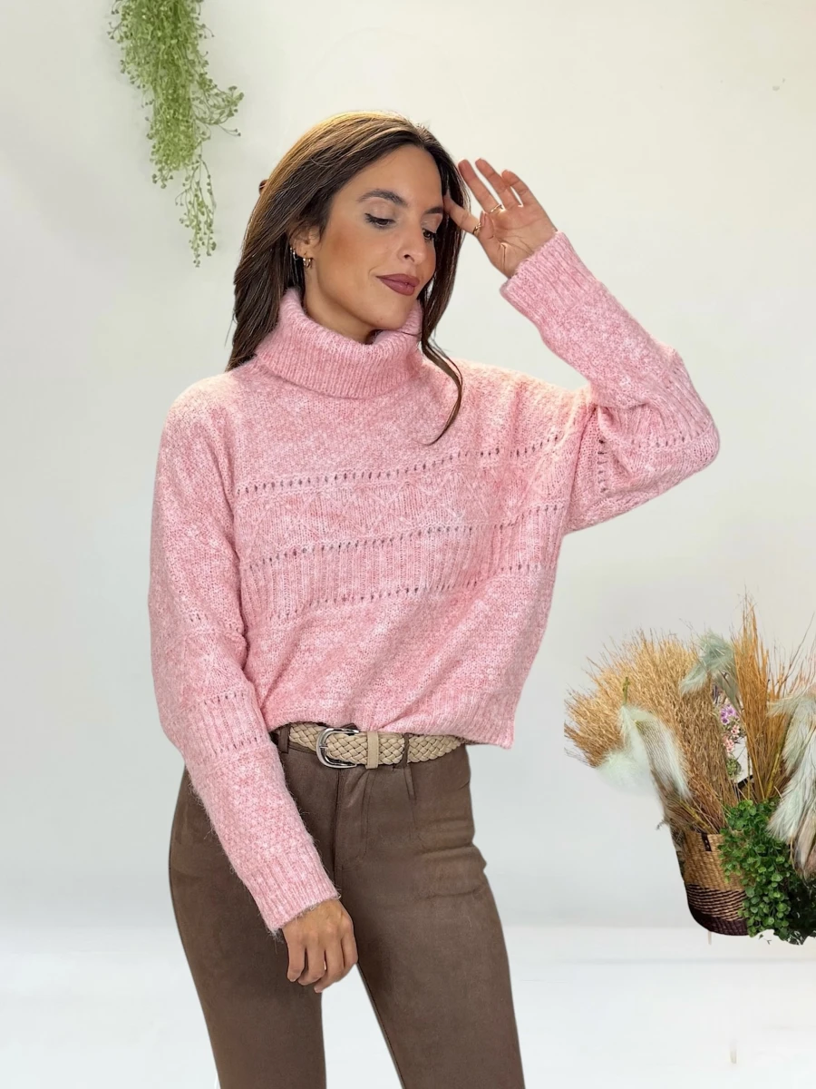 Jersey oversize rosa con cuello alto holgado y textura ultrasuave, ideal para sumar un toque cálido y moderno a tus looks de temporada.
