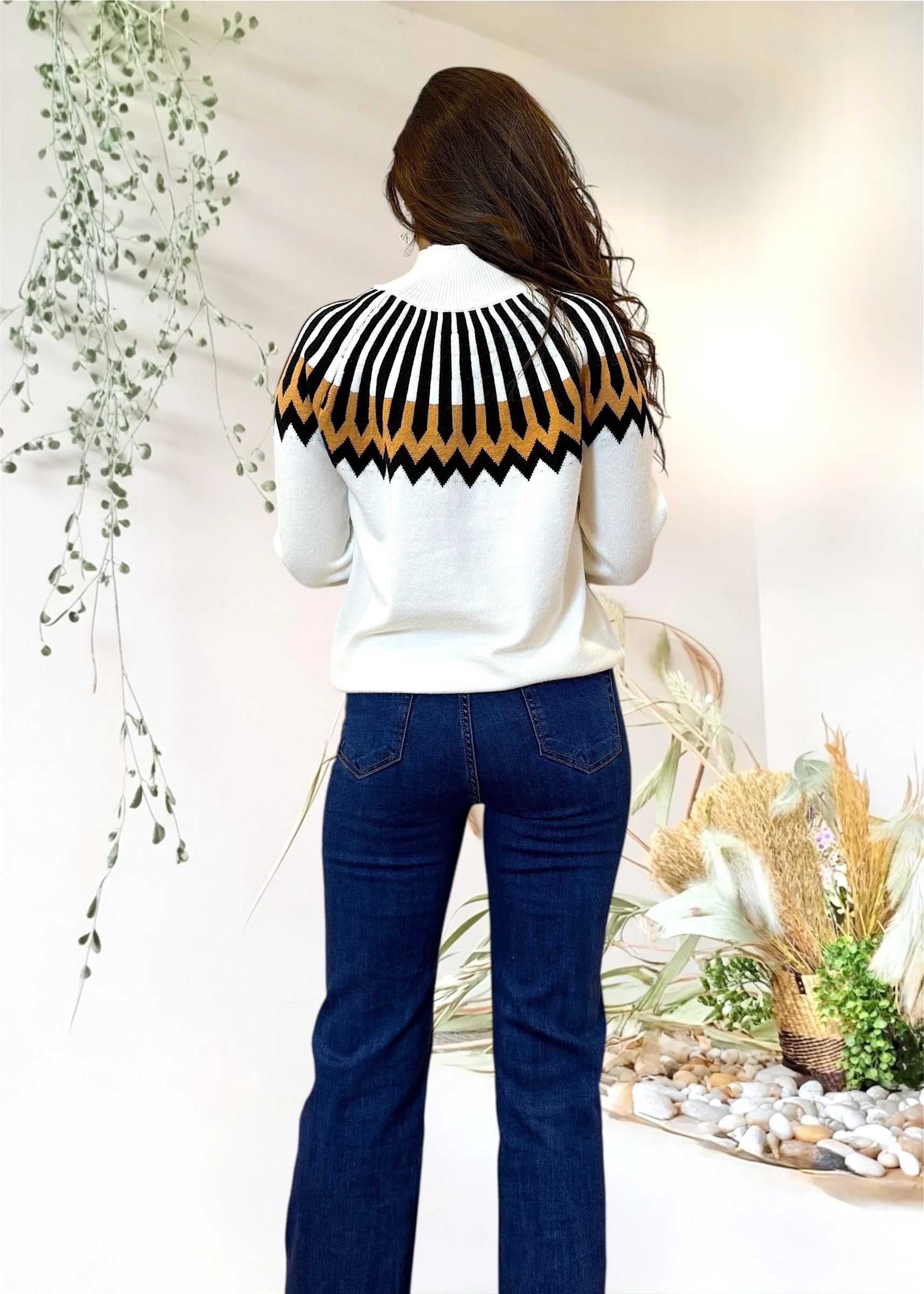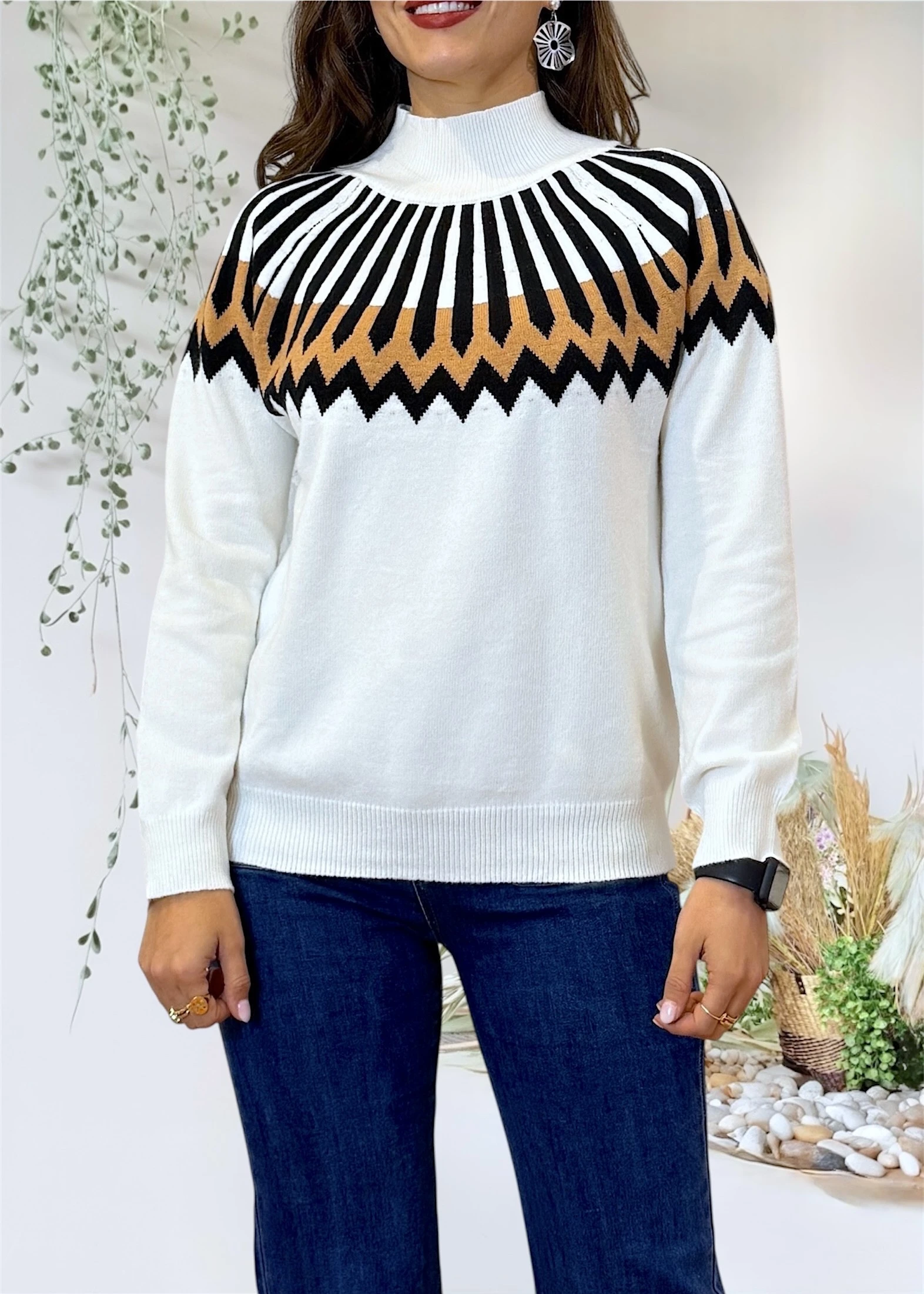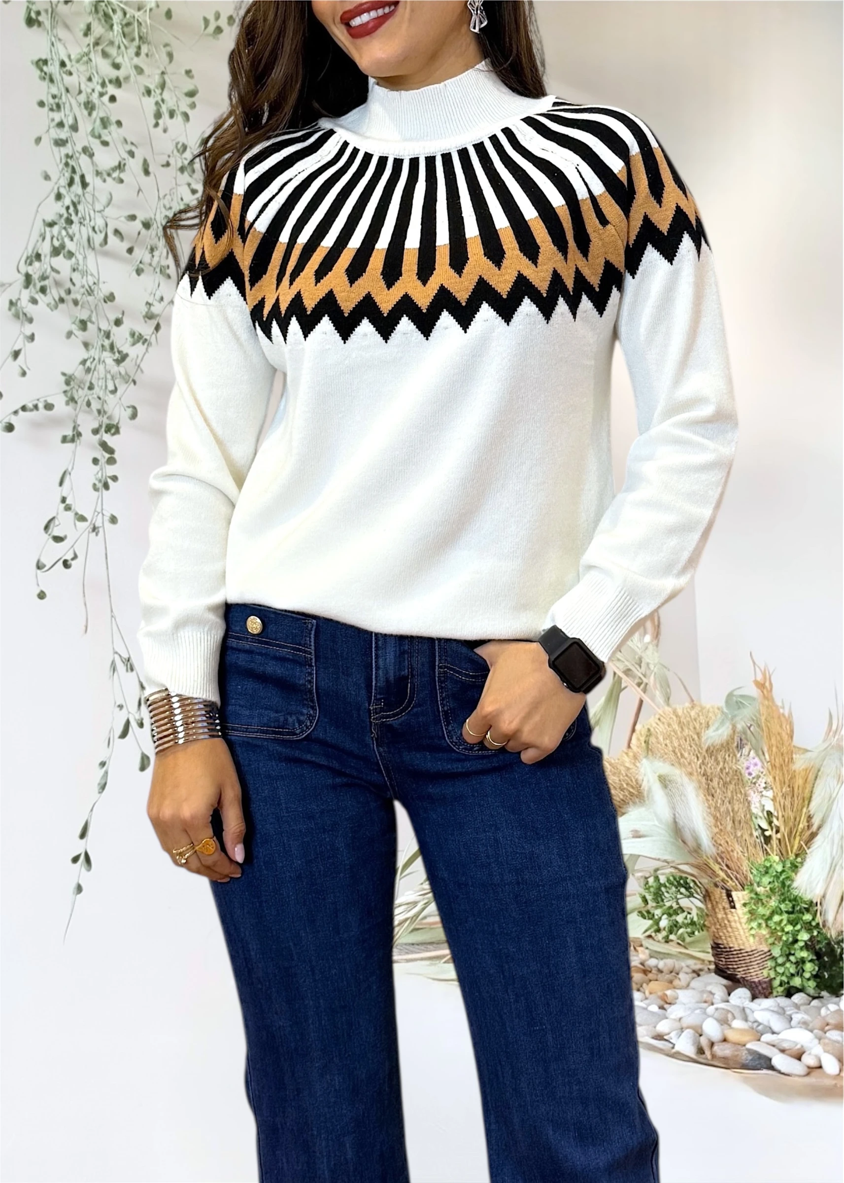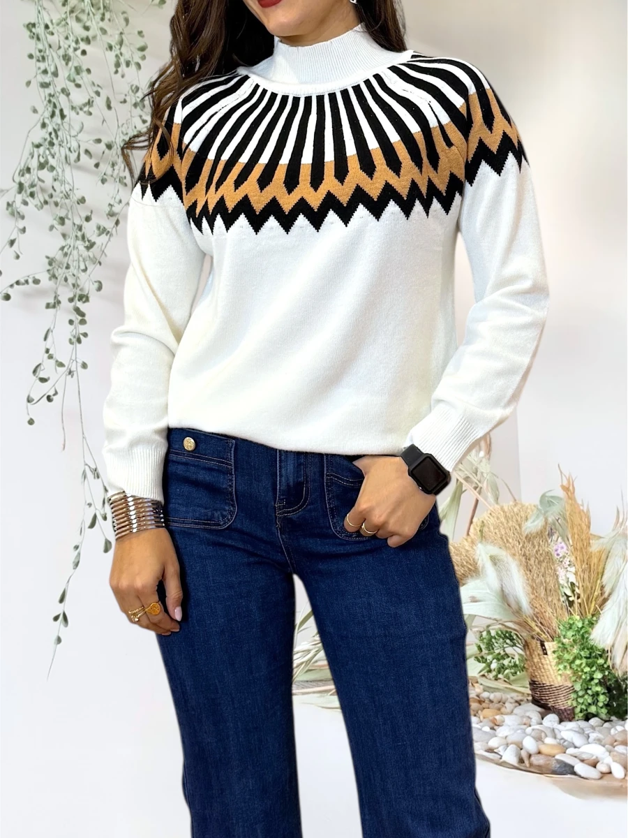 Jersey de punto en color blanco con cenefas geométricas en negro y camel, diseñado para combinar comodidad y diseño gráfico con un ajuste fluido.